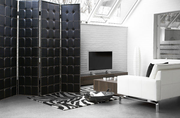 Vendor:Benzara2 Panel Room Divider with Leatherette Interwoven Square Cut Outs, Black