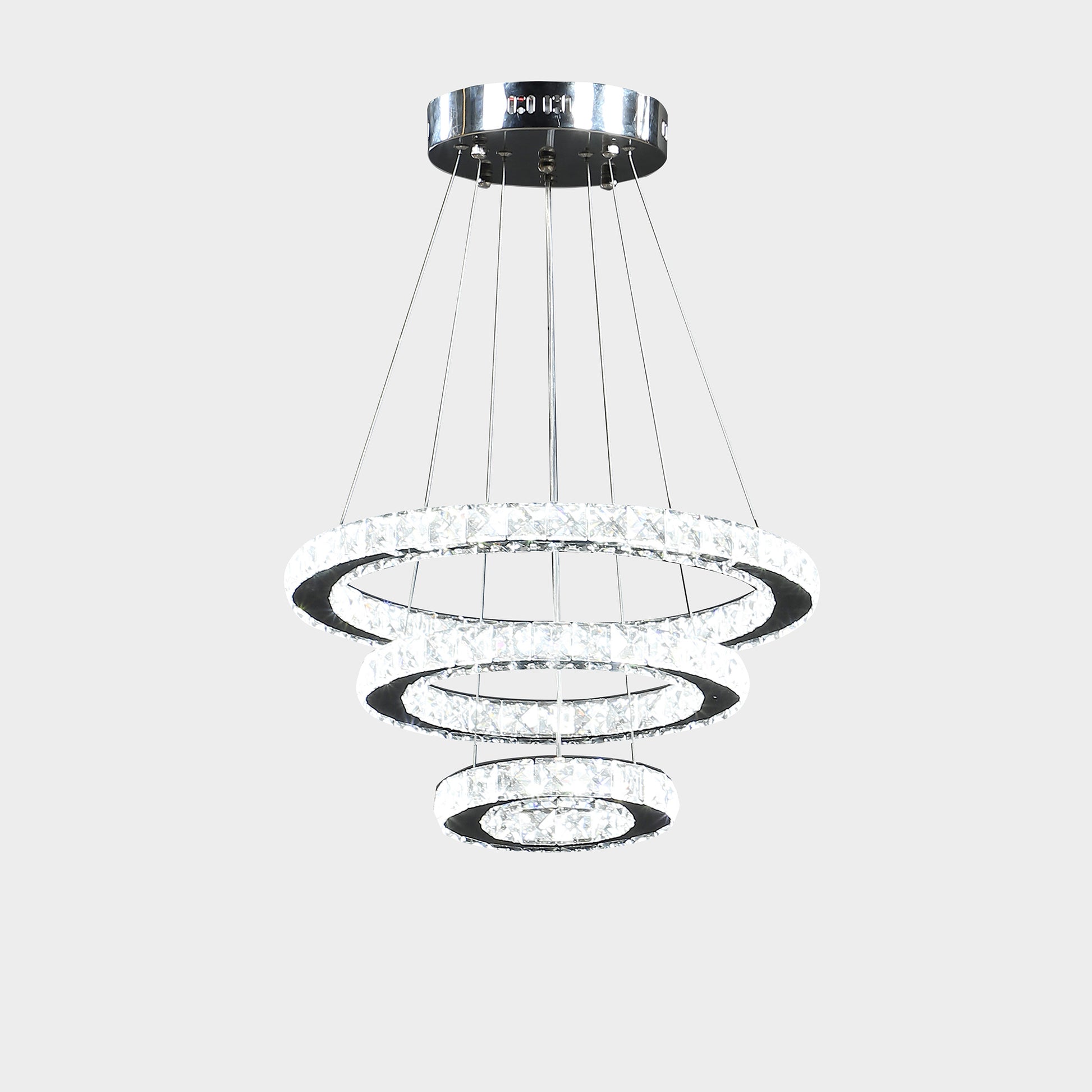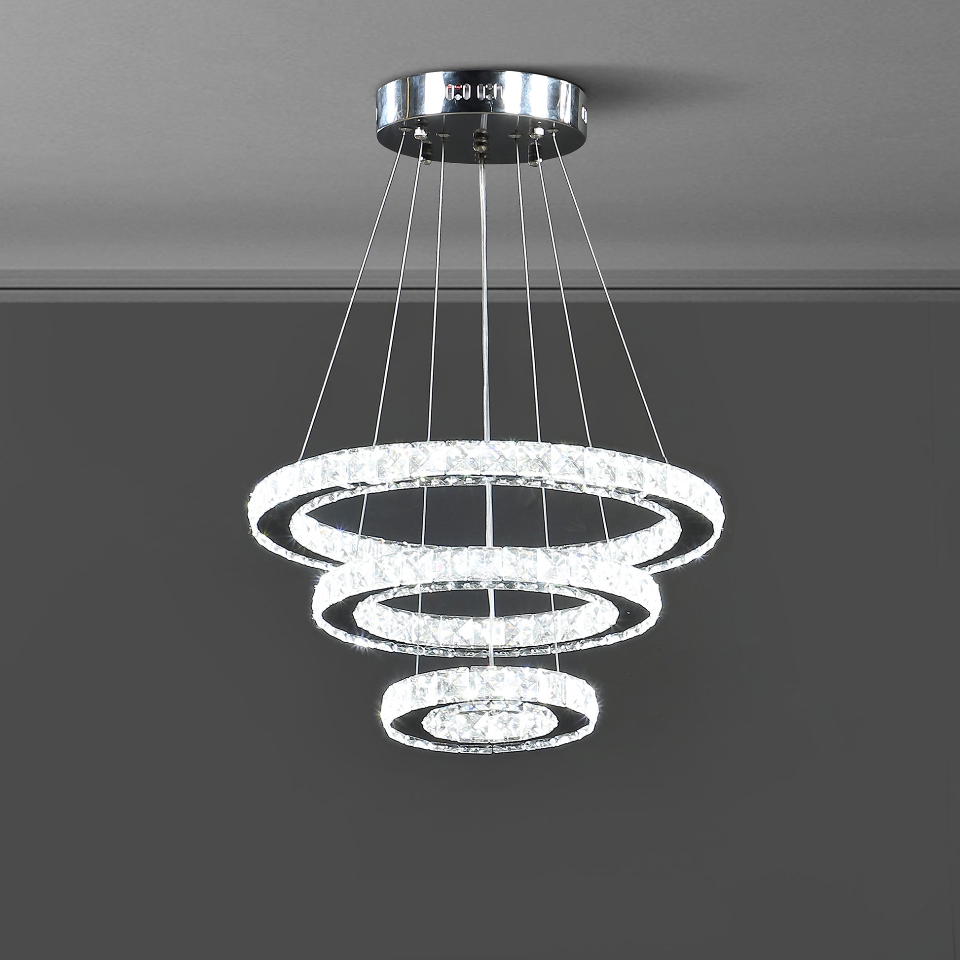 A unique silver chrome aluminum, triple hoop, clear crystal ceiling light, inspired by the pattern of quickly formed ice crystals. The Alva Ice Crystals comes with over 9000 faceted crystals from this chandelier. Suspended from delicate, height adjustable, clear wire cables; position this feature light over dining tables, in bedrooms or as a centerpiece in your living room for an amazing compliment to your home interior. This LED chandelier lighting fixture comes with embedded crystals in the shape of rings, securely wrapped and fairly easy to install. The modern pendant light fixture is decorated with top-quality K9 crystal is a variety of optical borosilicate crown glass. The letter "K" is a reference to the German word for "crown" (Krone) and the number 9 refers to the lead content of the glass (9%), with a great light refraction effect and superb cutting technology. Its feature with bubble-free, high clarity, low-dispersal properties, and refractive index makes it a good choice for inclusion in high-quality light fixtures. This 3-light unique chandelier fuses playful glam whimsy with a modern, sleek design to elevate your living or dining room. It's crafted from stainless steel with a circular canopy and height-adjustable barely-there wires. The body features three tiers of elegant ring lights with built-in LEDs – arrange them in a V-shape or at different angles for an abstract, sculptural look. We love that these circles appear to be floating in the air, with glittering clear crystal accents that bounce light around the room. Plus, this refined chandelier is both sloped-ceiling adaptable and dimmer-switch compatible. The unique design makes this LED crystal chandelier light a perfect piece that works for an area of, light up your entryway, dining room, sitting room, kitchen, or even your bathroom with this LED chandelier. The modern flush mount pendant ceiling light is featured with high clarity generous rings of cascading 100% crystals to catch the light. A minimal aluminum-steel frame in a smooth silver finish becomes dazzling when it is covered entirely with rectangular and square spectacularly faceted royal-cut clear crystals. The round ring design hangs from almost invisible wires with brilliant integrated LED shining unseen from within. Comes with a White remote control battery operated complete with remote control. The remote control adopts dimmable brightness and 3 color temperatures to suit your mood (3000k warm white, 4000k neutral white, 6000k cool white) & (no memory function).