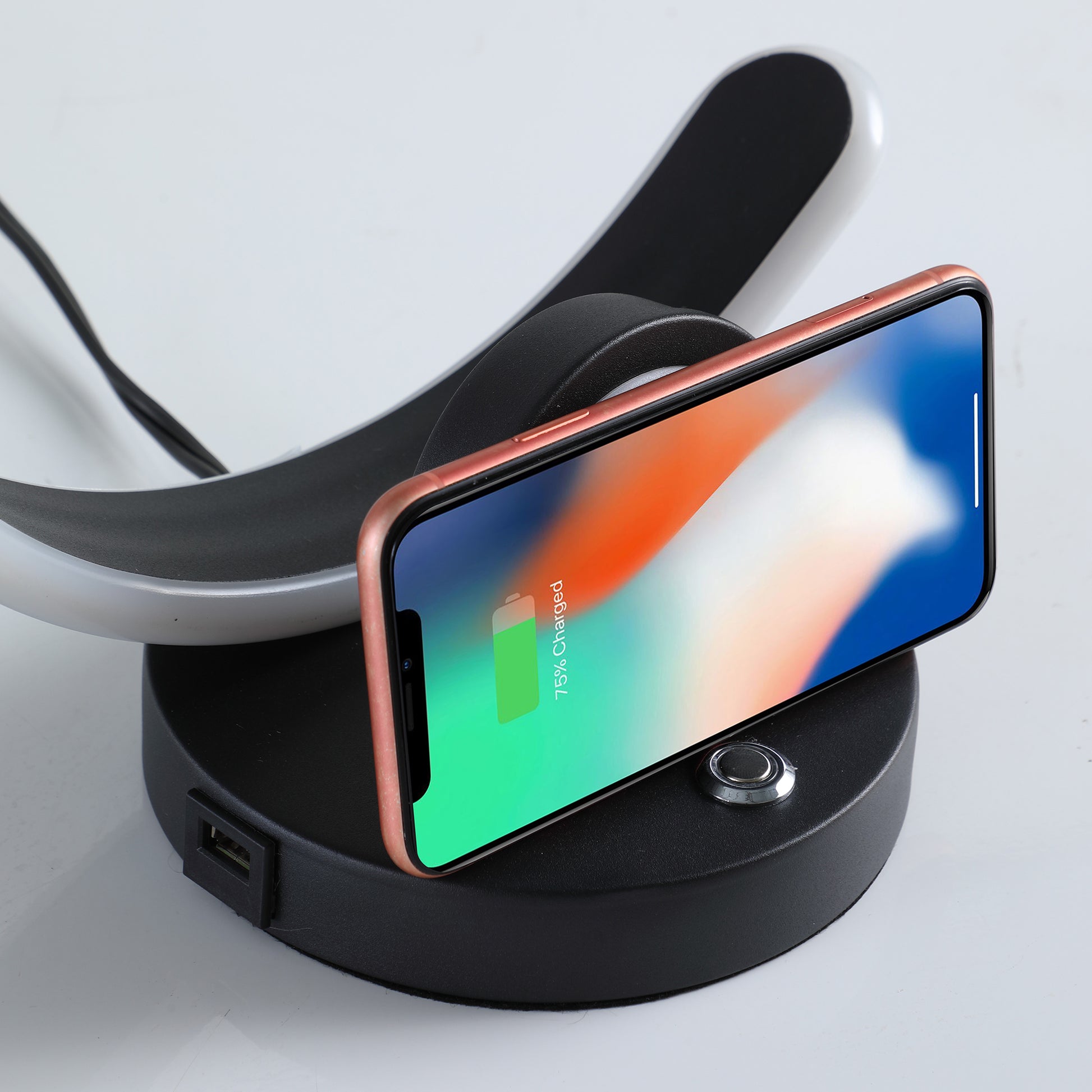 13.25" In Modern C Shape Led W/ Usb/wireless Charger Port & Touch Dimmer Black Table Lamp