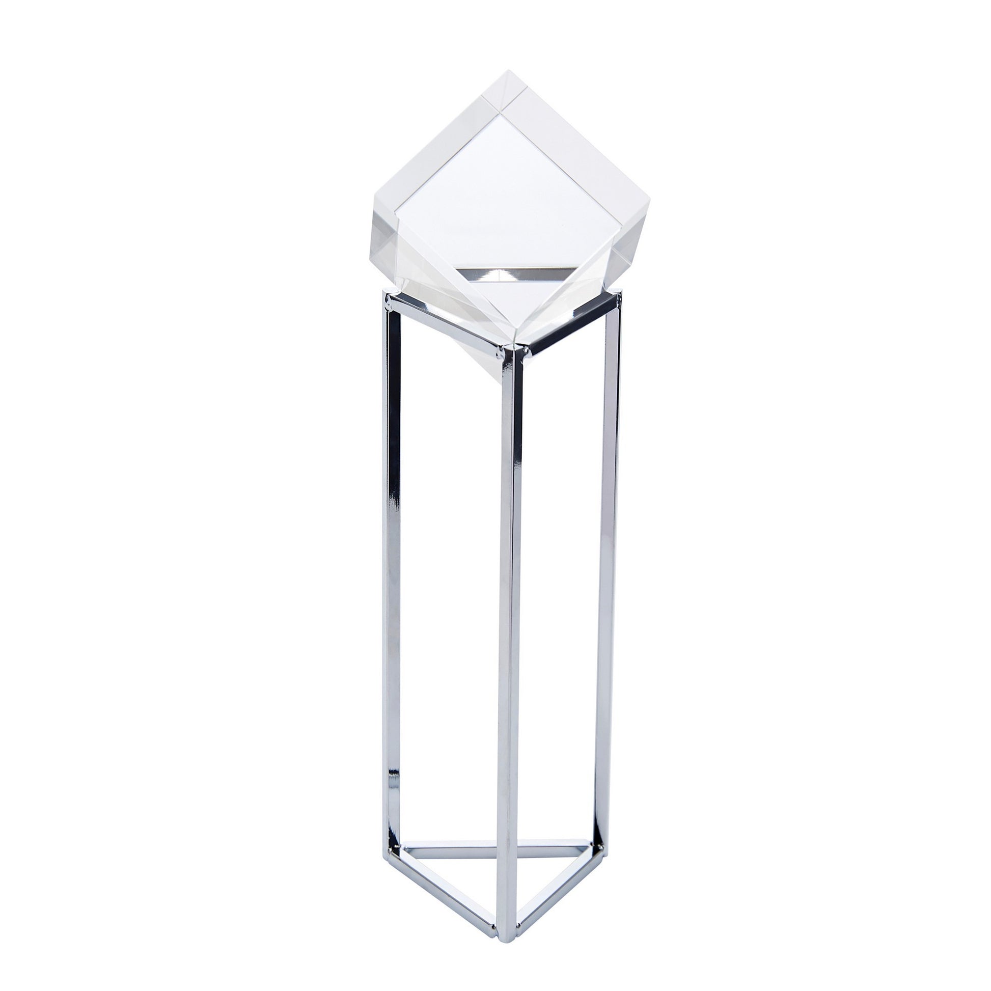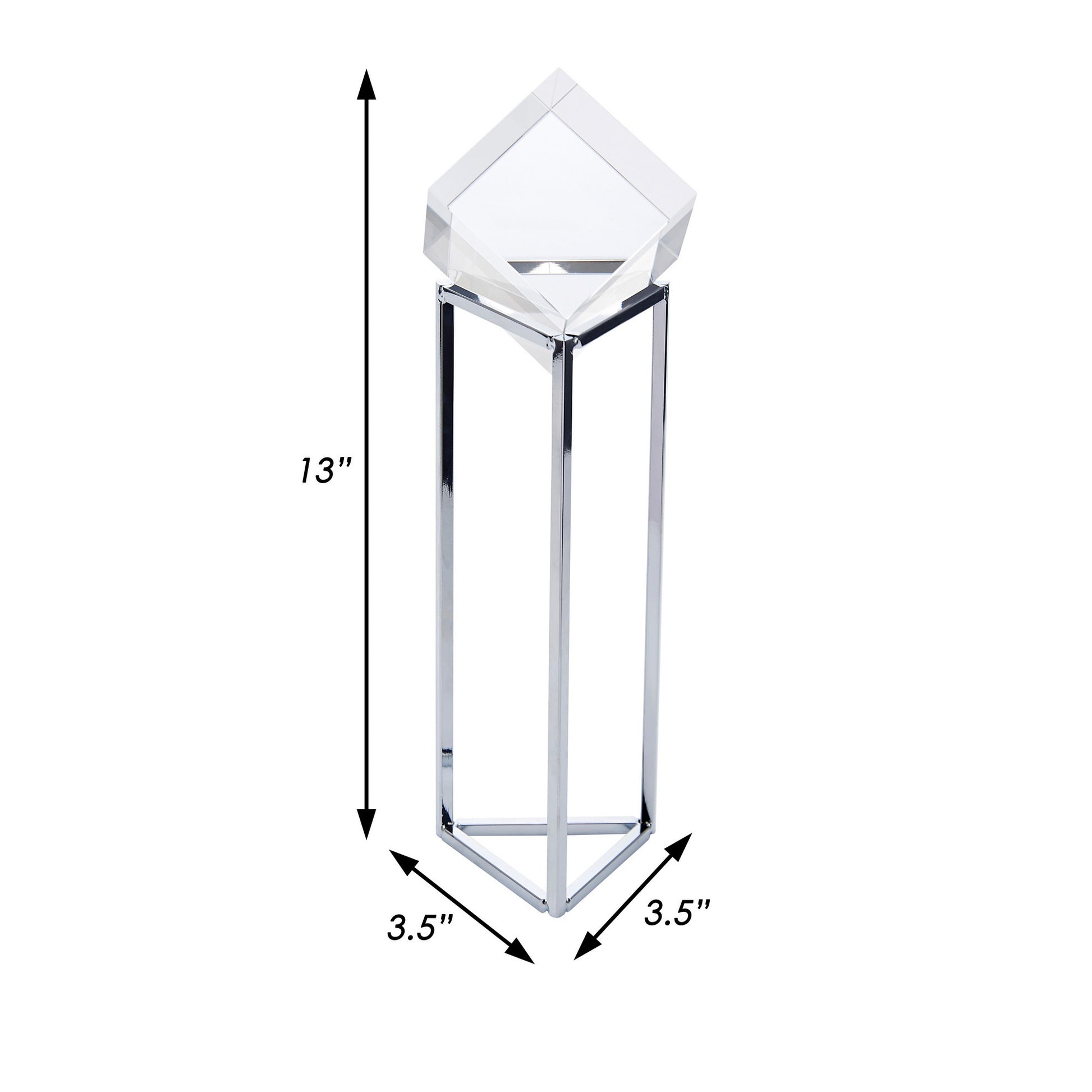 Radiating a charismatic aura, this tabletop accent decor depicts a crystalline cube on a triangular base. The chrome polished metal stand emanates a striking aura while the clear crystal shape fills your interior with a sense of light and exuberance. This inviting accent decor can be placed atop your console table, accent table, or mantelpiece to enhance the sophistication of any room.