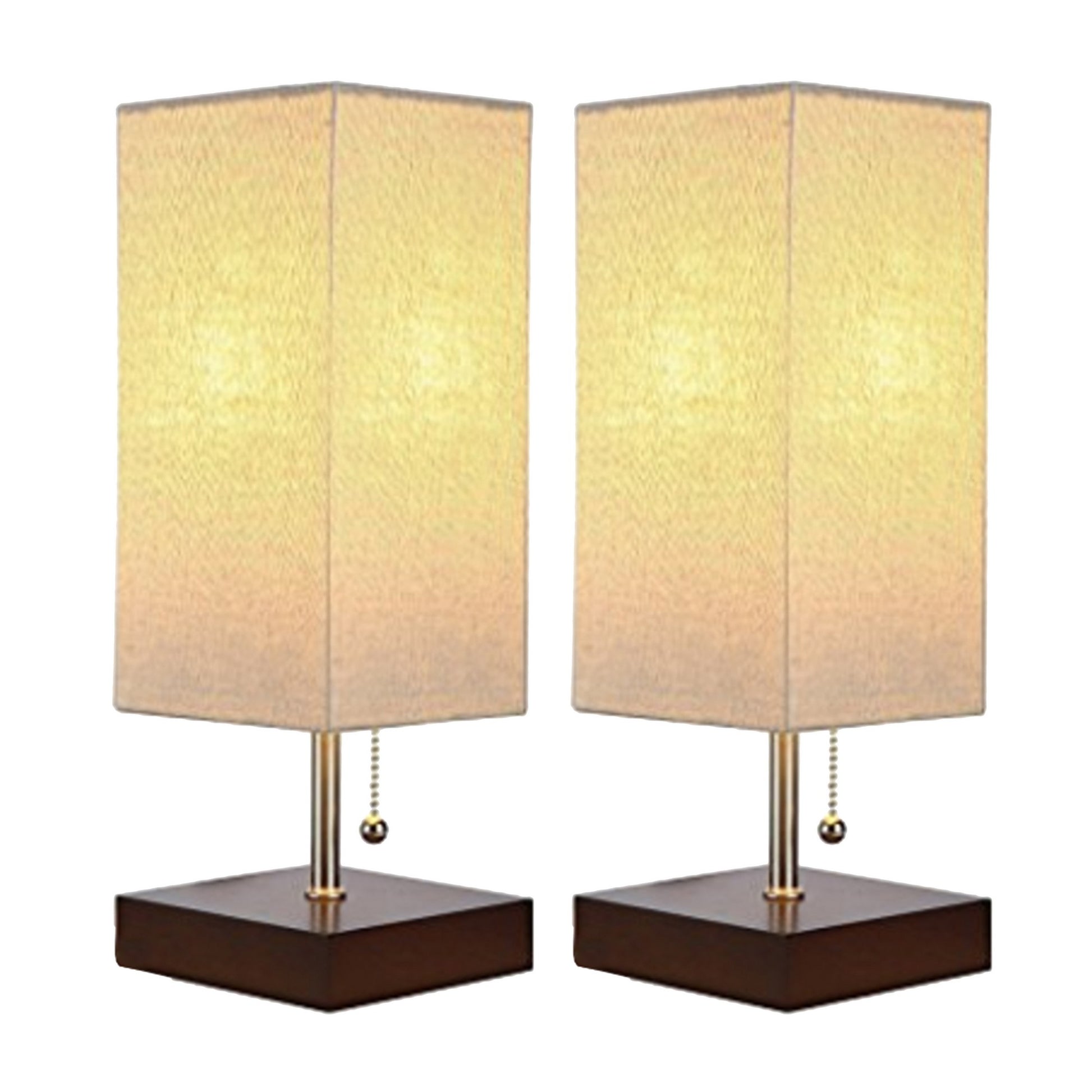 14 Inches Wooden Frame Table Lamp with Chain Pull Switch Set of 2 Brown