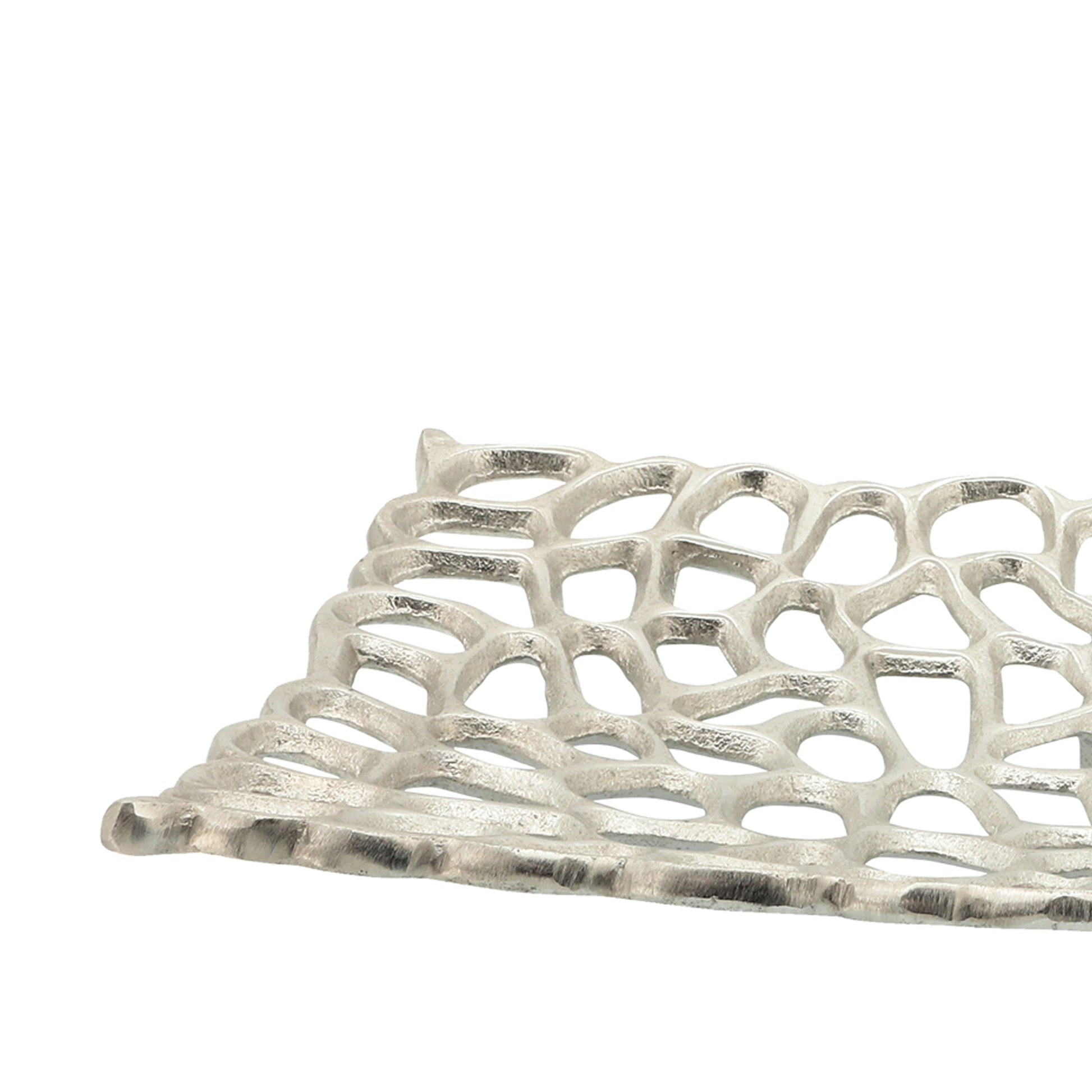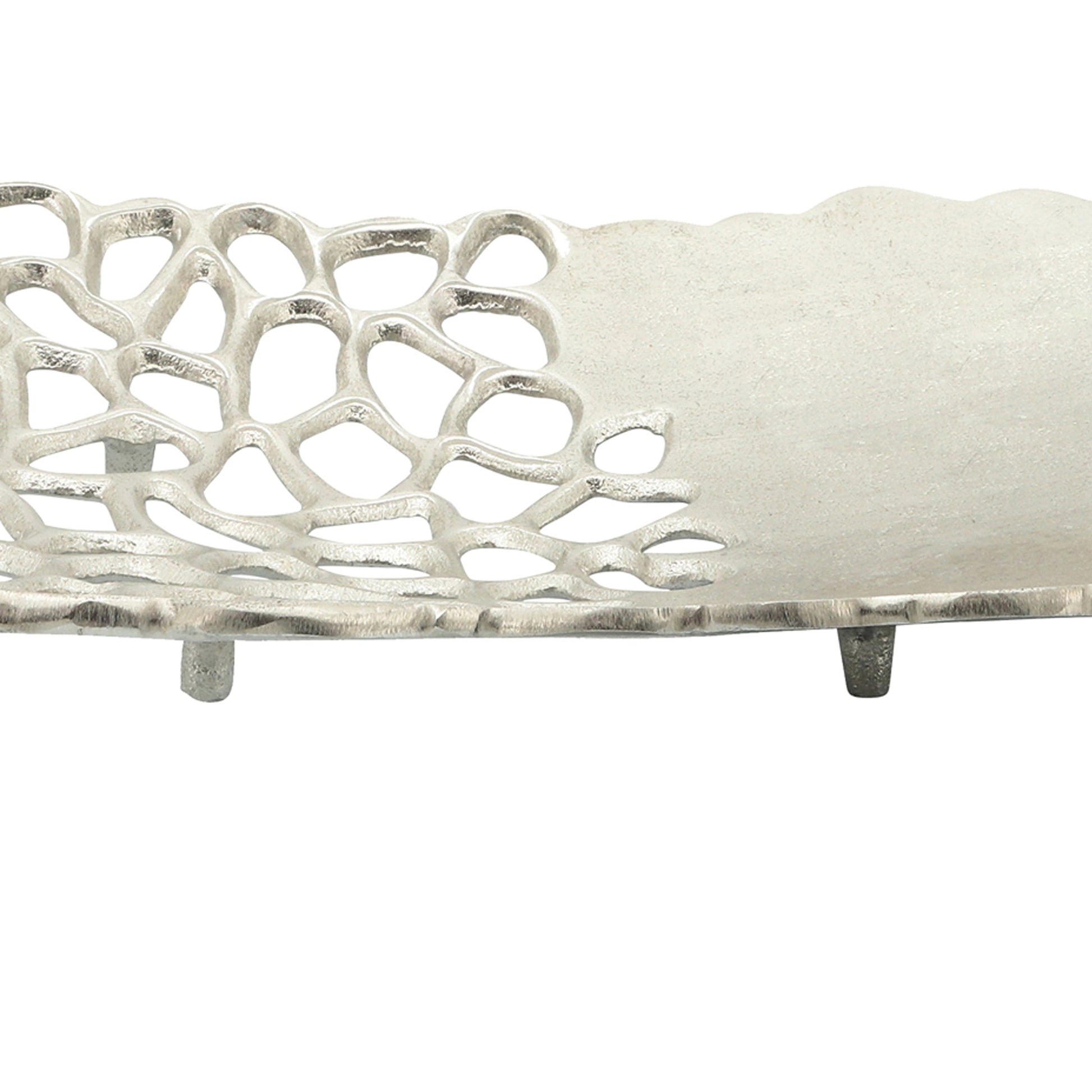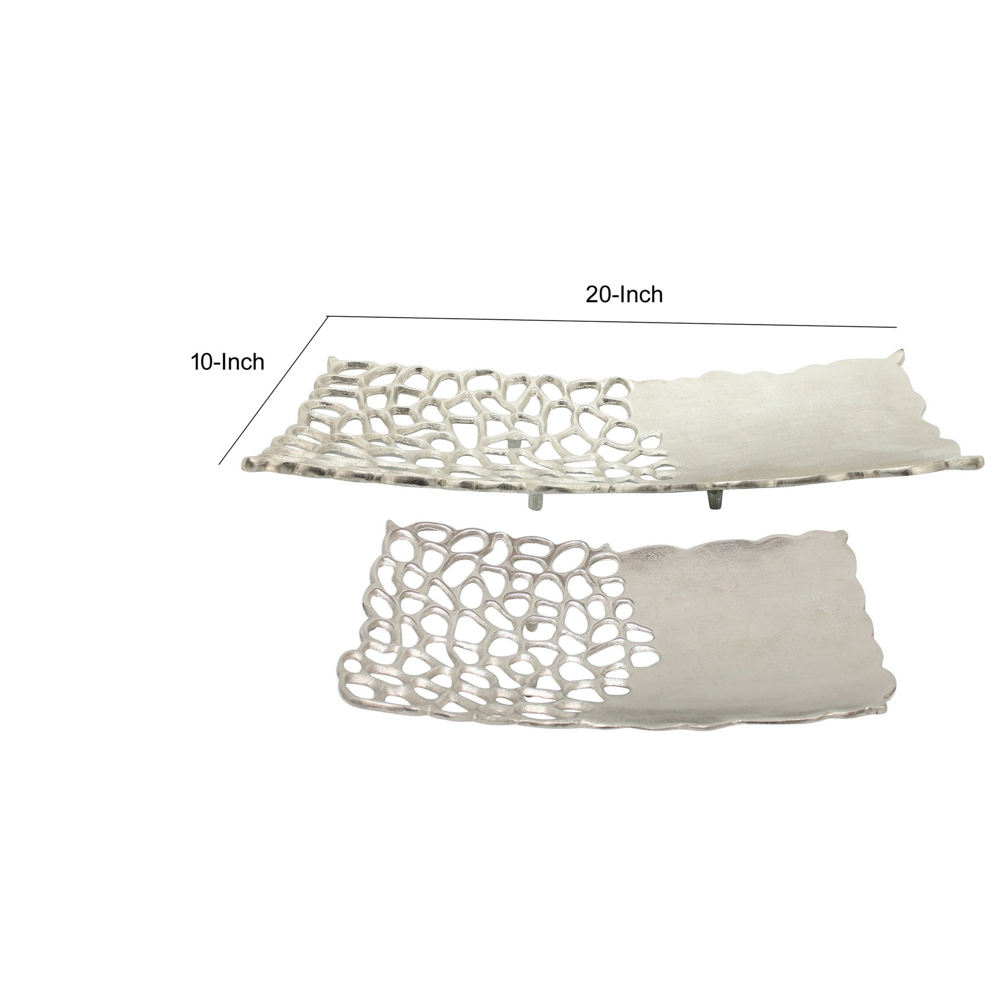 Bring a fresh new accent to your kitchenware and dining accessories with this gorgeous set of two decorative plates, featuring meticulously cut patterns and gracefully crimped borders. The set is supported on sturdy legs and given a gleaming silver finish for a kitchen side piece that brims with both sophistication and effervescent style.
