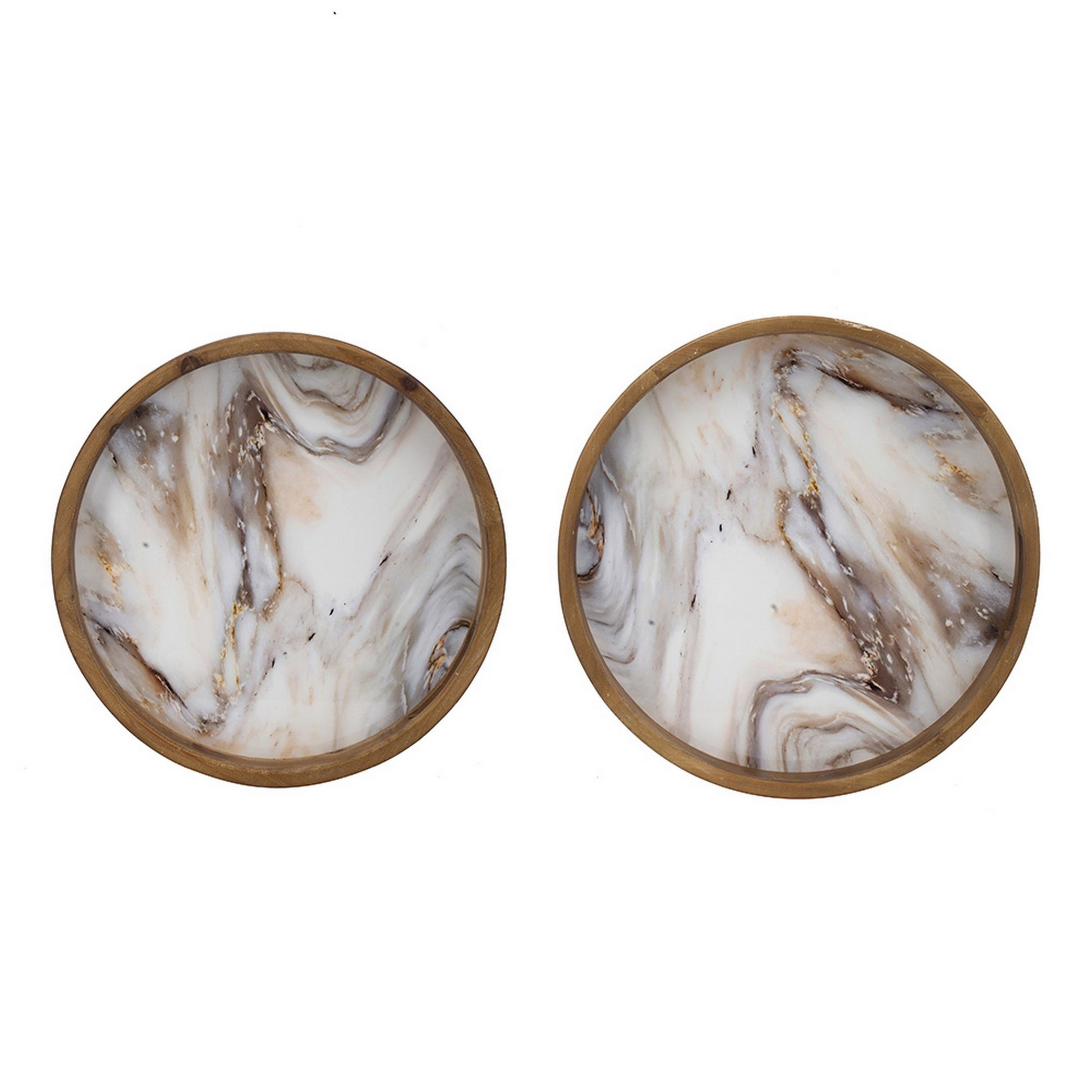 18 15 Inch Round Decorative Tray Marble Effect Brown Fir Wood Frame