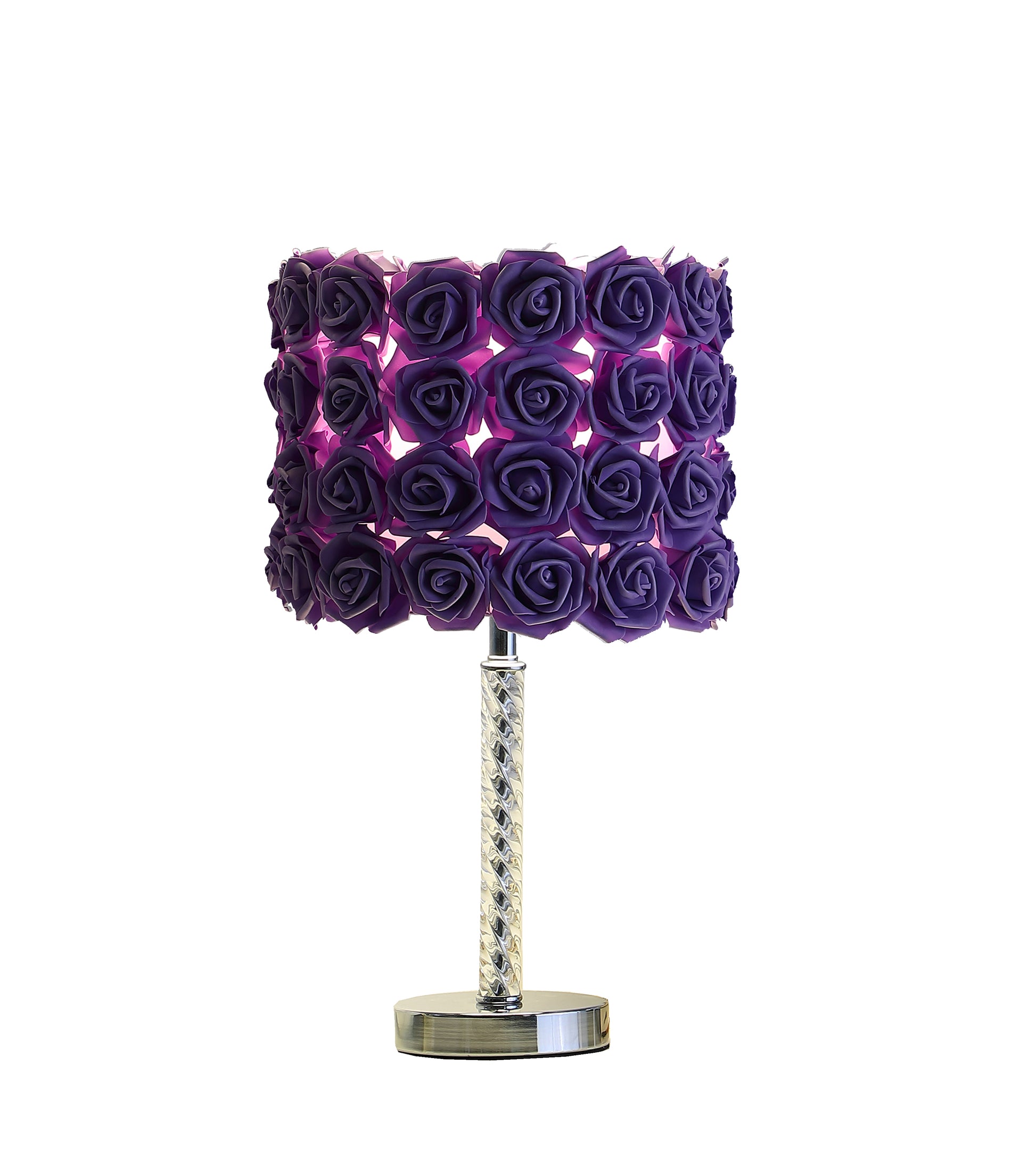 Express yourself and make a fashion statement with this fashionable Lavender Roses in Bloom table lamp that always starts conversations. Pretty and romantic, 56 Lavender Roses attached to Drum Shade will help complete the look of your Shabby Chic Luxury Glam living space. A modern acrylic clear twisted table body sitting on a Silver Chrome Base, this lamp is the perfect accent for your welcome ambience of Shabby Chic Luxury Glam look. Brighten up a bedroom, living room, family room, or den with this delightful design. For the modern home. These lamps will work well in the bedroom, nursery, on the hallway table, or even in an office as a desk lamp.