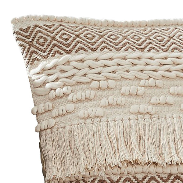 18 Inch Decorative Throw Pillow Cover Fringes Braids Beige Fabric