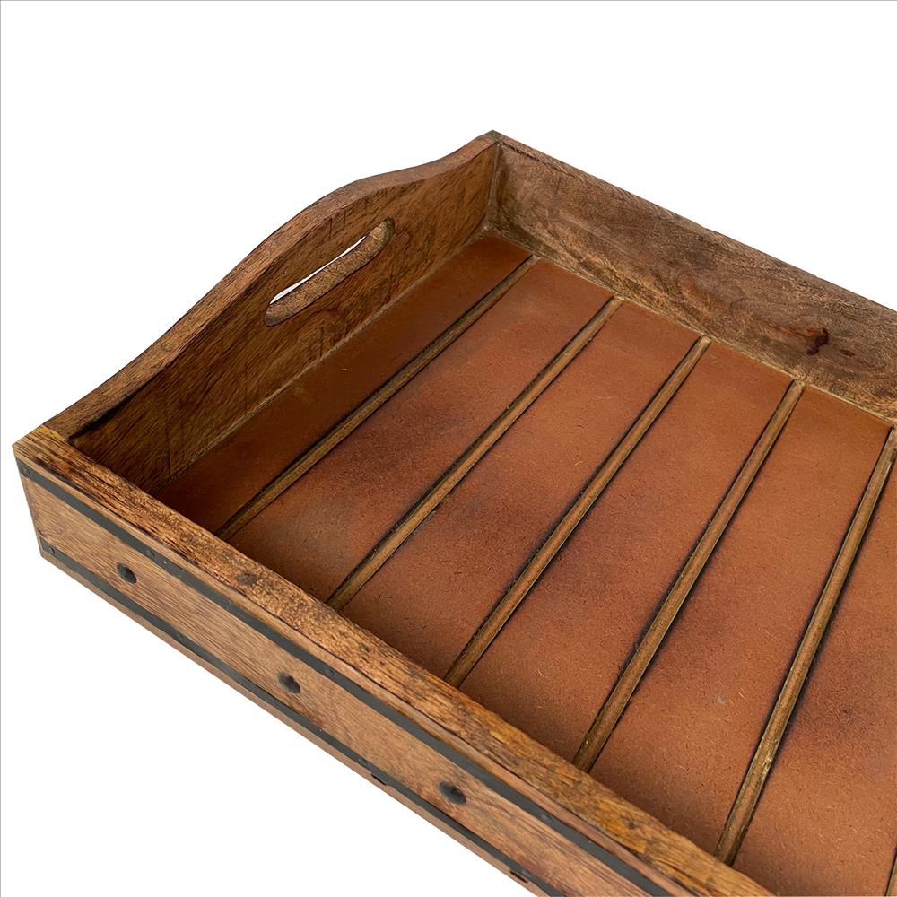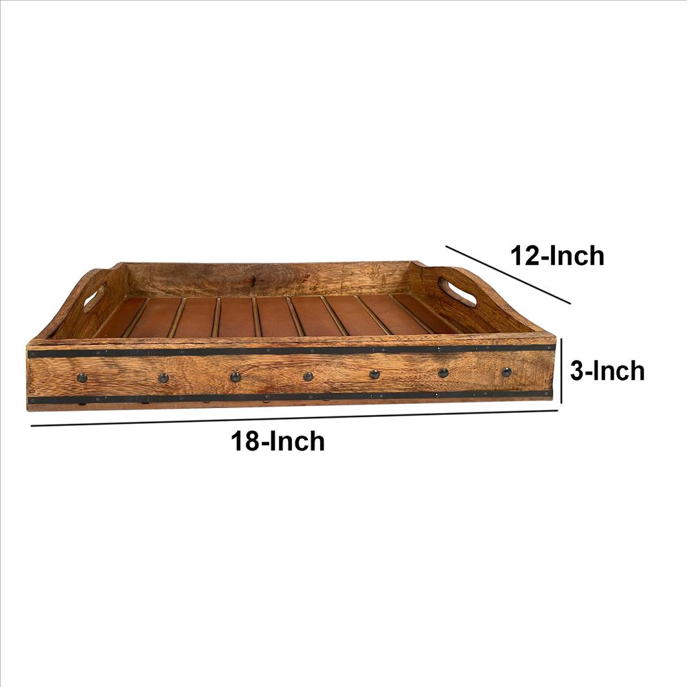 18 Inch Handcrafted Rectangular Mango Wood Decorative Serving Tray Rivet Accents Metal Trim Natural Brown