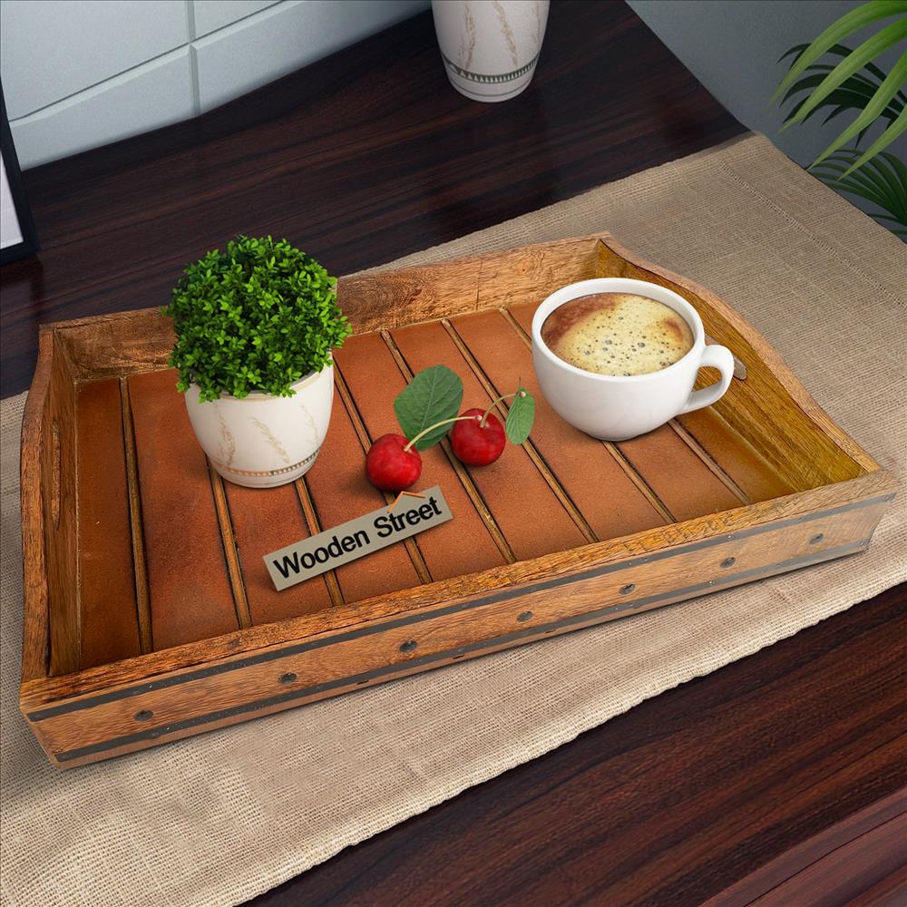 A perfect blend of rustic farmhouse style and expert craftsmanship, this rectangular tray makes a perfect fit for your kitchen countertop, dining table, or buffet console. With a plank style serving space, the tray comes with scalloped handles with cut outs for portability as you serve yourself or loved ones. Featuring rivet accents and metal trim along the outer edges, the piece is handcrafted from durable mango wood and a solid composite wood frame. The natural brown finish complements the subtle wood grain details, imparting a rustic flair to it. A perfect piece to serve appetizers or desserts, it can also be used to showcase your hand curated decorations, vases, lights, and more.