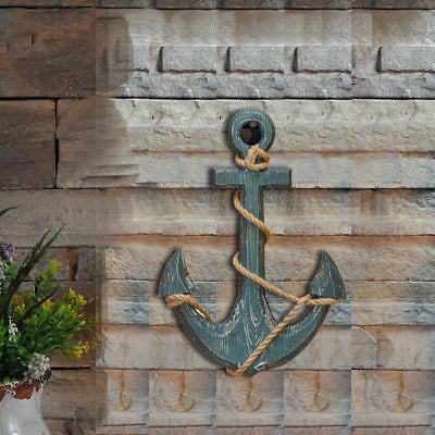 18 Inch Handcrafted Wood Wall Mount Sea Anchor And Rope Accent Decor Distressed Blue