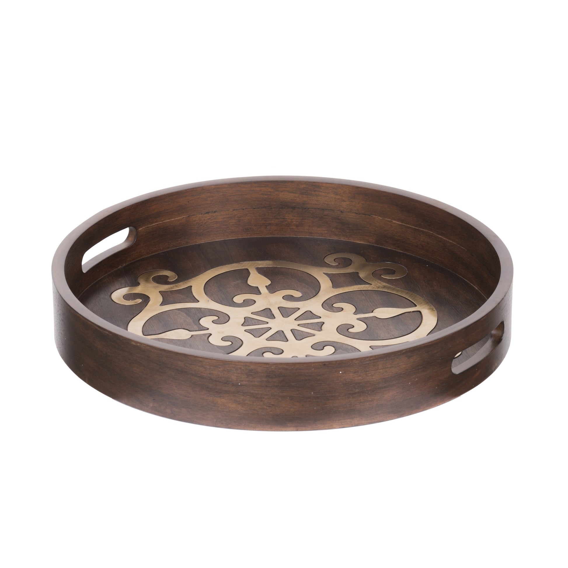 18 Inch Round Decorative Tray Brass Inlaid Design And Brown Wood Frame