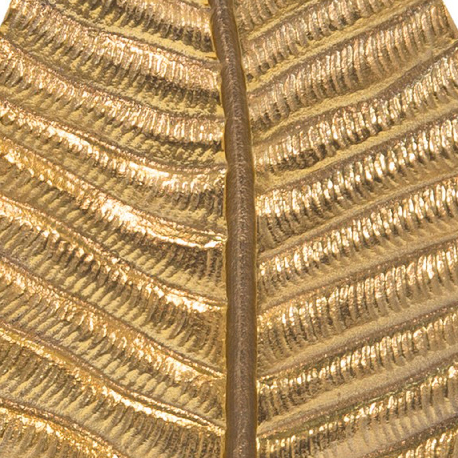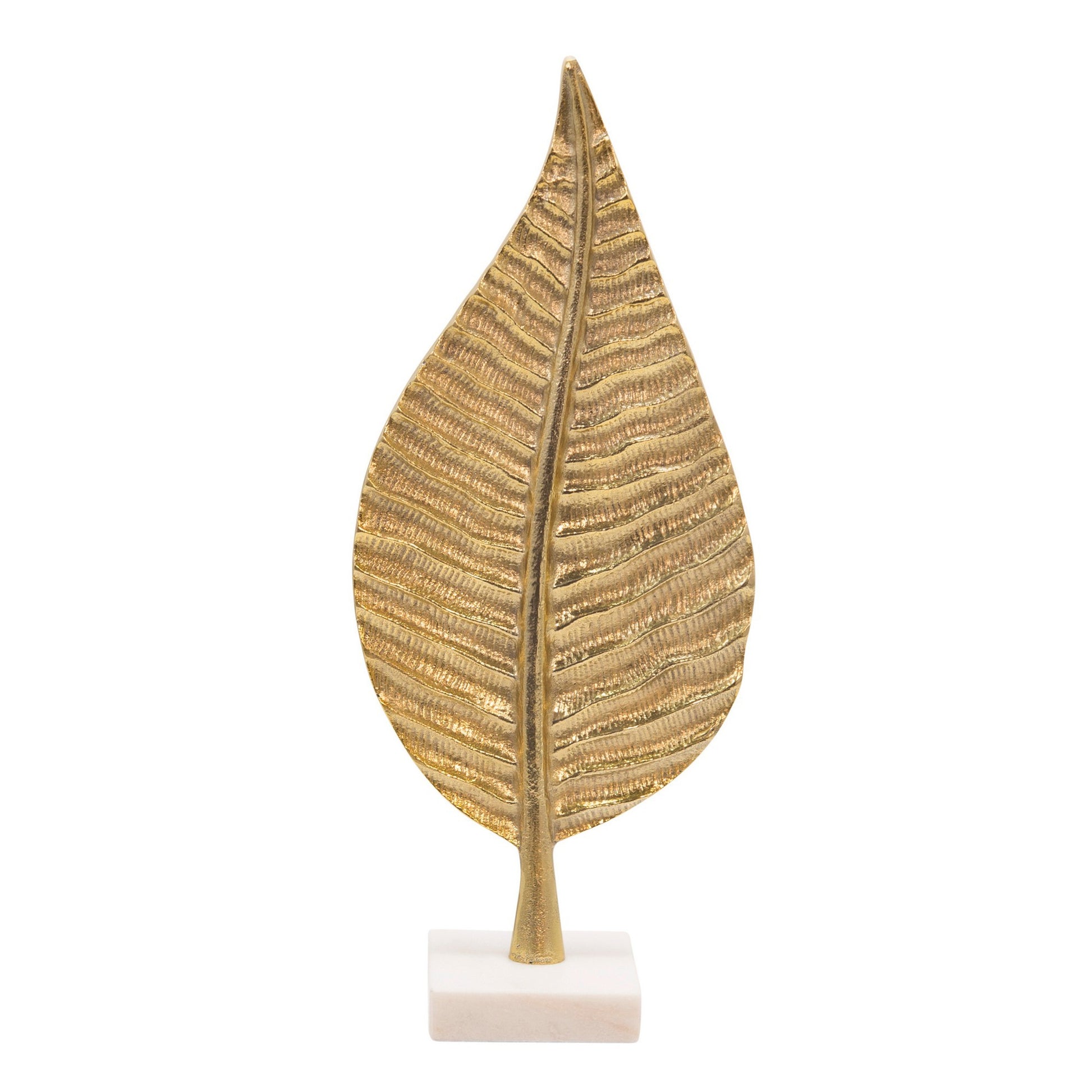 Intricately hand designed, this standing leaf accent decor is sure to complement your tabletop, kitchen counter, or mantlepiece. Crafted from an aluminum frame in a gold tone finish, it is supported on a solid block base. The nuanced textured leaf vein design depicts the highly artisanal nature of this piece, making for a perfect accent piece in any home, practically blending with any decor style.