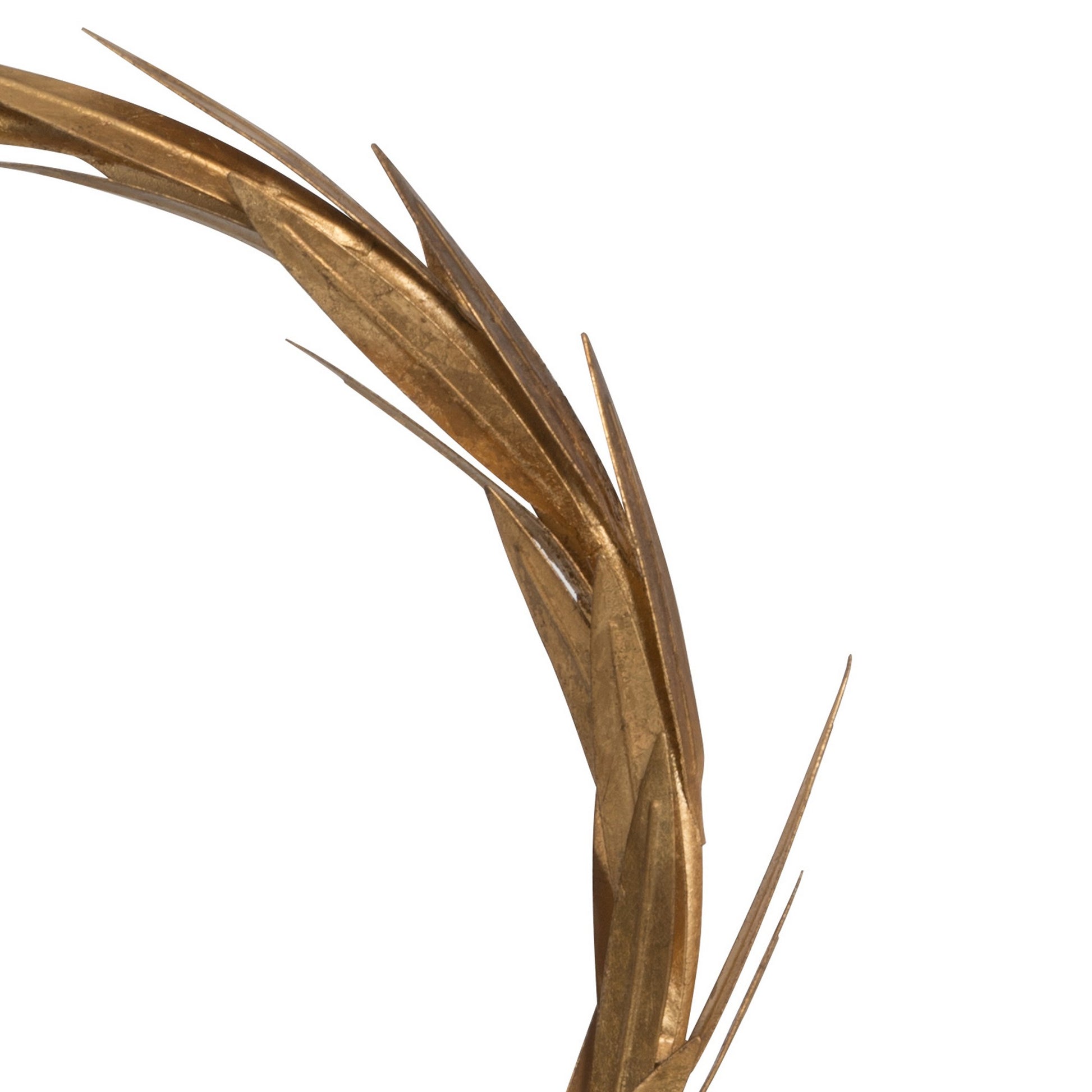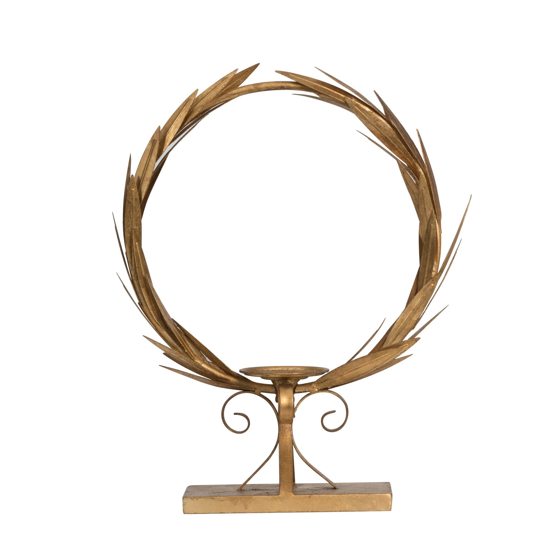 Brimming with a vintage yet regal flair, this tabletop candle holder makes a perfect accent as well as a functional piece for any interior decor style. Replicating a Roman style laurel wreath design, this piece is expertly crafted from a durable iron frame in a gold tone finish. A perfect fit for your console table or mantelpiece, this piece adds a bold style statement amid any home decor.