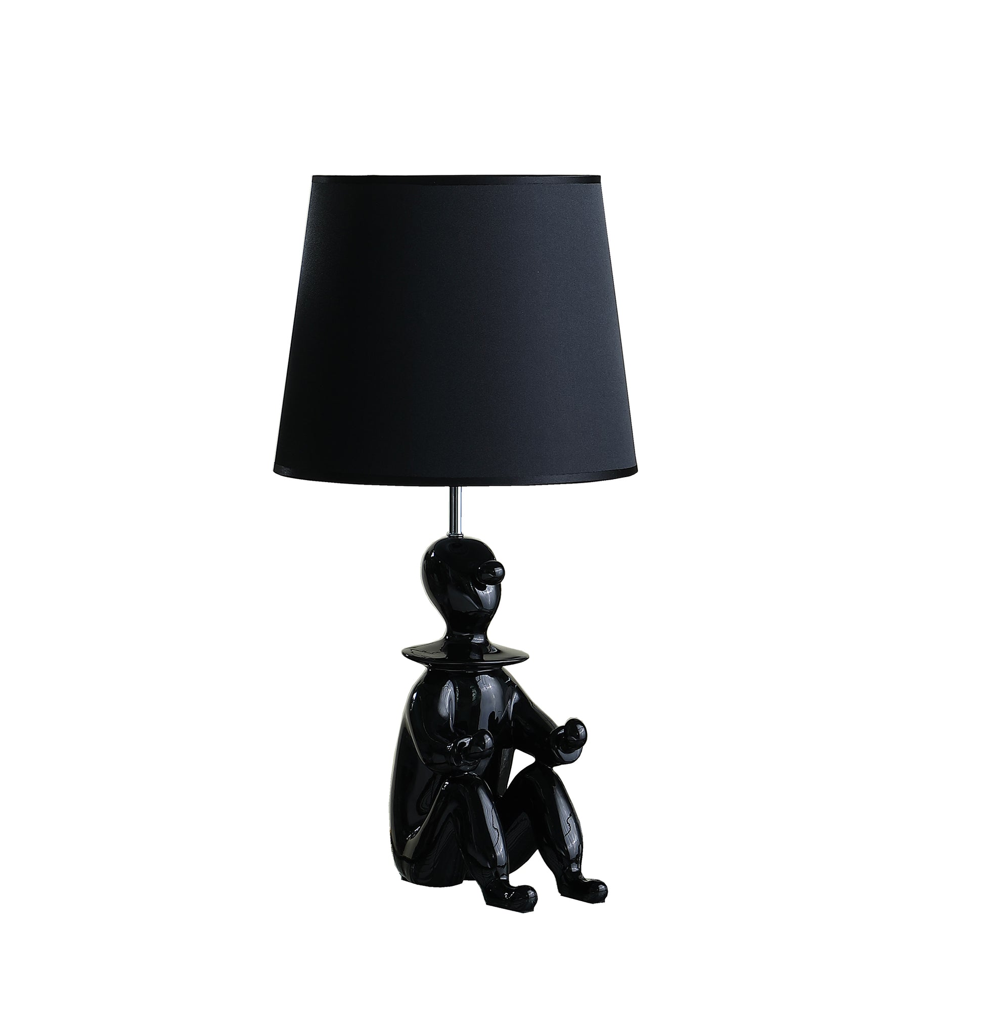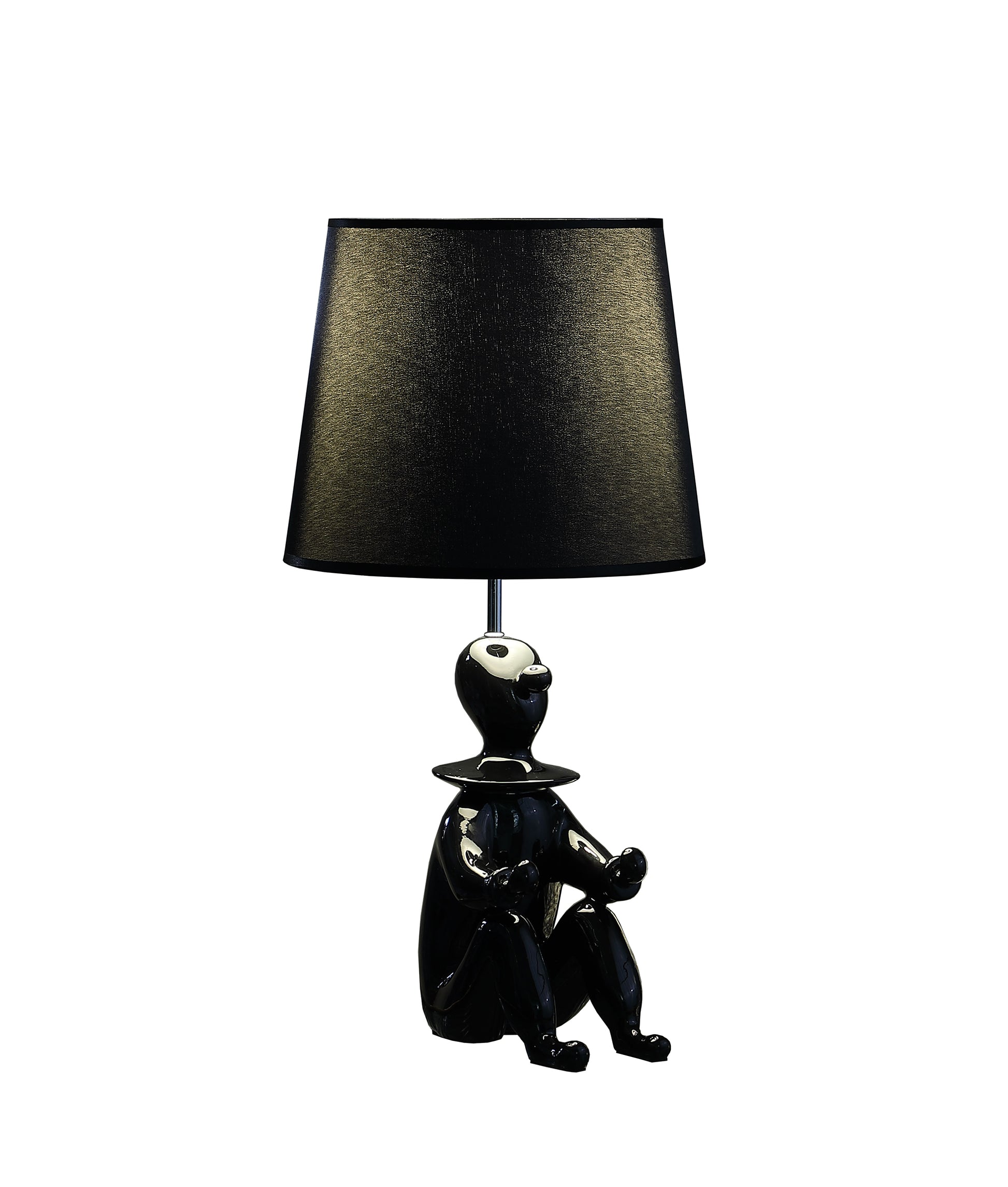 A solid Black resin modern harlequin clown figurine table lamp, in a sitting position with hands extended to be able to lay your smartphone as a holder or place your phone on it's clown feet as a dual phone holder combo. Convenience and practicality, This is a great conversation piece that would be great for any living spaces. Cute modern harlequin clown table lamp is made out of polyresin with a Chrome silver metal tube connecting to the Bulb socket in a solid red color. A perfect unique accent for a study, bedroom or living room. The result is a light and playful modern design, perfect if displayed as a companion beside you sitting on an end table or office table.