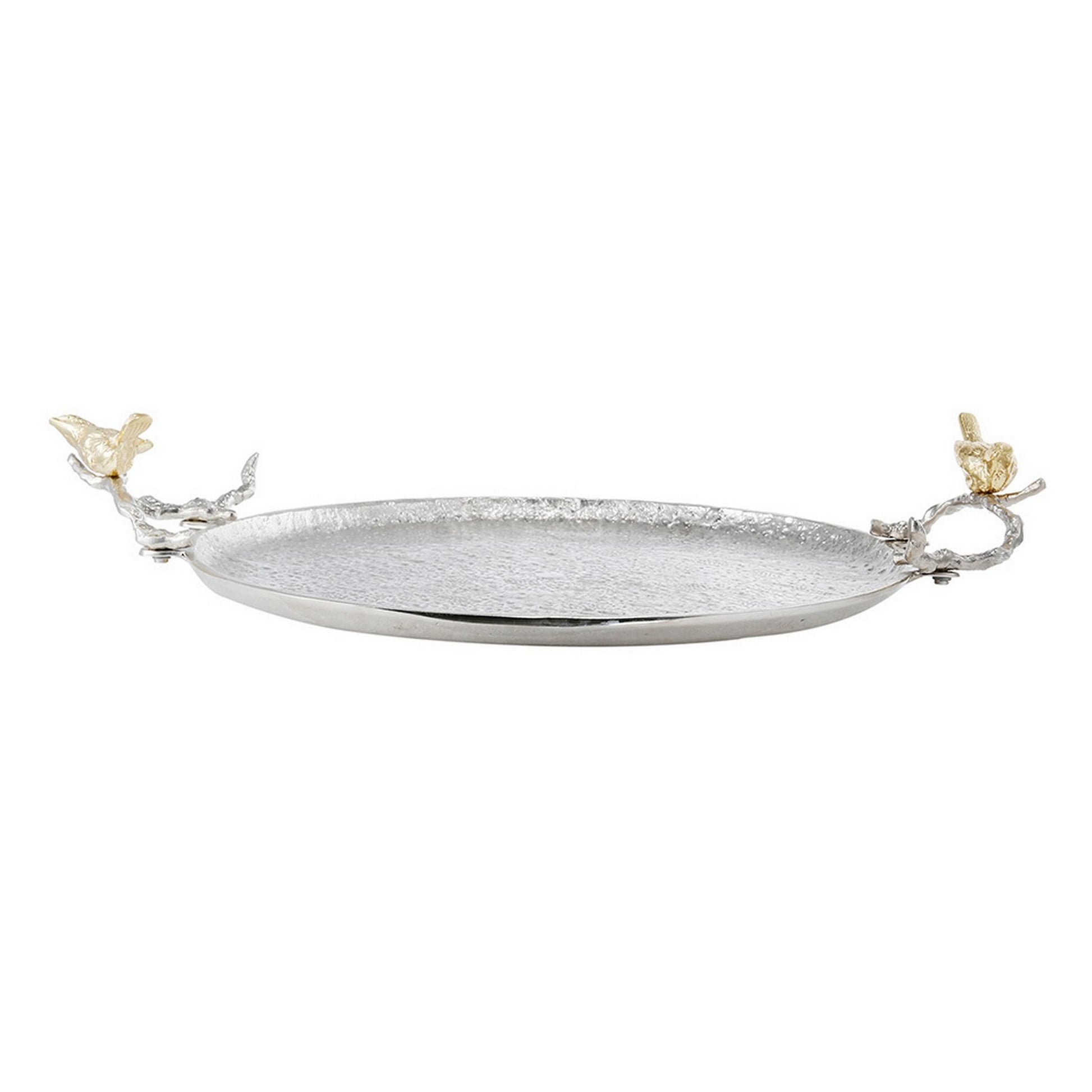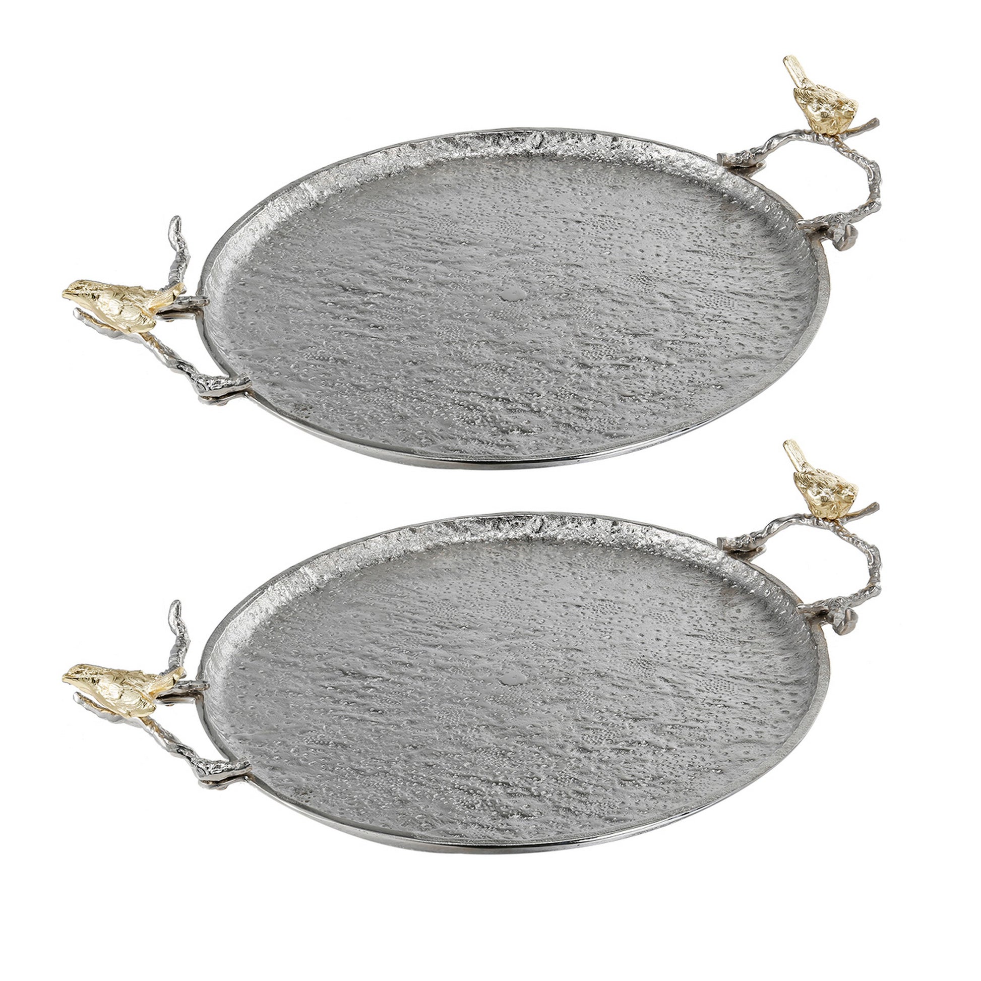 21 Inch Decorative Tray Perched Birds Silver Metal Large Set Of 2