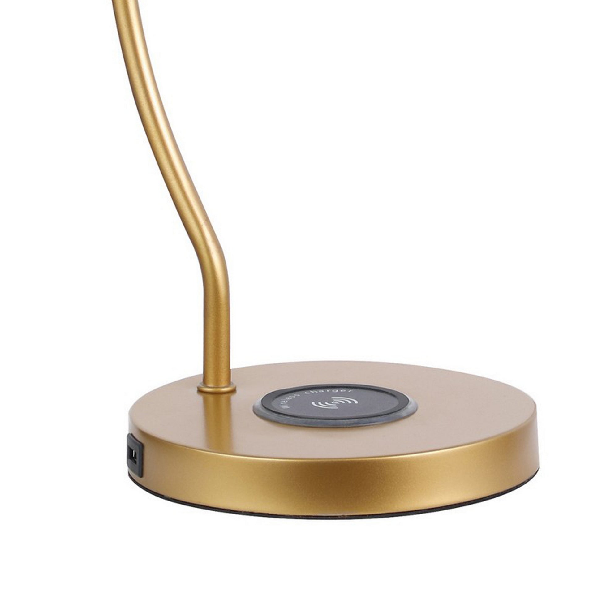 Give your working space both convenience and comfort under the light of this gorgeous, modern table lamp. The durable metal base with a glimmering gold finish makes the piece an attractive accent in your home office, bedroom, or other working area. The arc shaped stand holds a domed shade that directly lights the space softly and effortlessly. 9 watt LED bulb required.