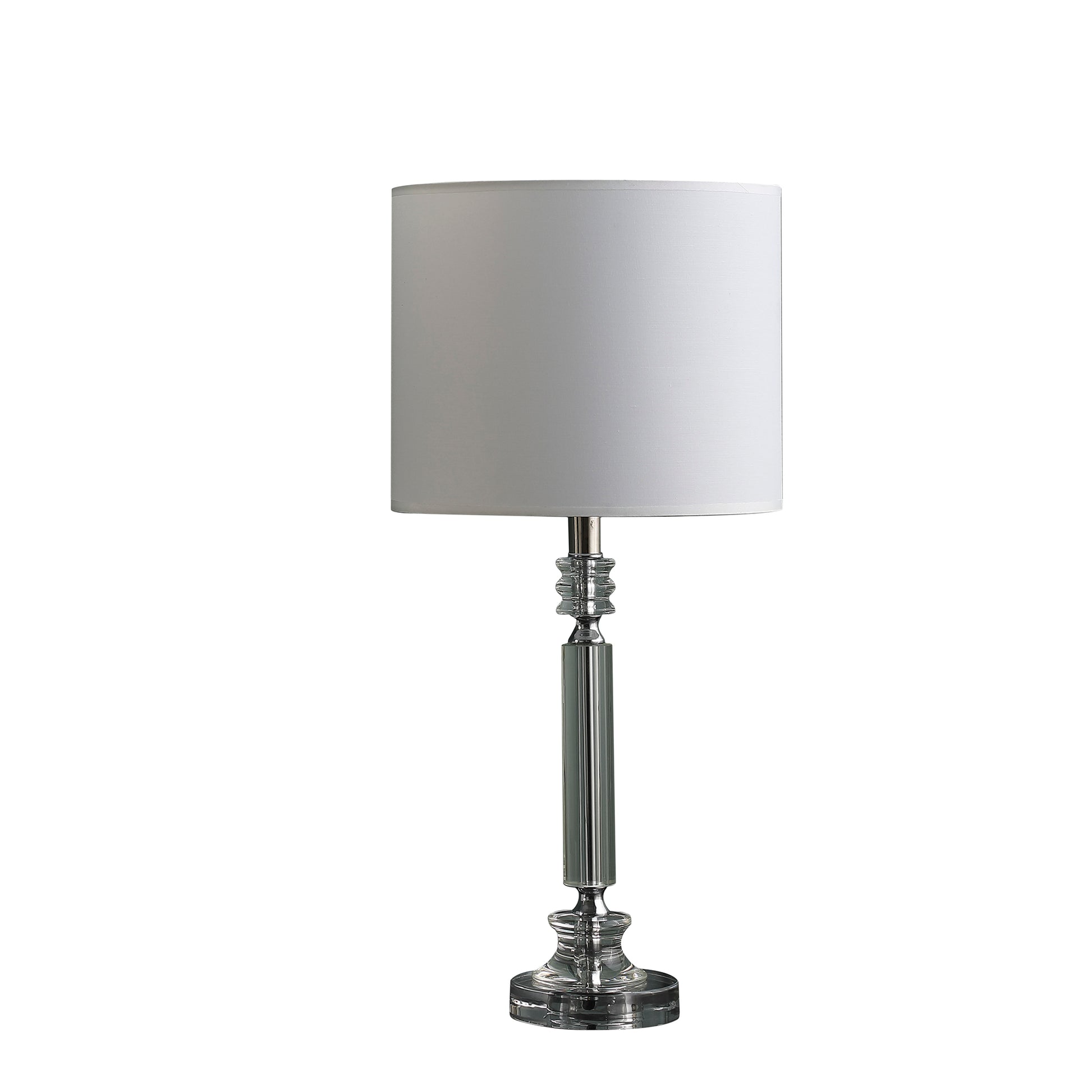 The white shade and clear cut crystal body of this modern column accent lamp creates a stunning and clean appeal. This elegant transitional table lamp sports a stunning cylindrical column-style crystal base for timeless accenting. Modern and glamorous style mixed into one, this Mitz cut-crystal column table lamp is topped with a sleek white uno-fitter drum shade. A glistening, carved round base sparkles in this fabulous 100% crystal accent lamp. A single-tiered cut-crystal round base sits below and beautiful, you be able to purchase a self adhesive round rubber to place on the bottom base to prevent from scratching your table top. Add some glam to your decor with this wonderful accent light. this modern interpretation of a crystal table lamp on a cylindrical column-style base sits on a round pedestal and tapers upward toward small silver chrome accents shapes at the bottom and neck. The design features a column-style base, made from cut crystal, which bounces light all around the room from its many facets and providing a well rounded element to the design. Place this lovely design anywhere in your home that needs illumination and modern elegance.