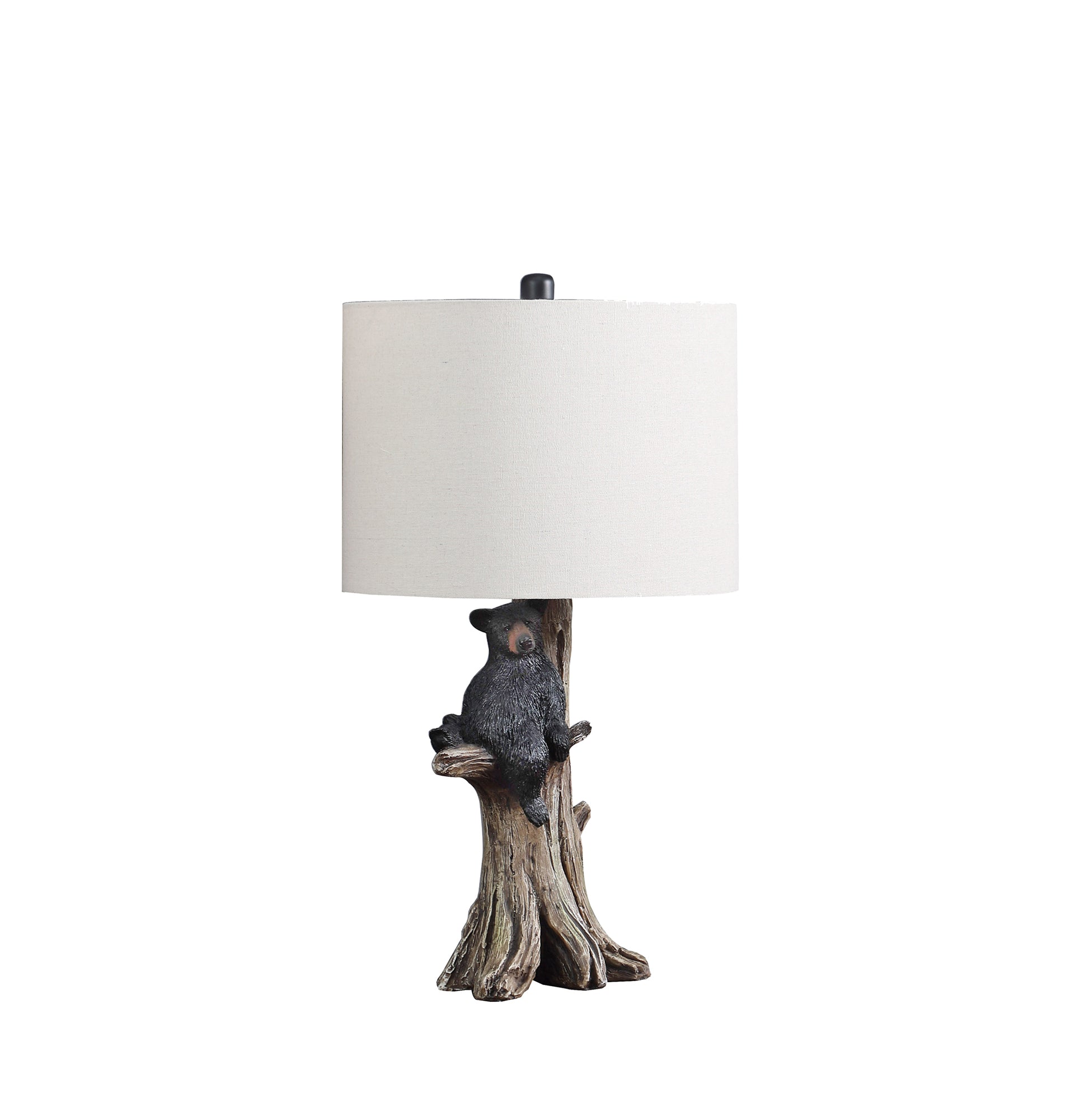 Bring the outdoors inside with this lovely Black Bear accent table lamp, which features a beautifully cast resin bear and texture beige drum linen shade. This whimsical table lamp design depicts a single determined bear looking out the horizon table lamp. Inspired by the outdoor lifestyle, this accent table lamp offers a handsome look for home offices and seating areas. This wonderful table lamp is sure to add a bit a fun and whimsy to your decor. It features a finely detailed tree base with a single black bear sitting on a tree branch. The detailed and durable resin sculpture is brought to life with a hand-painted finish. This lamp goes great on a desk, end table, nightstand, or countertop. Resin base is in a brown wood finish with other finish accents.