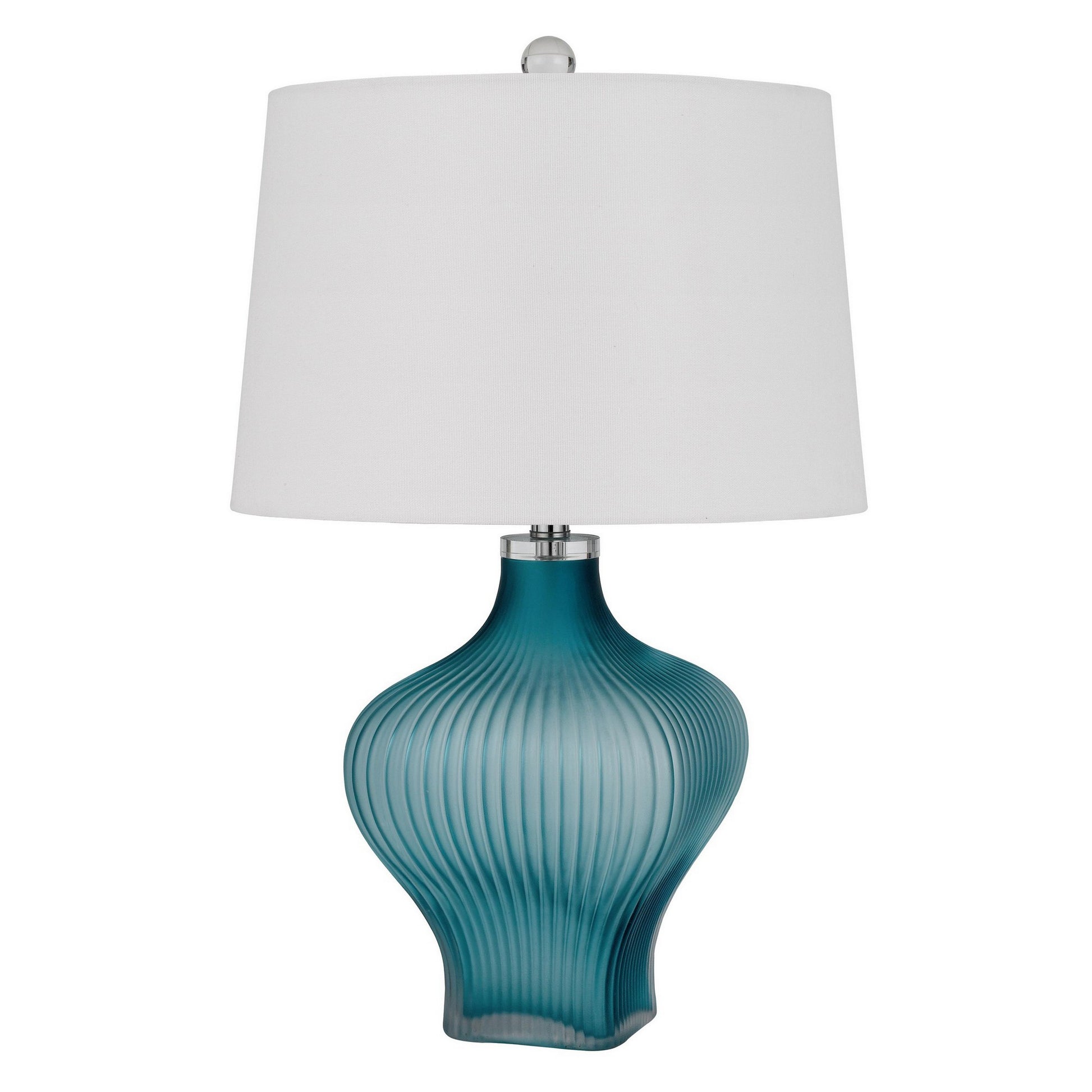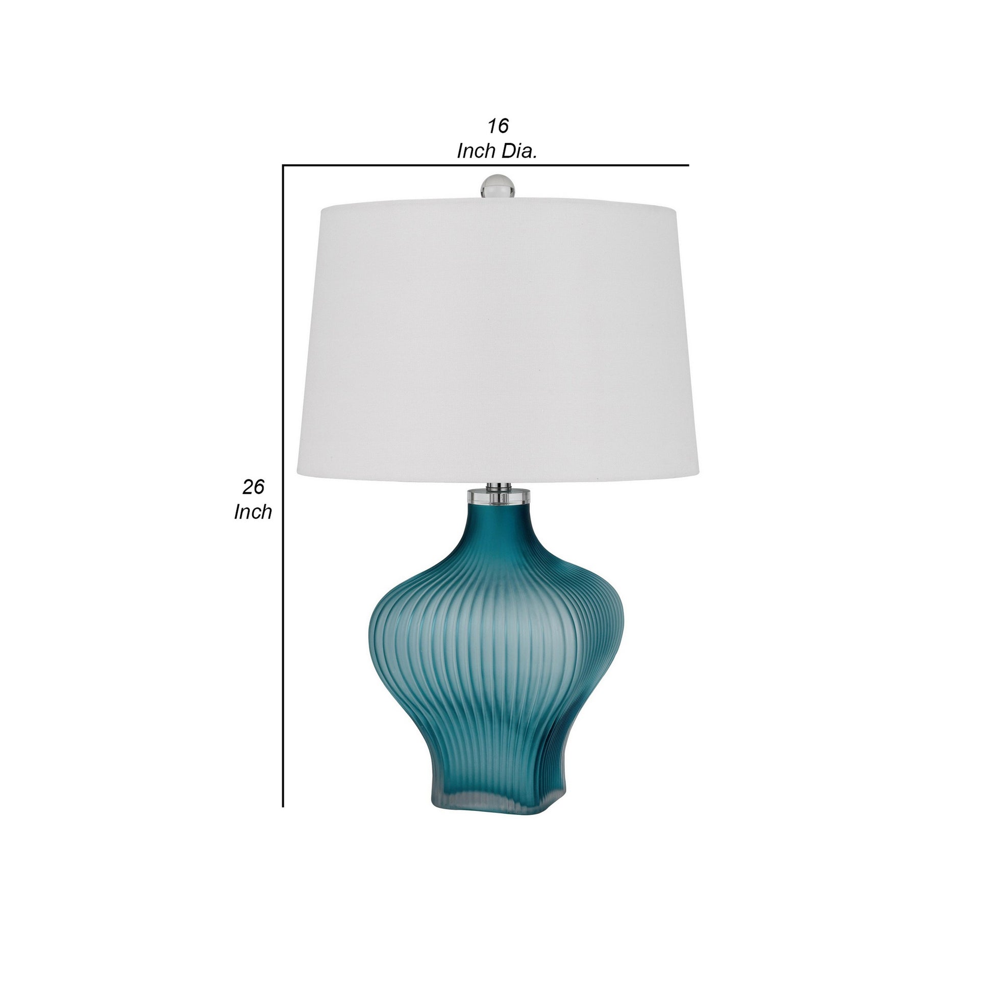 Crafted with contemporary, artistic style in mind, this accent table lamp is perfect for brightening up your living room, bedroom, or home office with warm light and a uniquely cool aesthetic. The organically shaped glass base has a beautiful fluted design in a calming aqua blue color, with a white hardback drum shade atop it that filters and softens light for a pleasant aura all evening long.