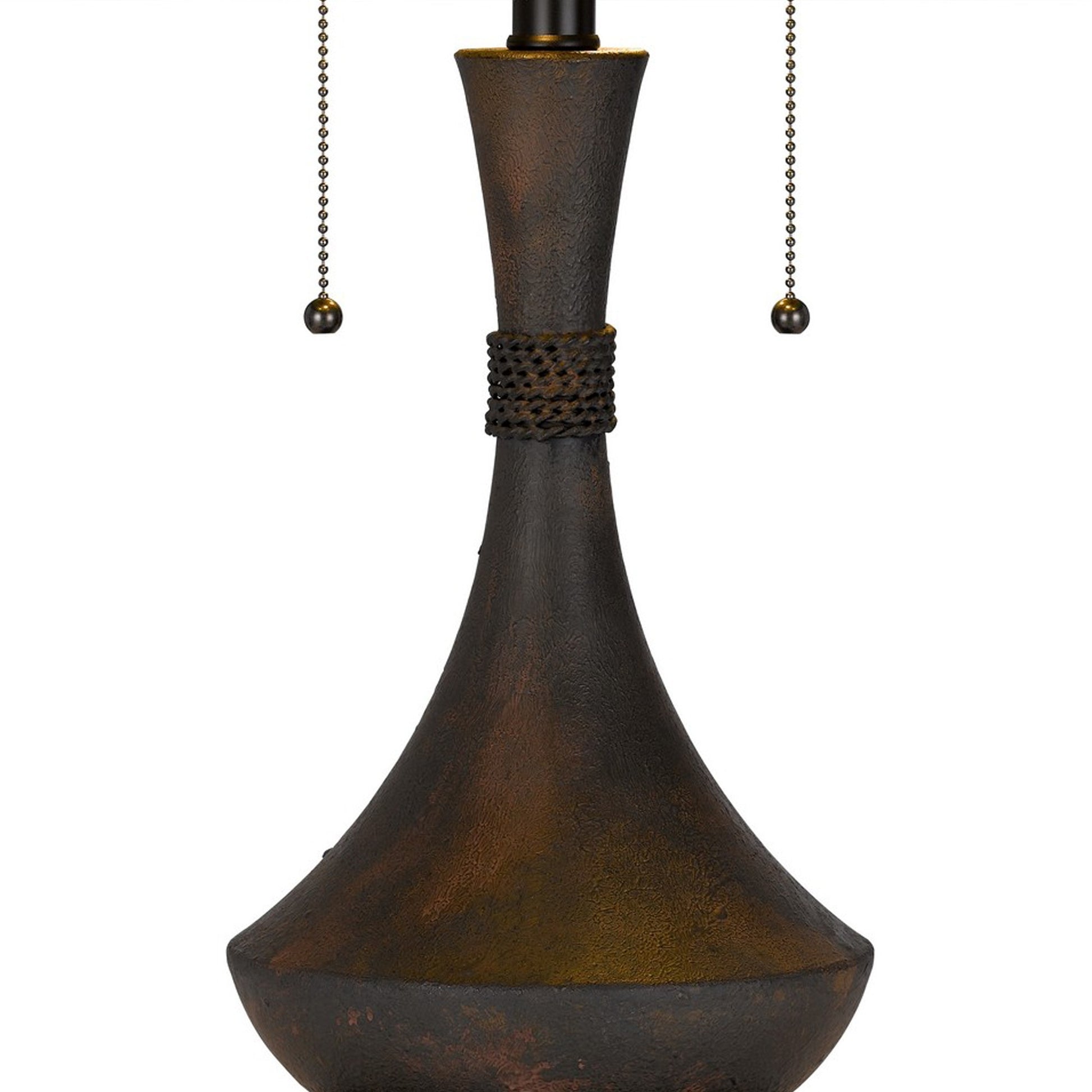 Bring home this artisanally designed table lamp to imbue your home with a striking sense of deep opulence and sophistication. Its round shade is painted with a stained green finish and has a bamboo woven border and wicker trim details. Meanwhile, its dark bronze textured body is supported on a sturdy platform base for a piece as durable and reliable as it is beautiful.