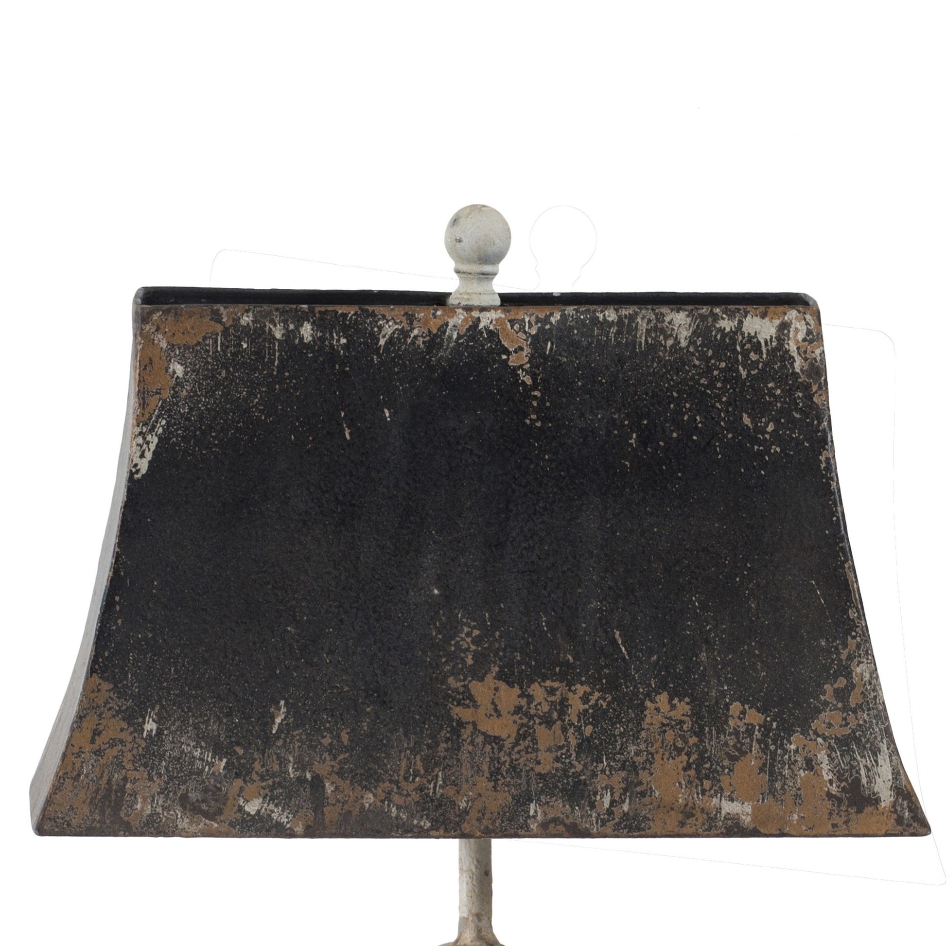 Perfect for adding a classically rustic character to your interior decor, this expertly crafted table lamp emanates a bold, salvaged aesthetic. With an angled square iron shade in an antique black finish, the rustic white fir wood frame depicts traditional carving with finial accents. The sturdy and durable molded trim base is the icing on the cake to this meticulously designed accent lamp.