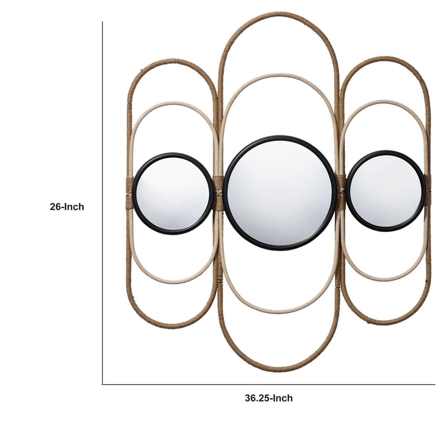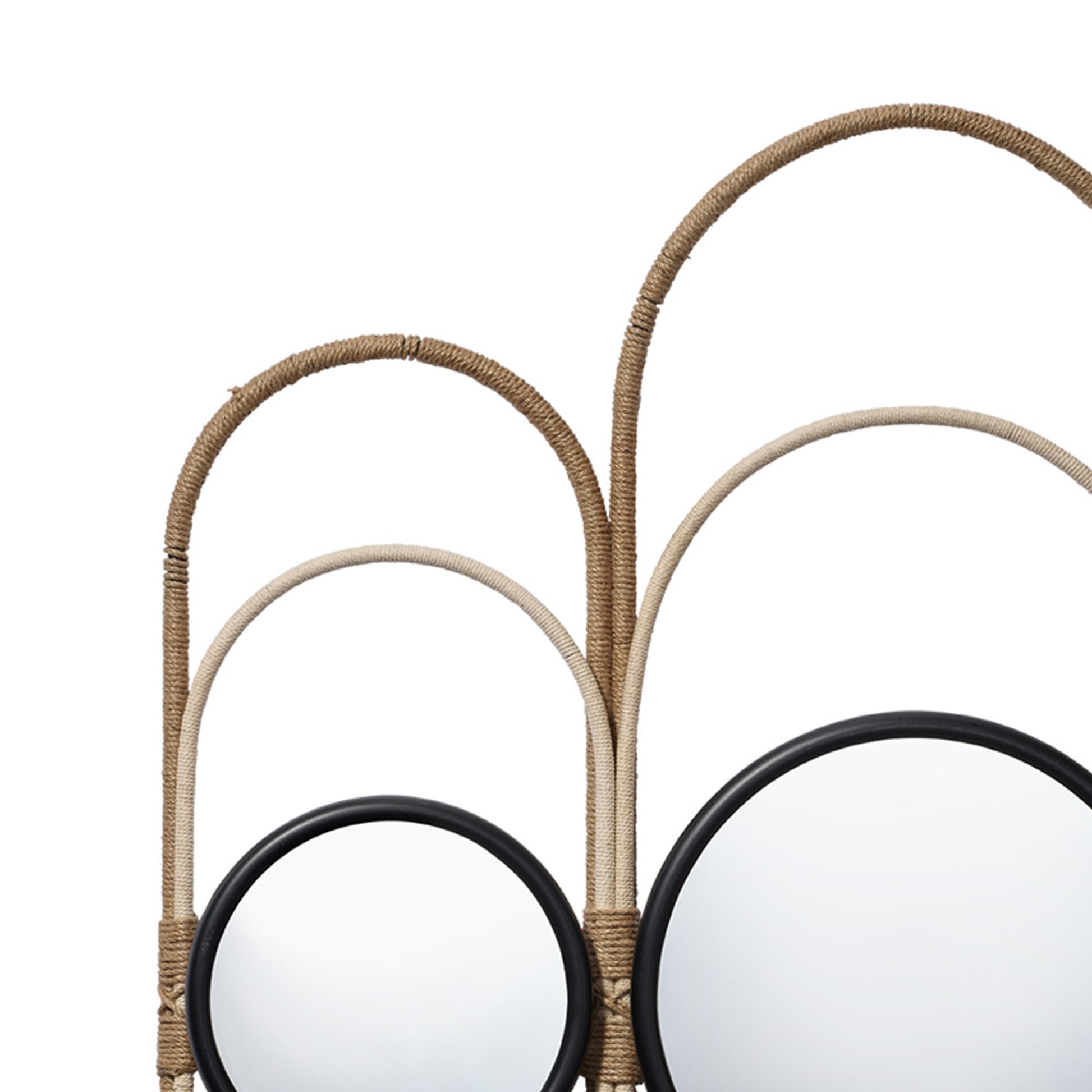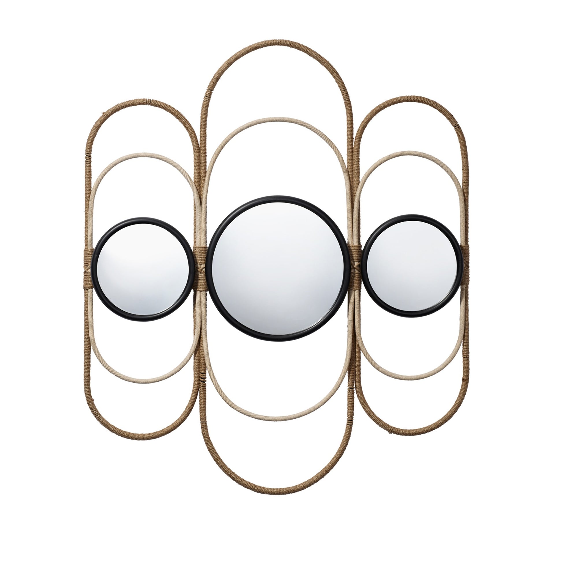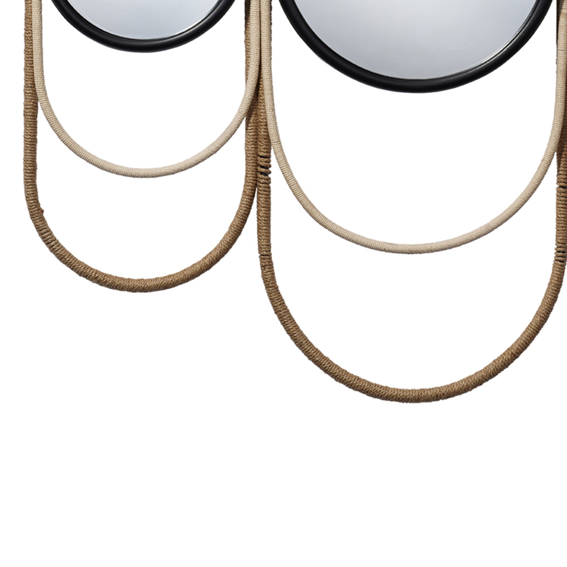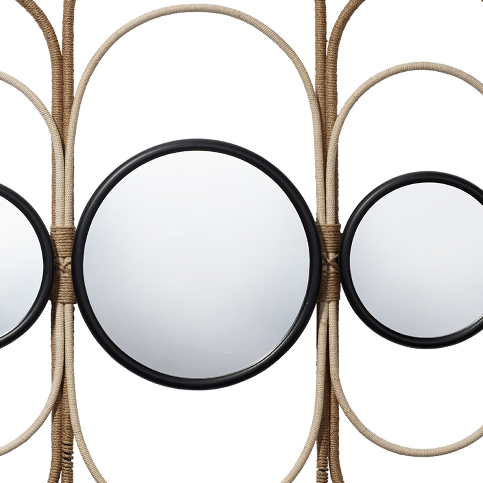 Effervescently modern and strikingly beautiful, this decorative mirror is not only distinct in its contemporary aesthetic, but also acts as a convenient means of quick self examinations and adding visual depth to any interior. Featuring three round, jet black frames and long oval accents, wrapped in natural brown jute rope, this is a great way to add a bohemian vibe to your living room or bedroom.