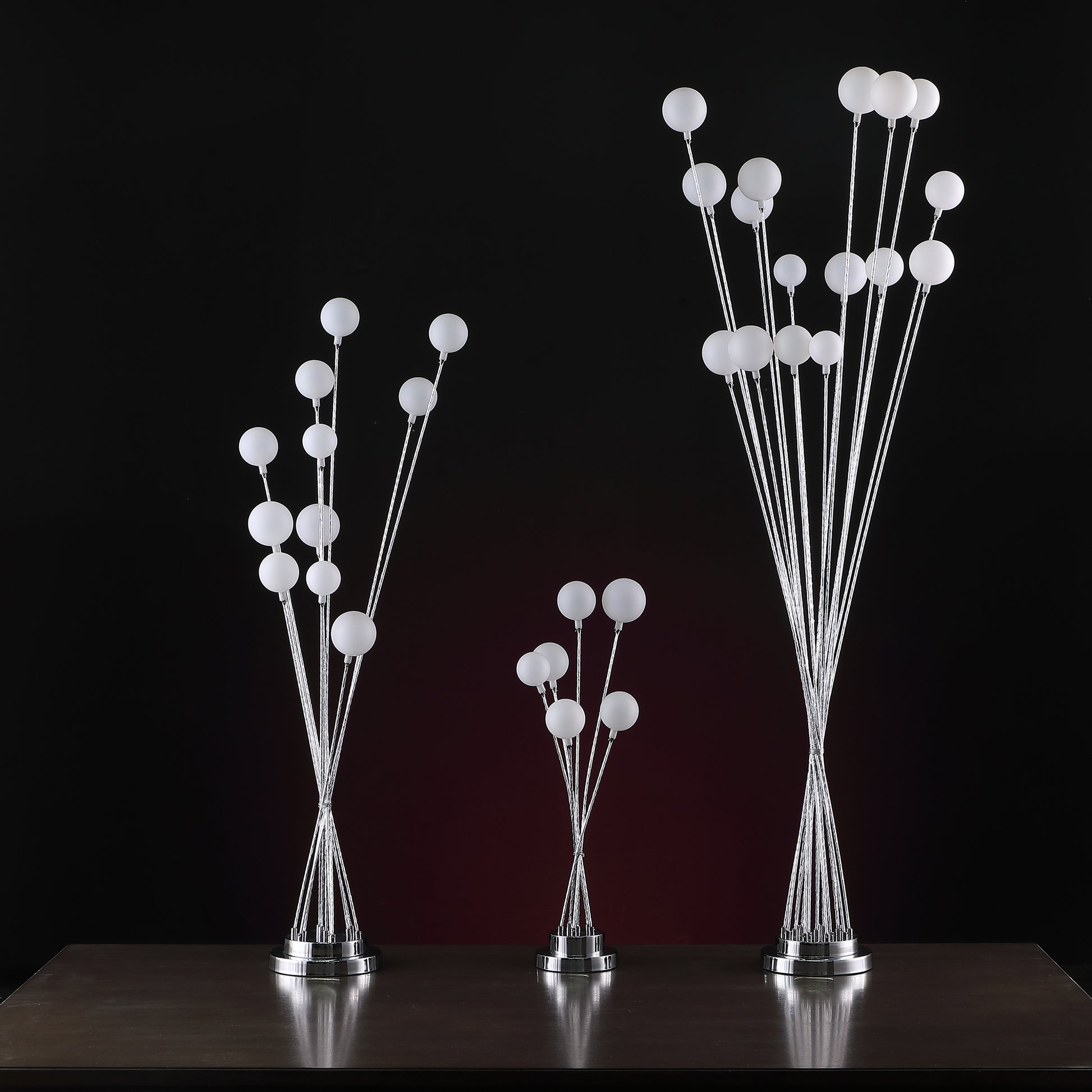 Add sculptural style with soft ambient lighting to your living room or bedroom with this white 6-Light frosted orbs table lamp. Featuring 1 large, 4 medium and 1 small white frosted acrylic orbs staggered along an aluminum hourglass shape tasseled together silver chrome stem, this light is full of contemporary and modern style. The Silver Chrome metal round base is solid and sturdy, adding sophisticated style. Introduce a stunning conversation starter into your home with this Chrysanthe Orb LED table lamp. Standing a majestic 27.5 inches high, this lamp boasts 6 globes or orbs position in different heights on a sleek aluminum tighten together to form a contemporary design that draws attention. Will bring you a romantic ambience, putting you in a better mood from relaxed to energetic to romantic. The in-line On/Off switch at the black cord give easy access in the dark, allowing this lamp to take center stage with a diffused floating light effect. Its slender design allows it to position well near seats, sofas, side tables, etc. Warm lights can bring you a sweet night, cool white lights can help you focus and allows you to get the most comfortable brightness for your space. Works in your bedroom as night light bedside lamp, any living spaces as mood lighting or anywhere else in your house.