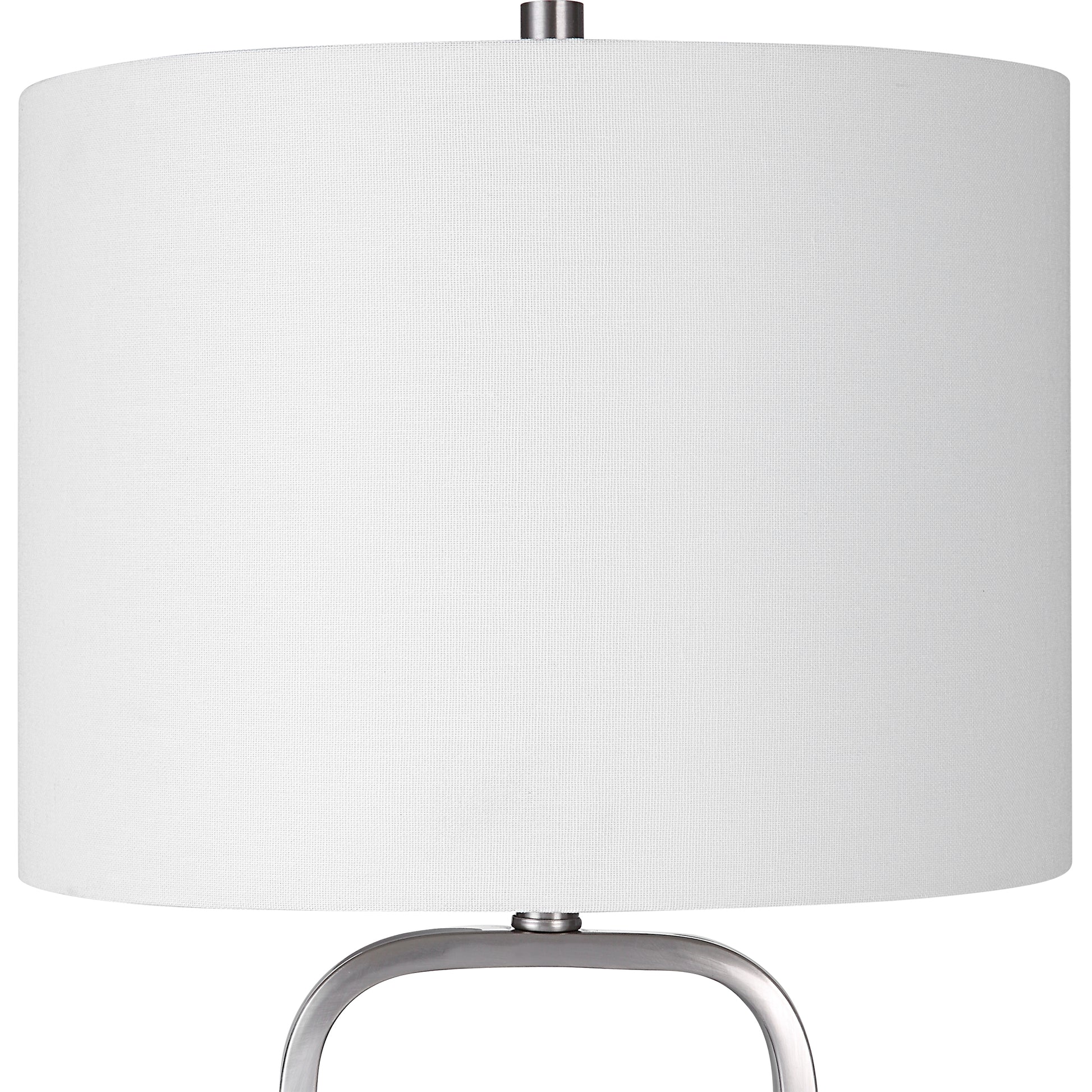 Fill any office, living room or bedroom with warm light with this gorgeous and modern table lamp. A thin rectangular center frame gives a feeling of openness to this unique piece while the sturdy metal base features a glimmering brushed nickel finish. The round linen fabric hardback shade sits atop the base and compliments the lamp perfectly.