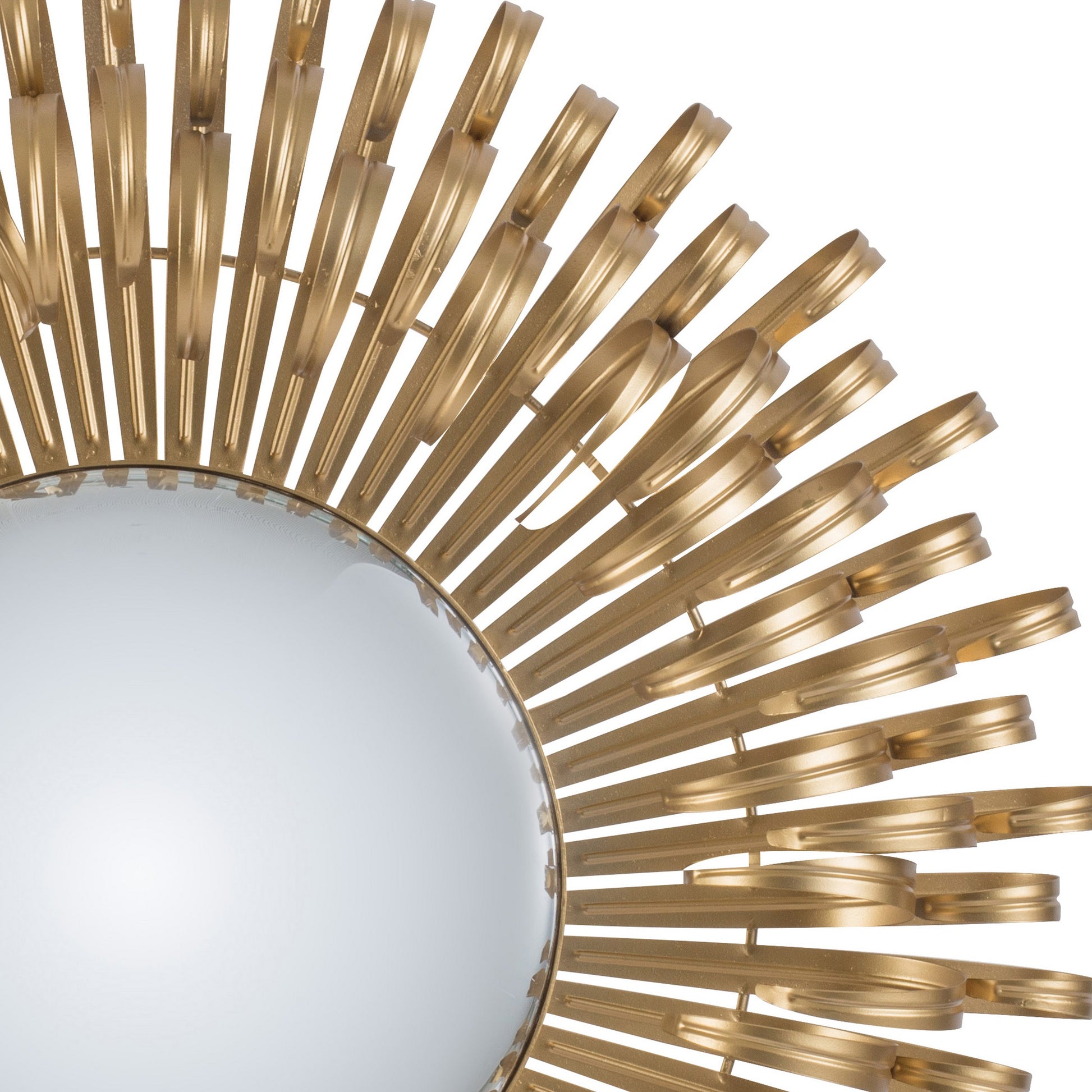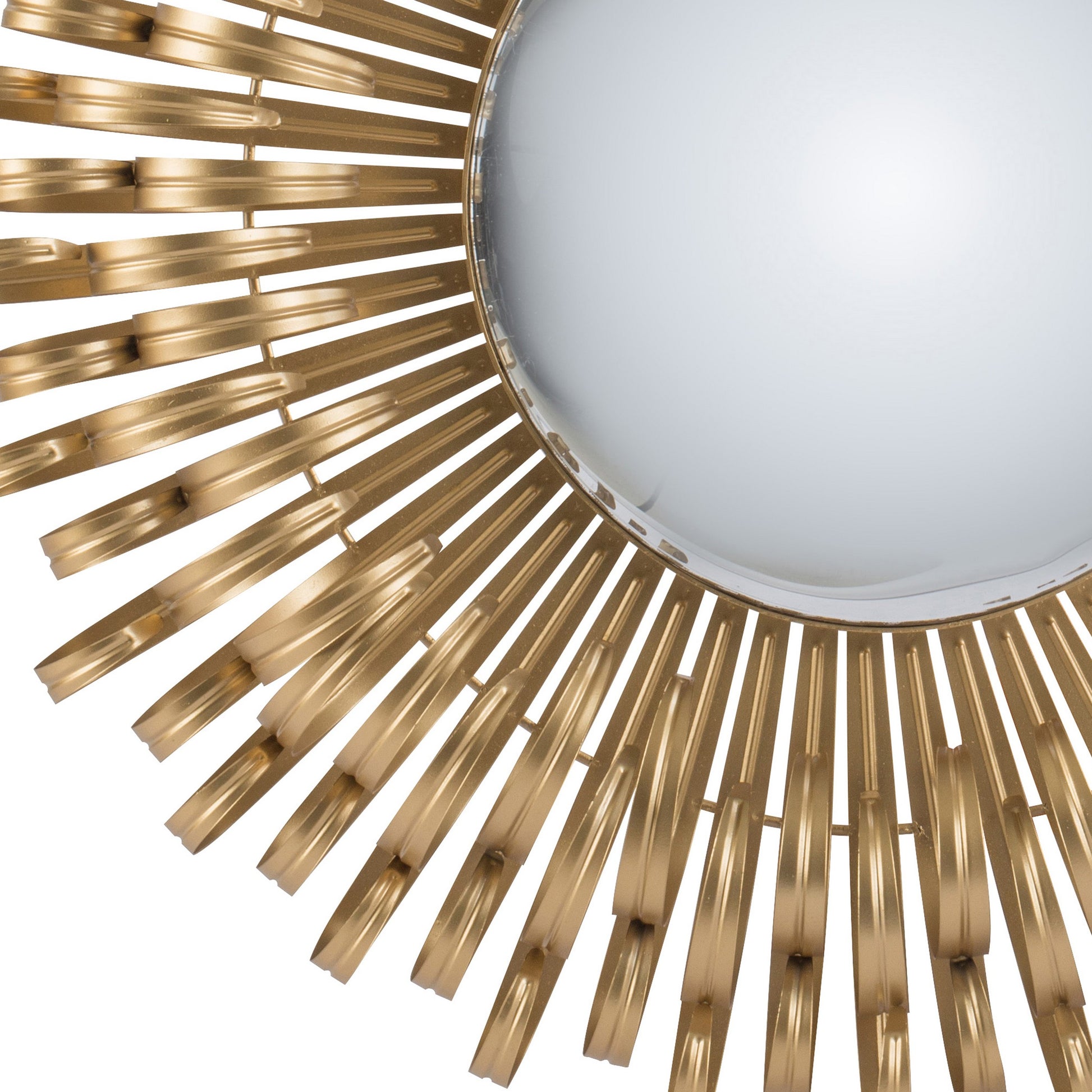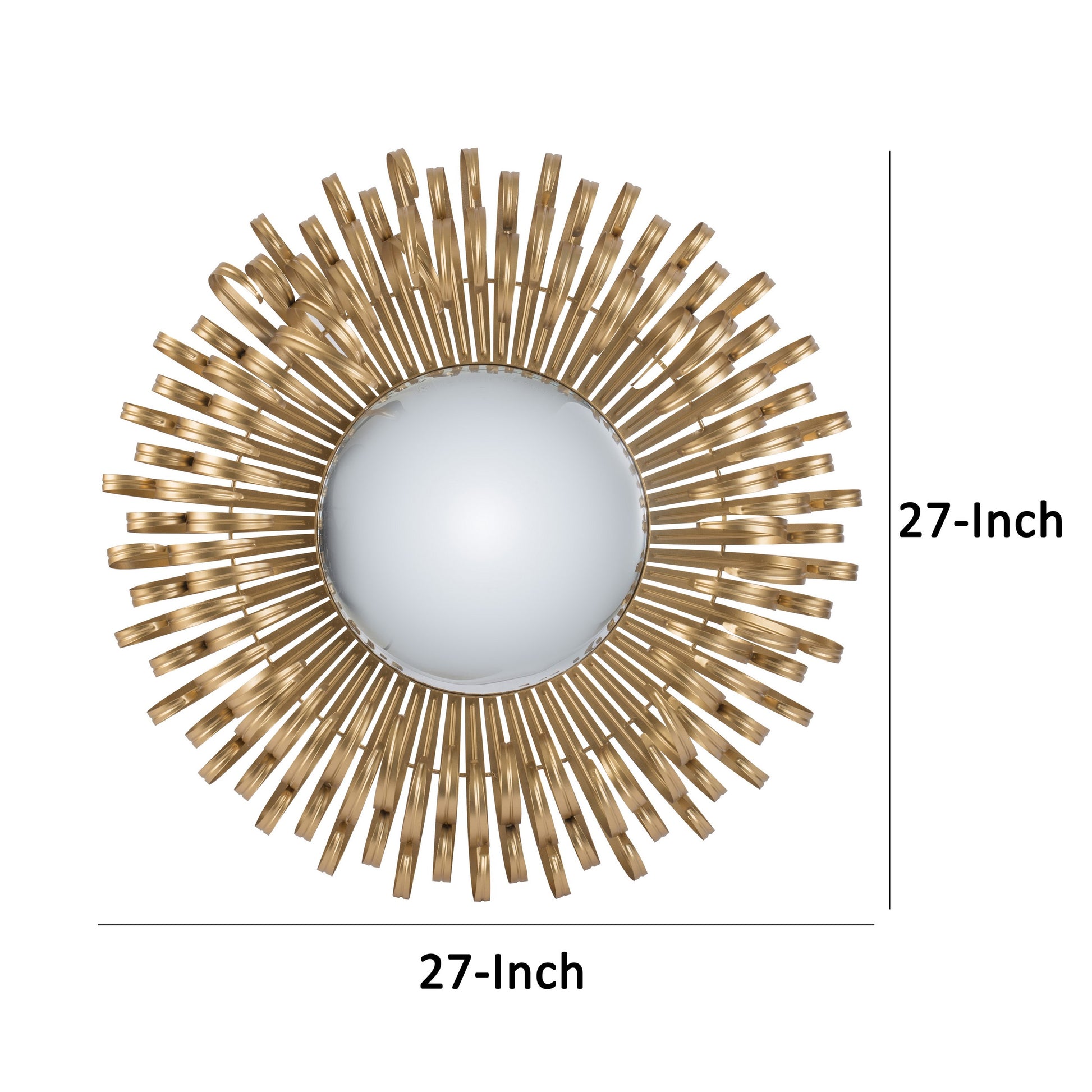 Contemporary aesthetics intersect with fine craftsmanship upon this expertly designed wall mounted accent decor. Artisanally crafted from a lightweight yet sturdy iron frame in a lustrous gold finish, the mirror accent complements the intricate sunburst design, making the piece perfect for hanging just above your console, mantelpiece, or on the walls of your living room, entryway, foyer, or den.