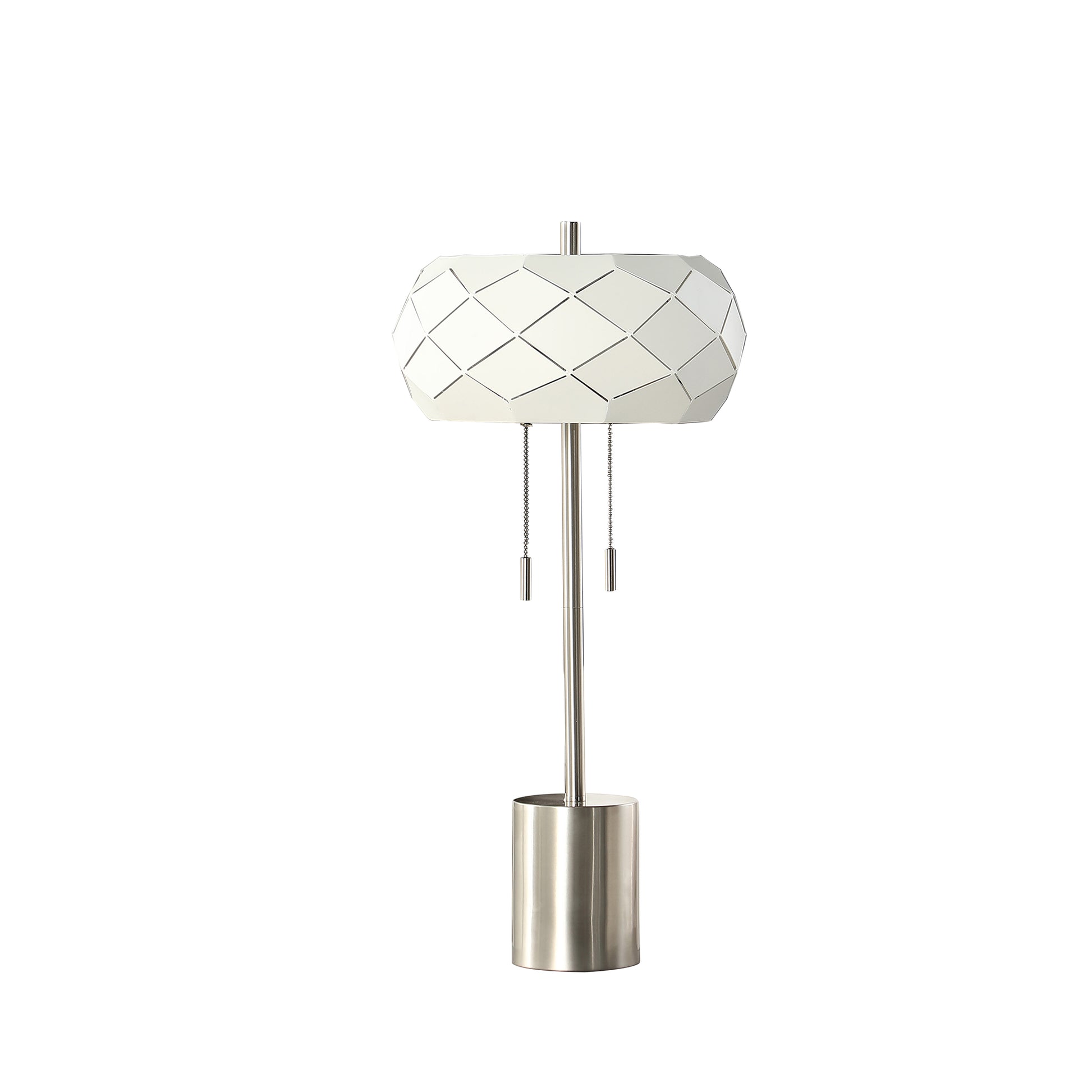 Featuring a cylindrical brushed silver metal base, this lamp perfectly captures a Mid-Century modern mood. Instill sophisticated style with this geometric cut-out laser cut metal white shade Legeme Mid Century table lamp with 2 pull-chain switch and brushed silver finish. This modern mid-century modern table lamp features a modern cylindrical metal base with a dramatic shade design. Elevate the elegance of a living area or bedroom with this Mid-Century Legeme metal table lamp. Adorned with a repeating cut-out geometric pattern, the lamp delivers a peekaboo light when lit. Its white pumpkin shape hardback laser cut shade and a 2 pcs Pull Chain switch create inviting illumination to the table lamp. The resulting look is full and rich with a texture that is both eye-catching and stylishly sculpted. It's topped with a laser cut round shade that provides a natural complement to the mid century motif.