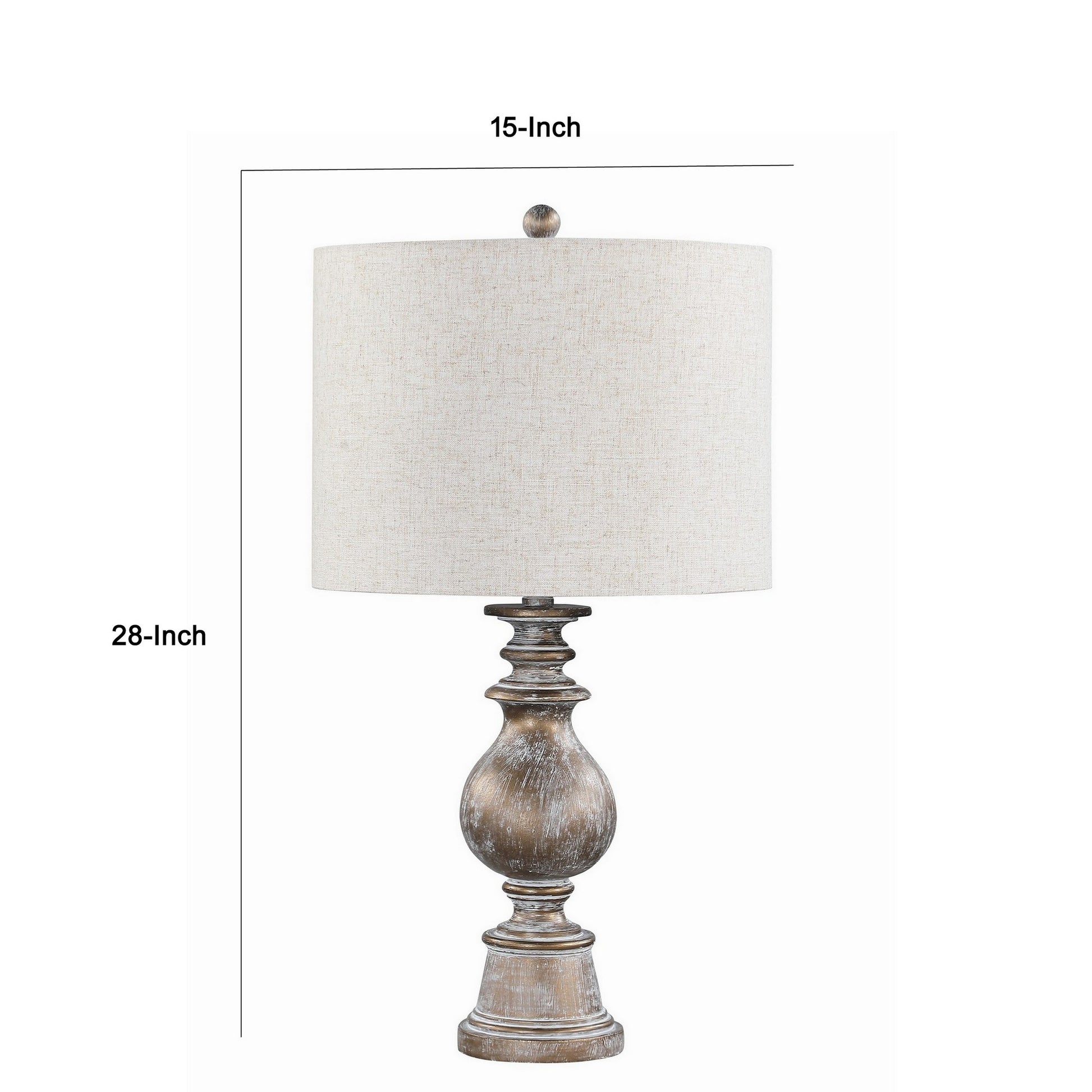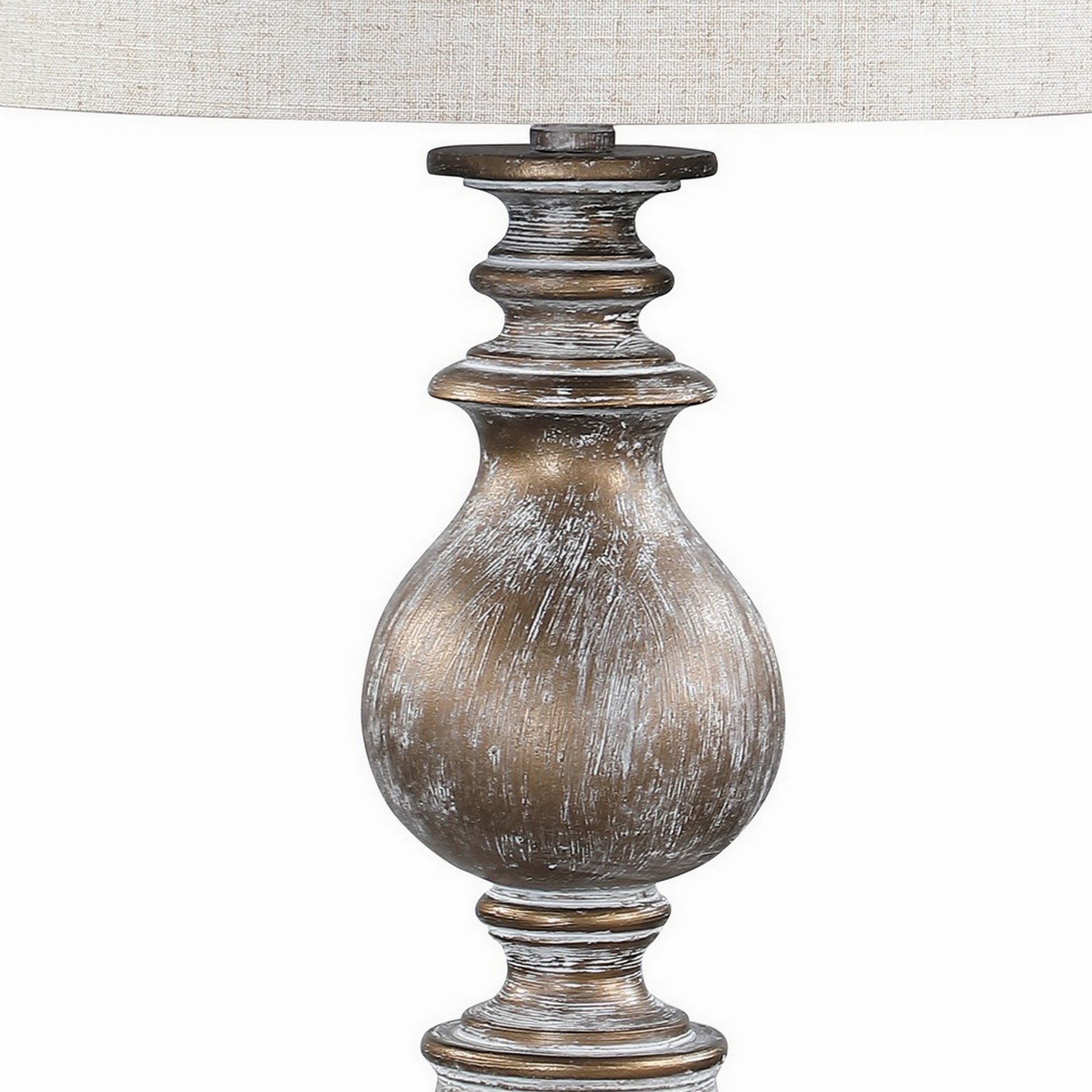 Our luxurious table lamp features a round drum shade made with oatmeal finished textured fabric for a warm, soft illumination. Its graceful metal body with a round base features a traditional design and antique gold finish for a distressed appearance, making it a rich accent piece of any modern interior.