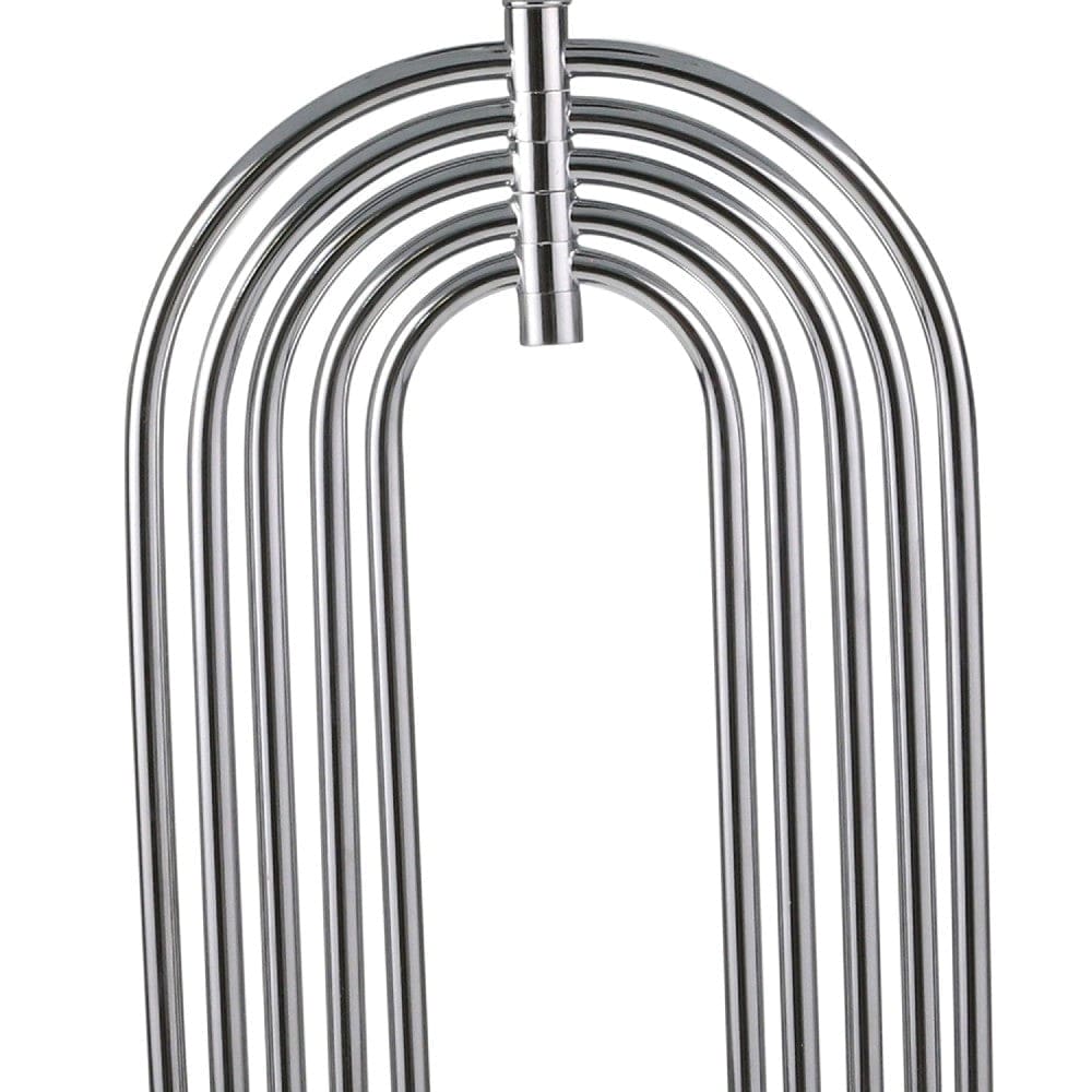 Introduce a ravishing flair of art deco style to your home with this abstract designed table lamp. This table lamp with a dome shade and multiple oblong shaped accents in the body represent a meticulously crafted piece that will always attract an eye for detail. The round shaped base offers stability and uniformity in the aesthetic of the piece. Overall this silver metal table lamp brings confidence to any bedroom or living room. Sold separately, looks great in a pair.