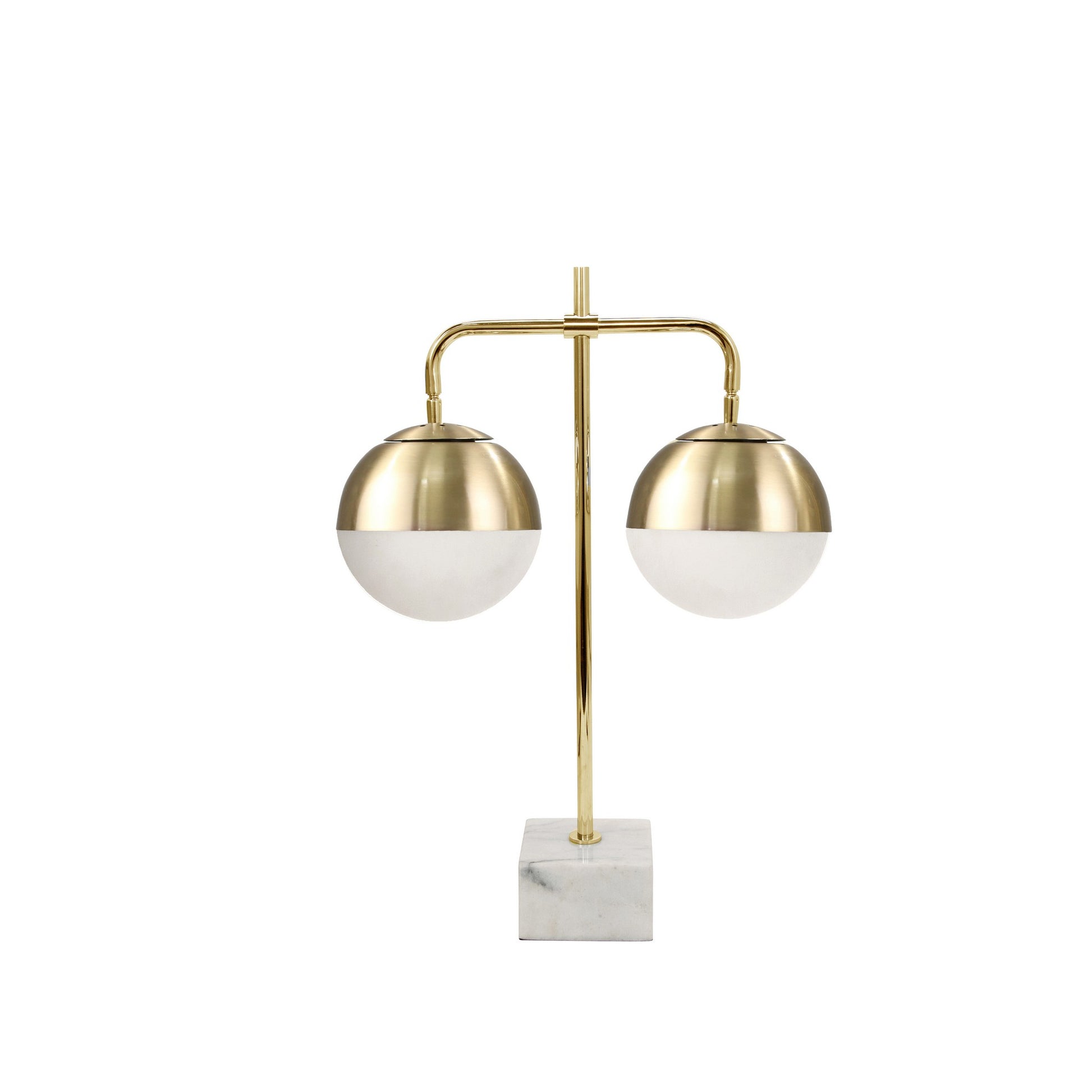 Stylish, unique, and easy on the eyes, this table lamp is ideal for heightening the functionality and style of your bedroom, living room, or home office desk. The stunning pedestal style base, finished in a crisp white marble, adds a charming flair to its surroundings while the two striking globes, accented in gold and white, perfectly illuminate your space with soft, inviting light.