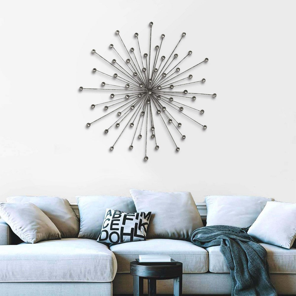 28 Inch Round Iron Sunburst Wall Decor Spokes Ball Accent Silver