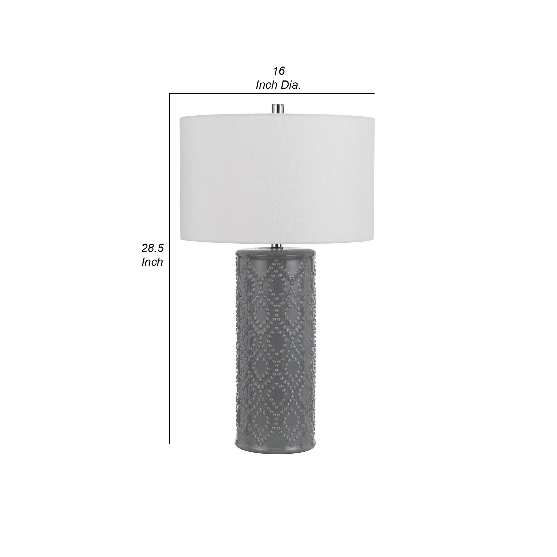 Striking, attractive, and uniquely crafted, this accent table lamp, available in a set of two, brings charm to any interior space of your home. Featuring a studded pattern ceramic base, the piece has a three way dimmer switch and a white hardback fabric drum shaped shade to filter light for a versatile application in both relaxing and work intensive times alike.