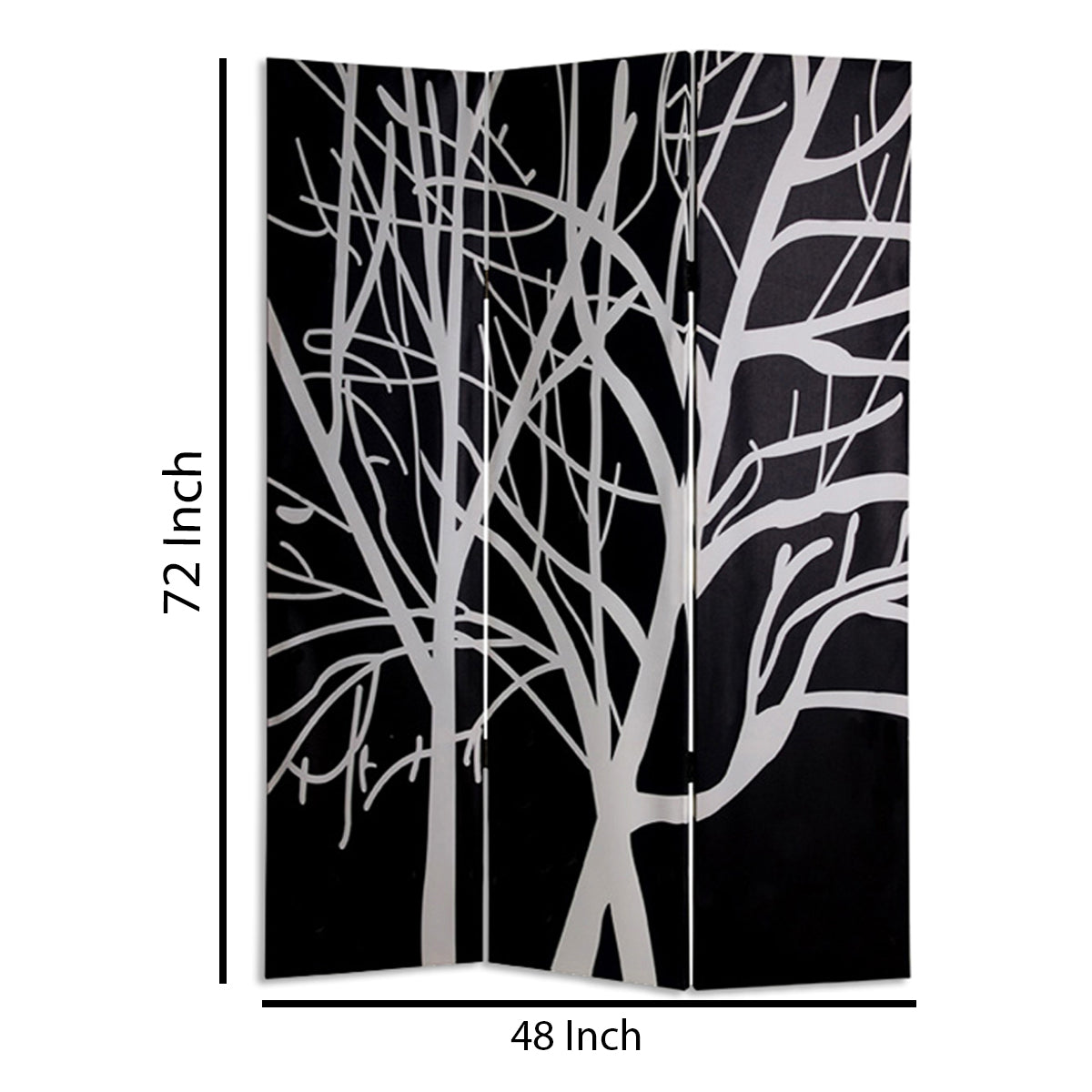 3 Panel Canvas Room Divider with Branch Pattern, Black and White