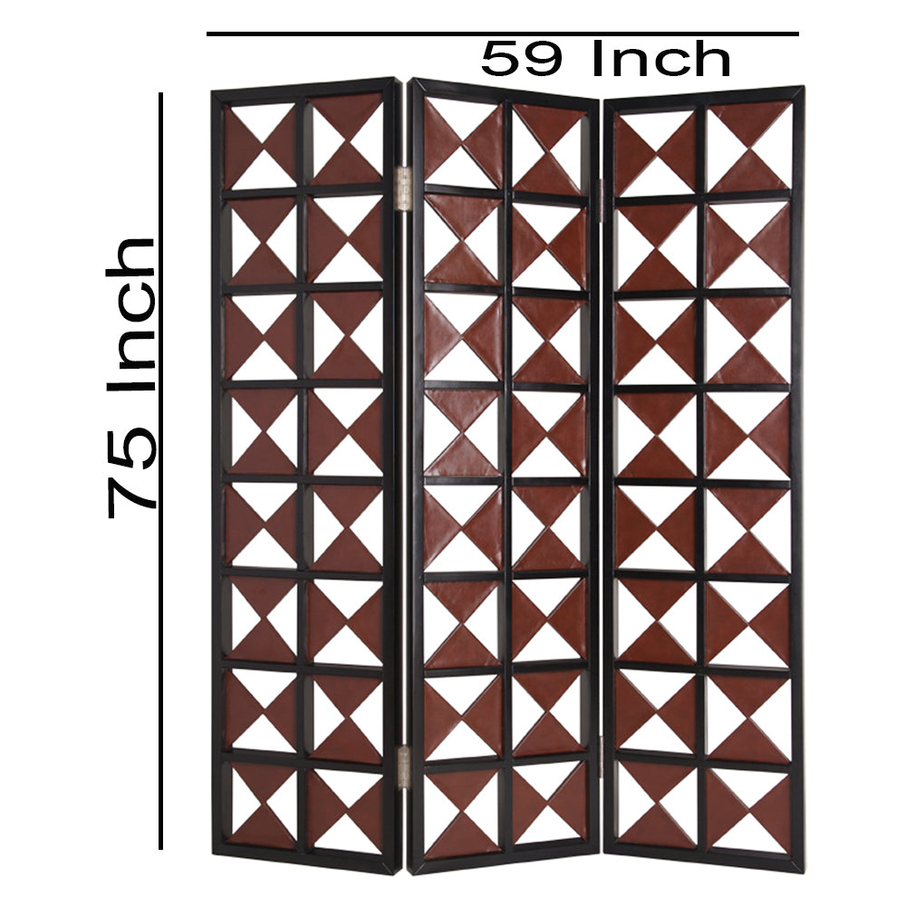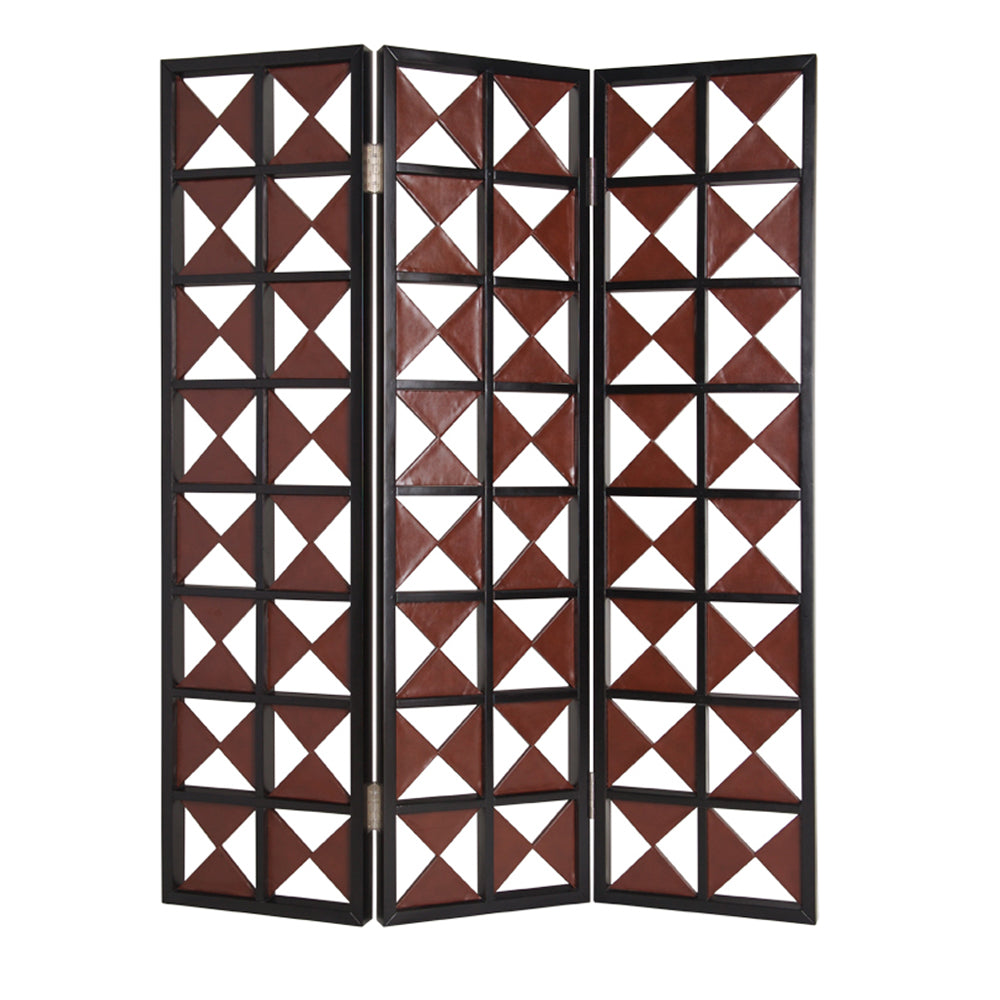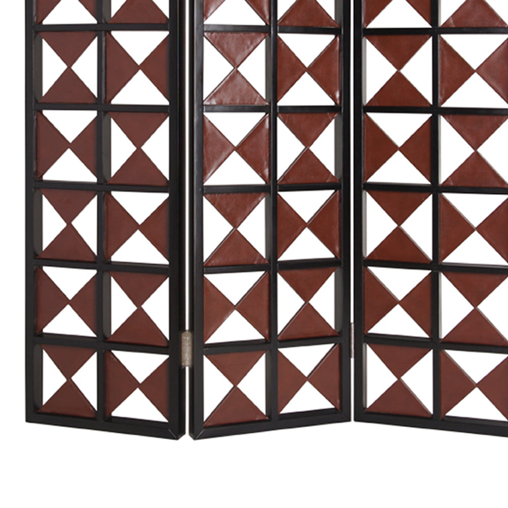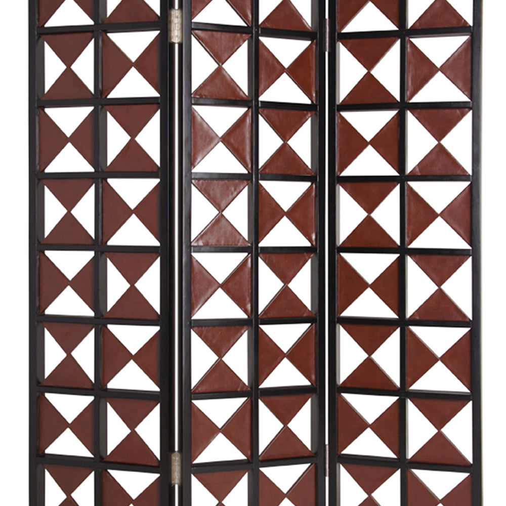 Enrich your personal space with the addition of this screen divider. It is constructed from durable wood and upholstered in faux leather, featuring a symmetric triangle pattern with cut out details that accentuate its style. The structure makes it an ideal option for your living room, it will embellish your existing decor.