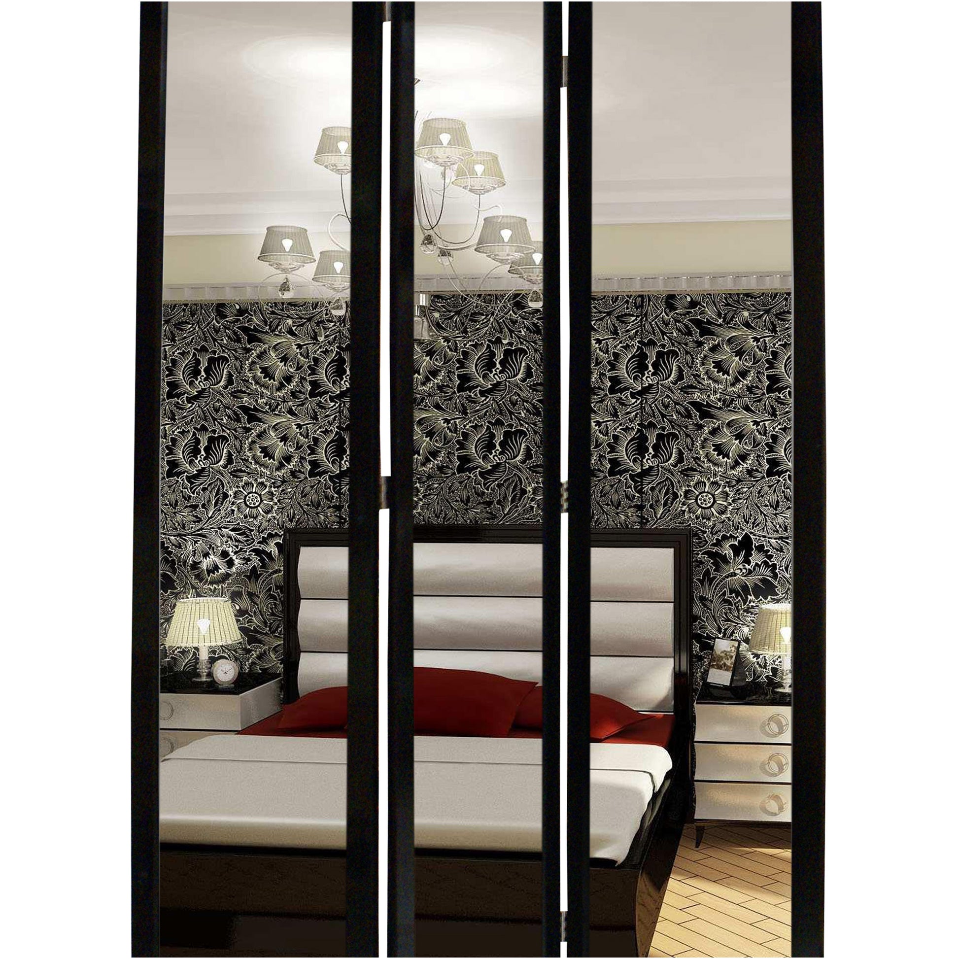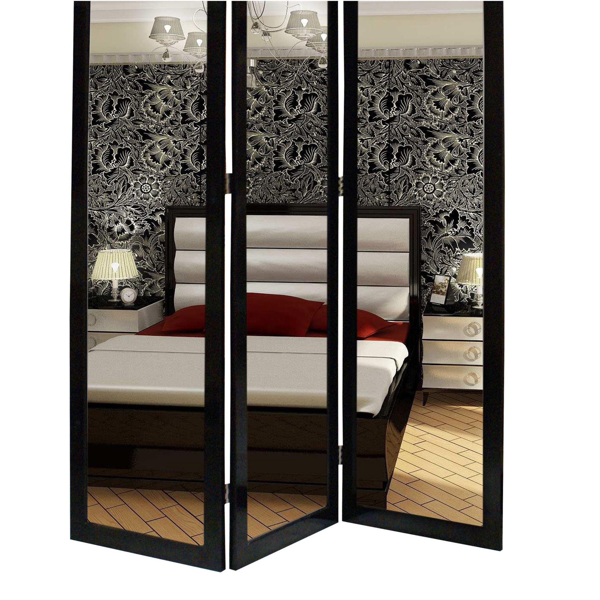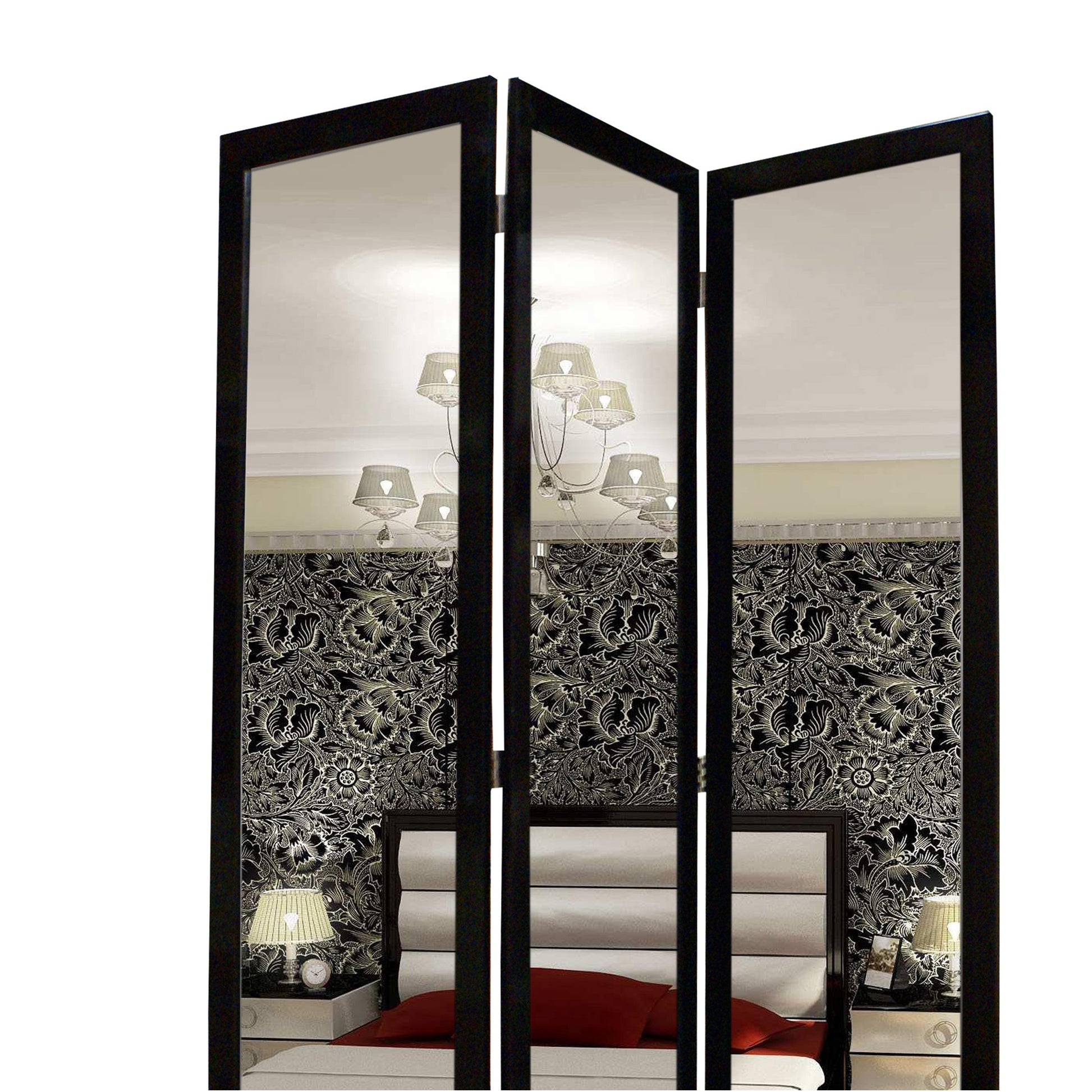 3 Panel Wooden Foldable Mirror Encasing Room Divider, Black and Silver