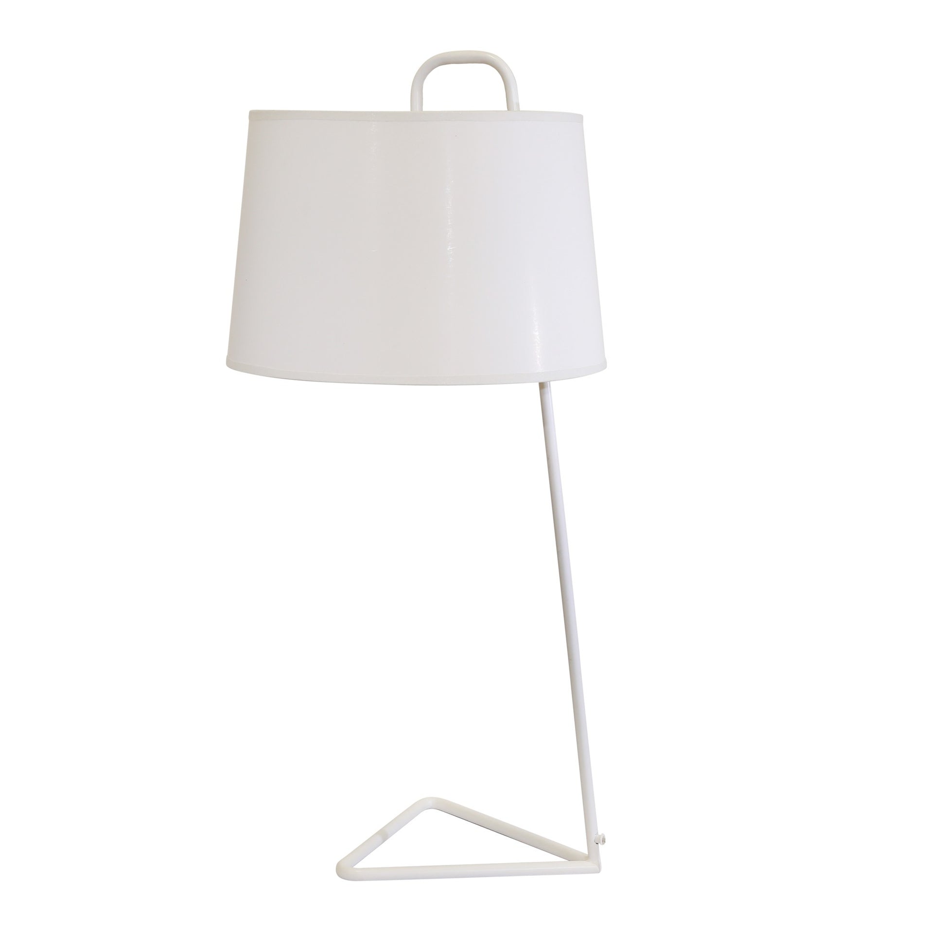 This exquisitely modern table lamp is guaranteed to fill your home with a tranquil, contemporary aesthetic. Made with sturdy yet lightweight metal, it comes included with a crisp white lampshade and a uniquely designed trangular metal base, making it a bedroom or living room accent that blends in perfectly to the modern home while acting as a striking and eye catching light source.
