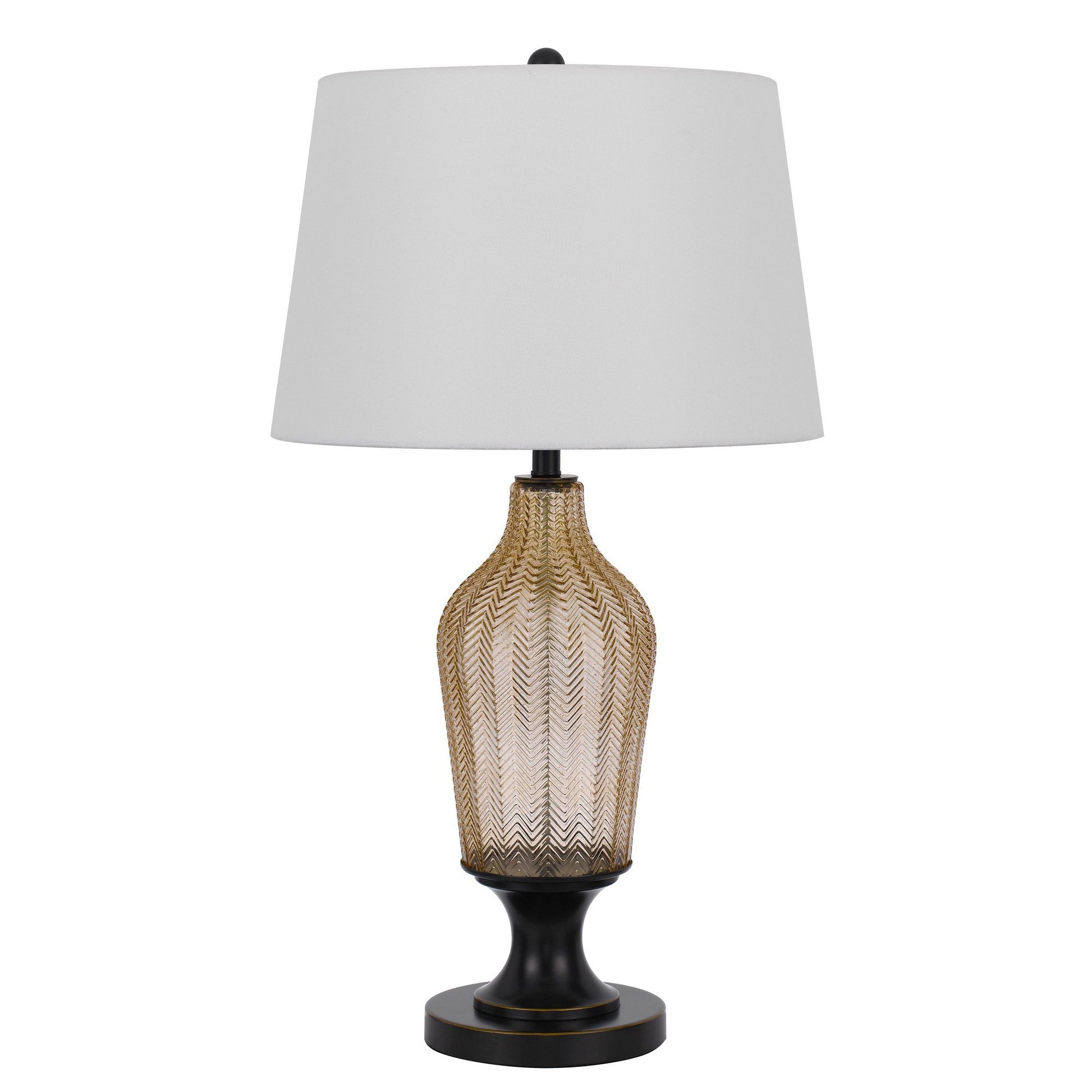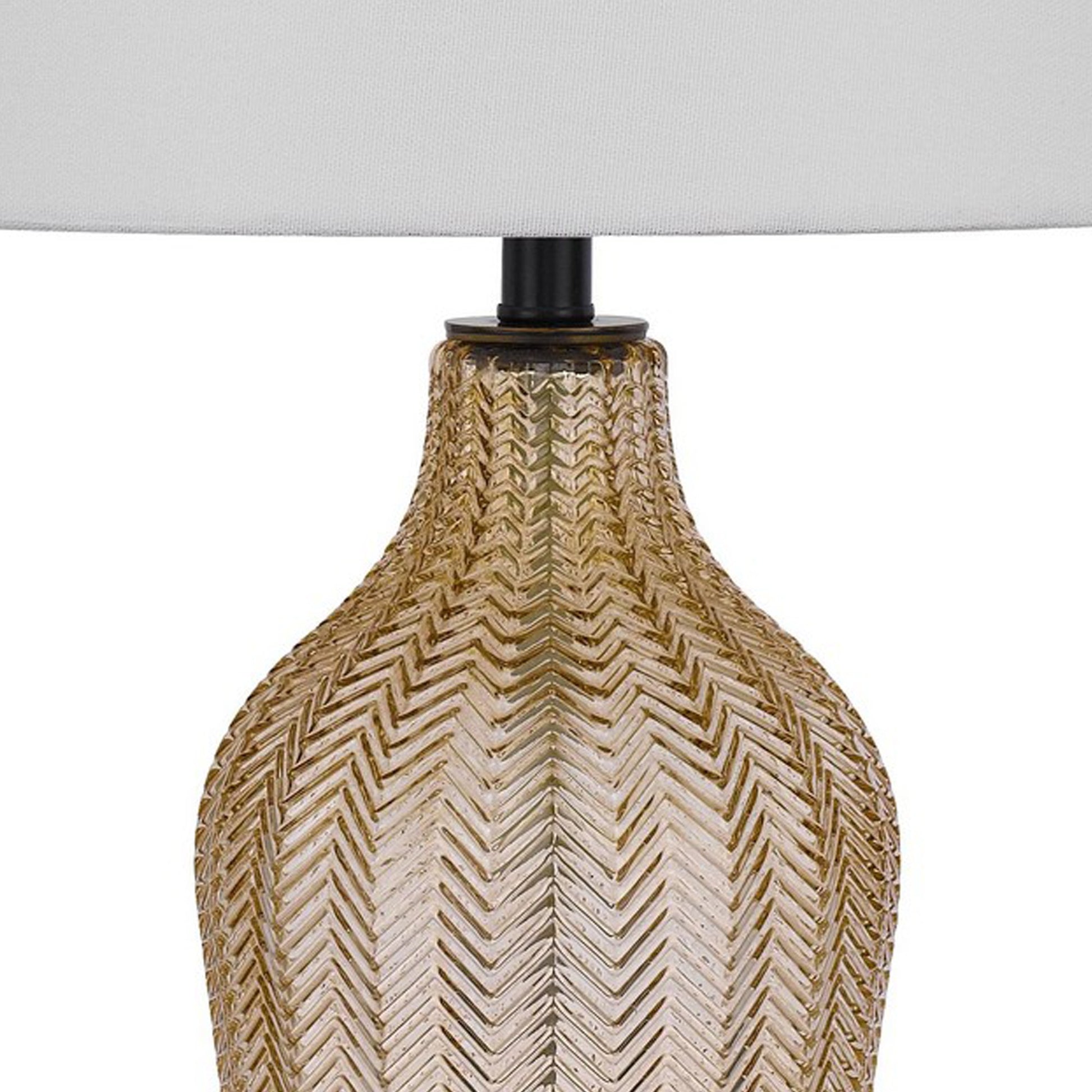 Striking and uniquely crafted, this table lamp brings well lit charm to any space in your home. Featuring a textured chevron patterned glass body and a sturdy black pedestal stand, the piece comes equipped with a three way dimmer switch and round fabric shade for softening light and making your interior a relaxing and aesthetically pleasing place to be.