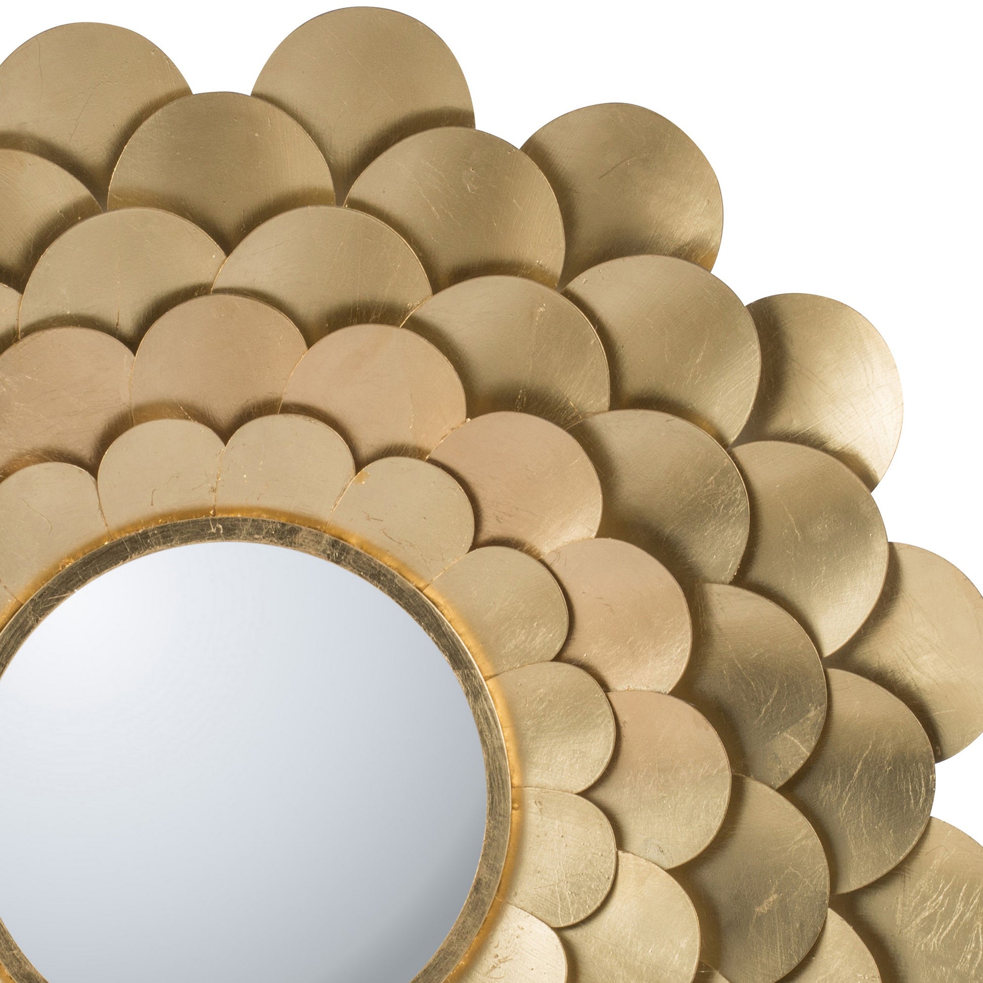 Artisanally designed, this blooming flower wall mount mirror is, itself, a piece of true art. With an intricate overlaid petal design, it is made from a sturdy iron frame. Hang this mirror in your foyer, hall, or living room for a warm and inviting look. With a radiating gold tone finish, this meticulously designed piece goes well with a variety of decor styles from classical to contemporary.