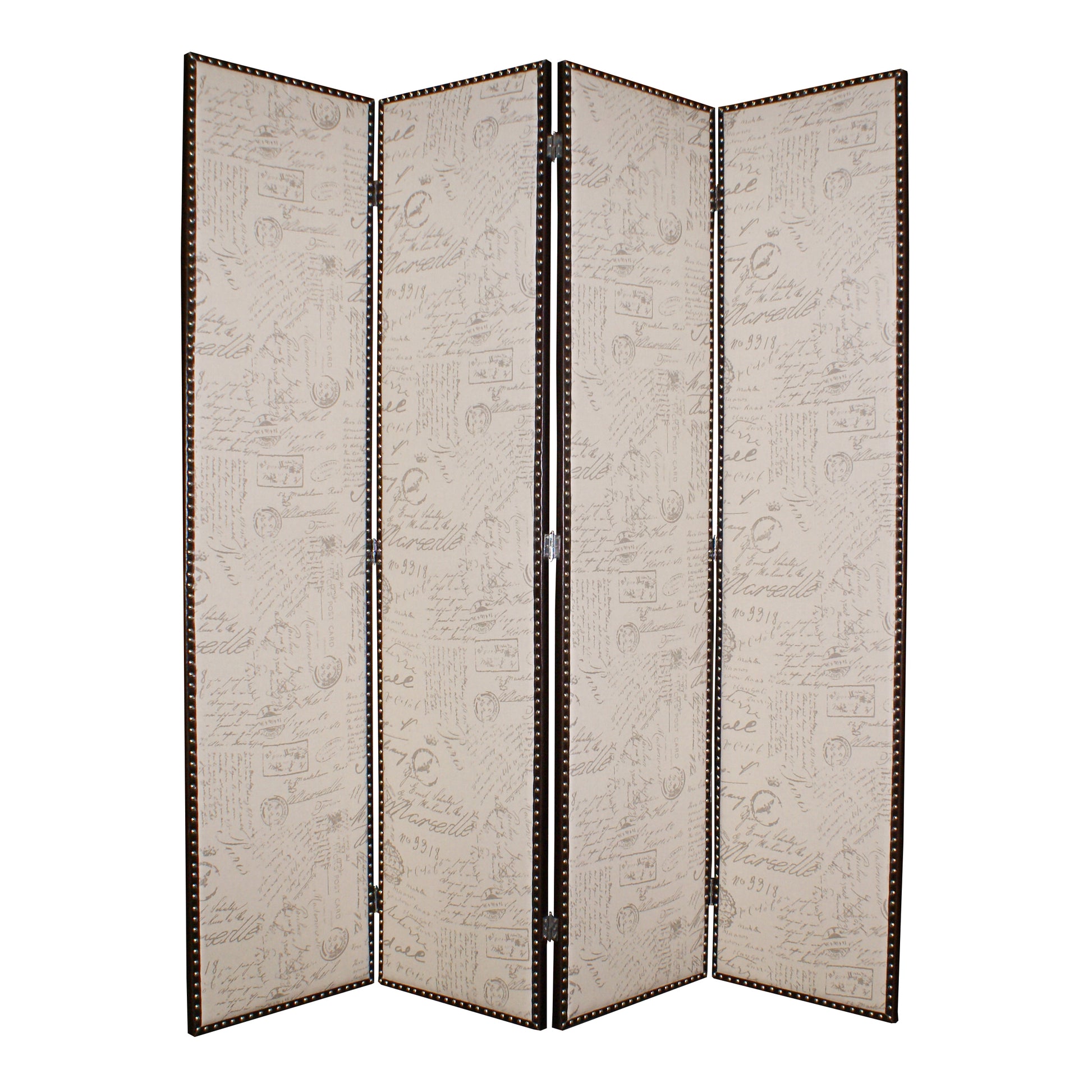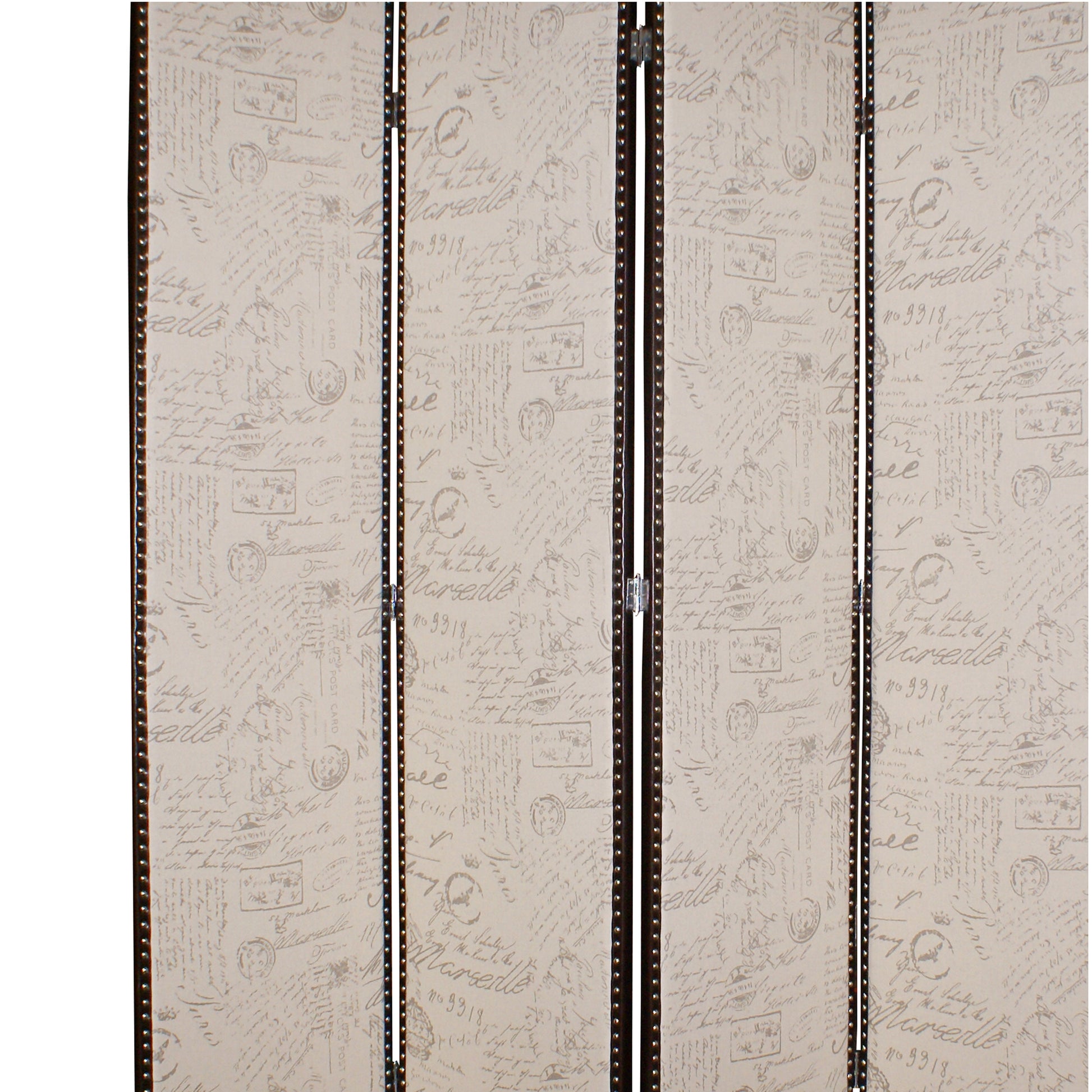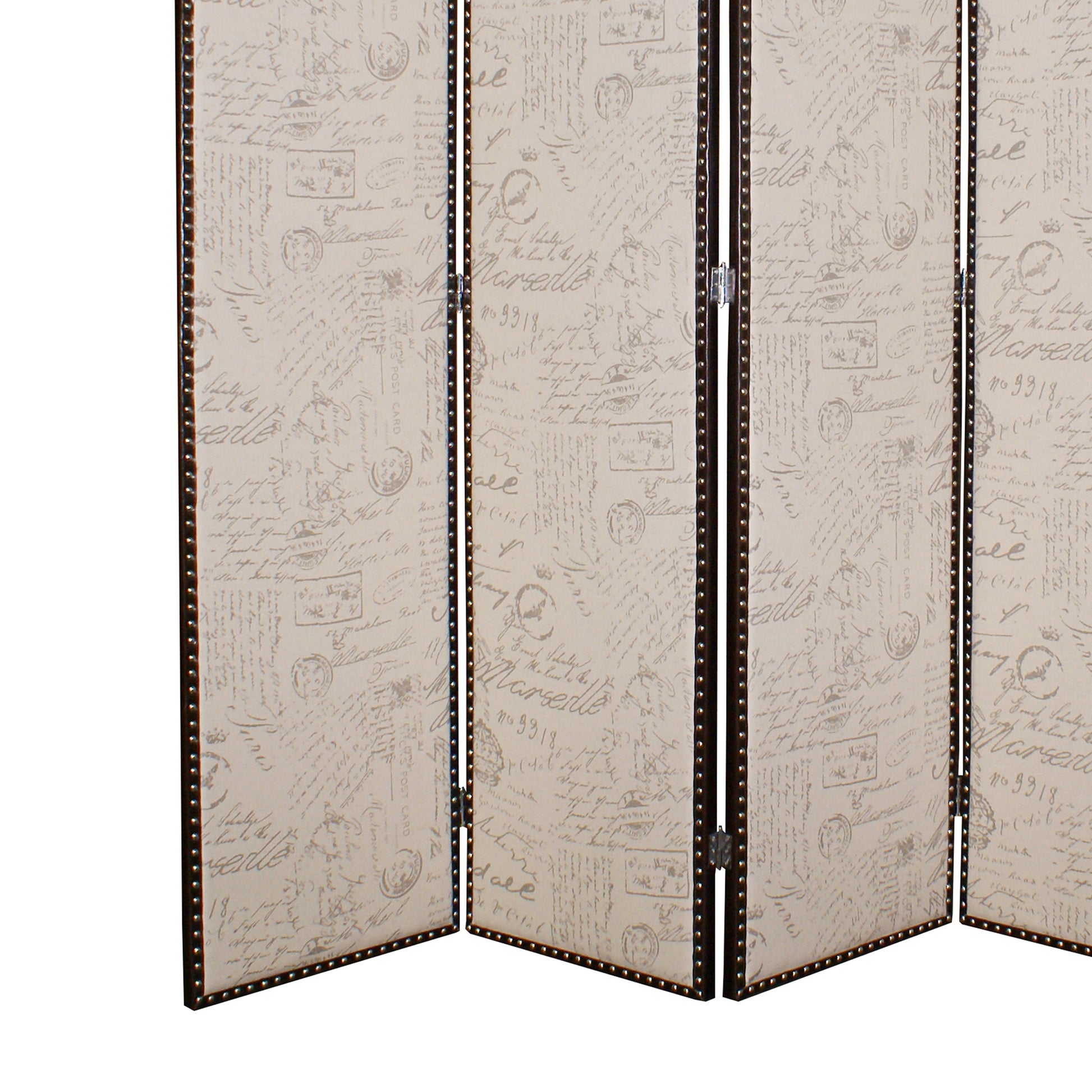 Fill in your space with this wooden constructed Room Divider. It has 4 scripted fabric covered panels and accented with nailhead trim around the edges which enhances the look. The metal hinges facilitate easy foldability, when not in use. This can be used to divide the large area or to create a private space in your home.