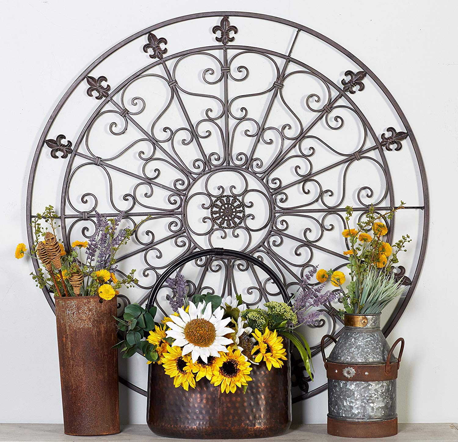 Intricately designed in perfect symmetry, this medallion shaped metal wall mount accent decor makes an elegant fit for your foyer, living room, hall, den, or bedroom. Featuring a clean lined round silhouette, this artisanal piece is crafted from a lightweight yet sturdy metal frame in an antique black finish for a look that matches any decor style. The swirl and Fleur De Lis accents impart a unique glamour and a timeless elegance to it. A perfect fit for a wide variety of decor styles, multiple color schemes, or themes, this piece makes a striking presence in your home.