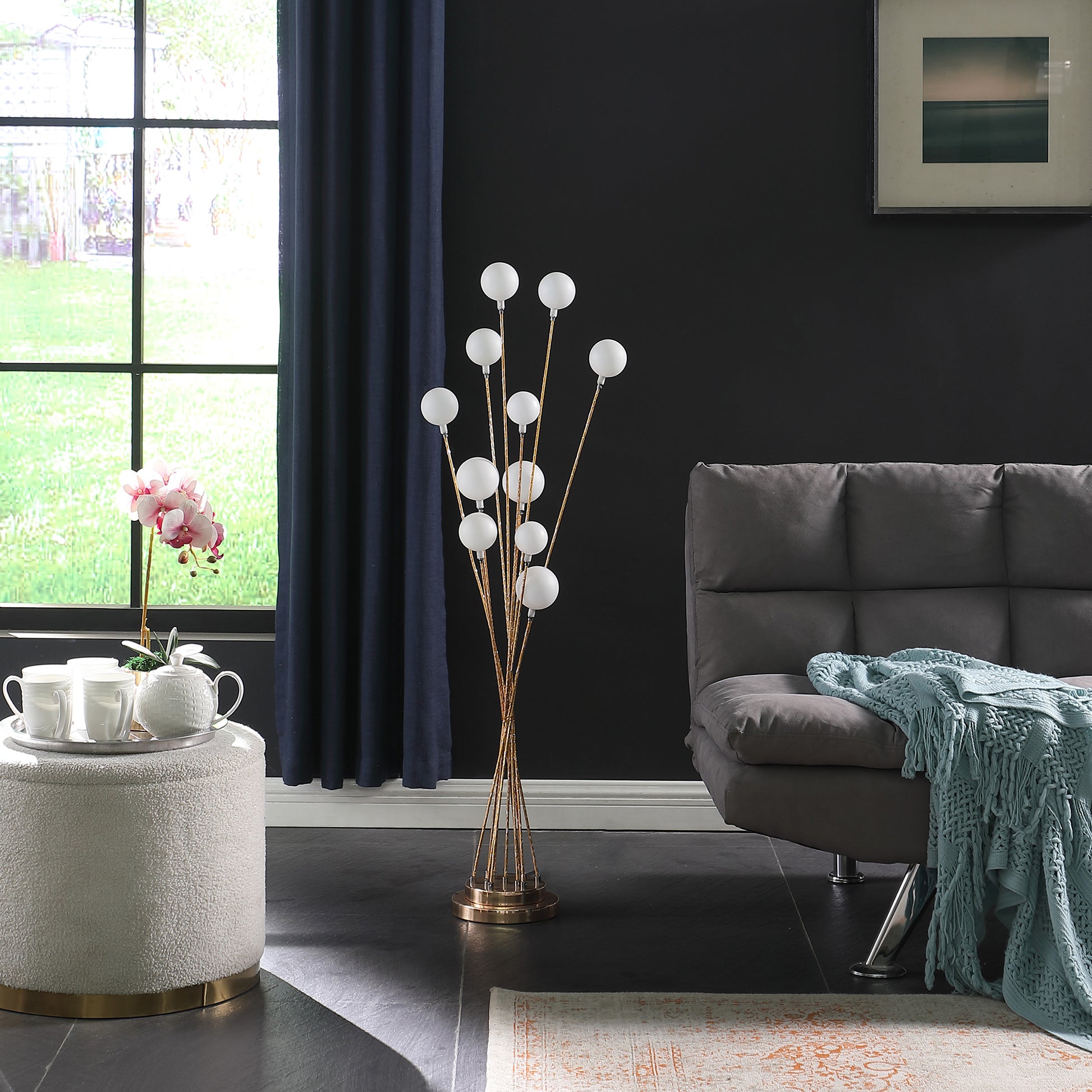 The 11-Light Multi-Arm Floor Lamp is an elegant way to infuse some fun and light into your spaces. Standing a majestic 46 inches high, this lamp boasts eleven white glass orbs or buds on a sleek aluminum wire hourglass bundled together to form a contemporary design that draws attention. Will bring you a romantic ambience, putting you in a better mood from relaxed to energetic to romantic. Our modern floor lamp fits easily behind your furniture. Its slender design allows it to position well near seats, sofas, side tables, etc. It's a great alternative to unpleasant overhead lights. Warm lights can bring you a sweet night, cool white lights can help you focus and a step-on switch allows you to get the most comfortable brightness for your space. Works in your bedroom as floor light lamp, any living spaces as mood lighting or anywhere else in your house. A simple round base supports a sleek, beautifully finished stem that branches out to support an array of glass globes in different heights above it. Much like an artfully arranged bundle of flowers in a modern design, each at a slightly different height. Diffusing an even layer of illumination, this contemporary composition is a lovely addition to spaces, capturing the eye and complementing a range of décor and design styles.