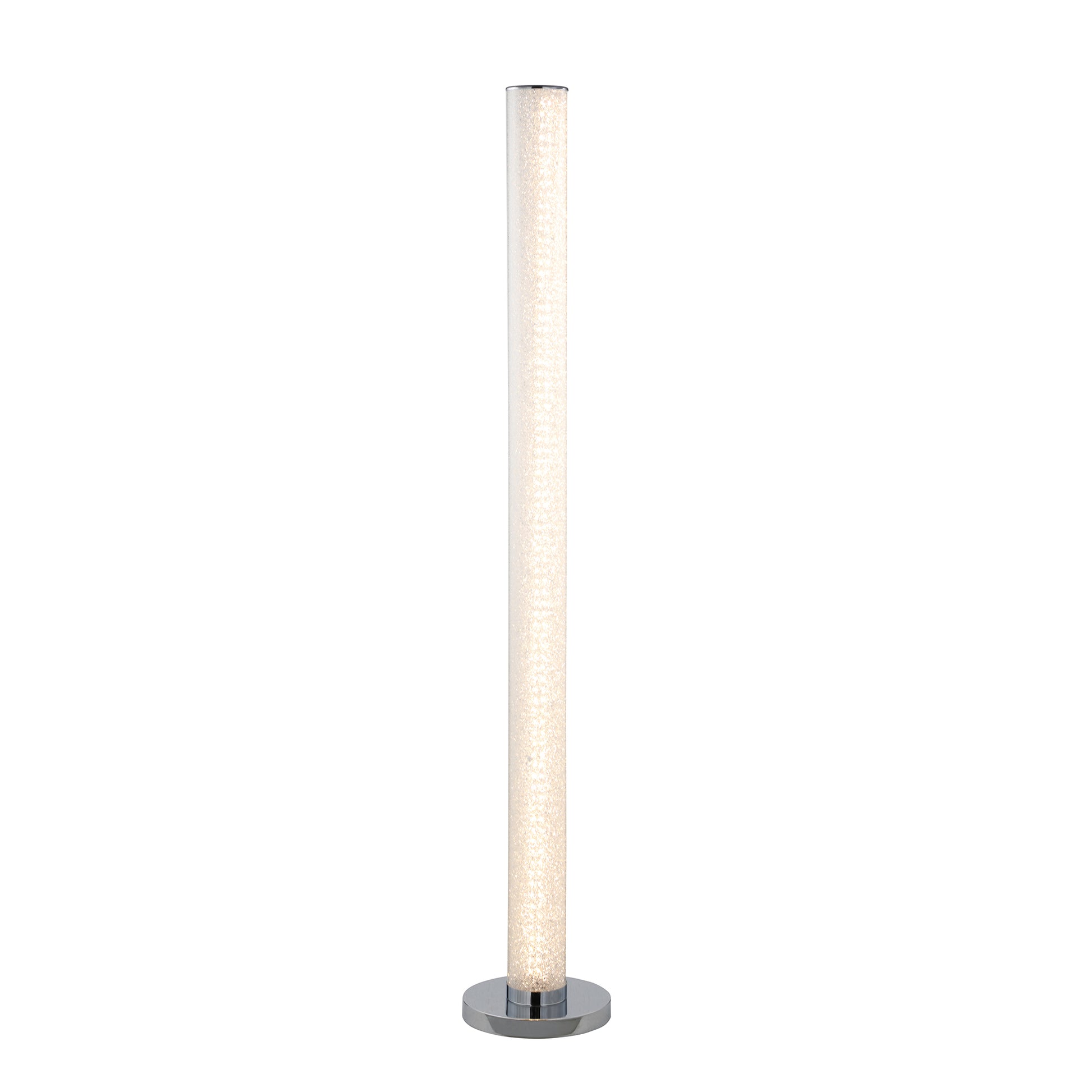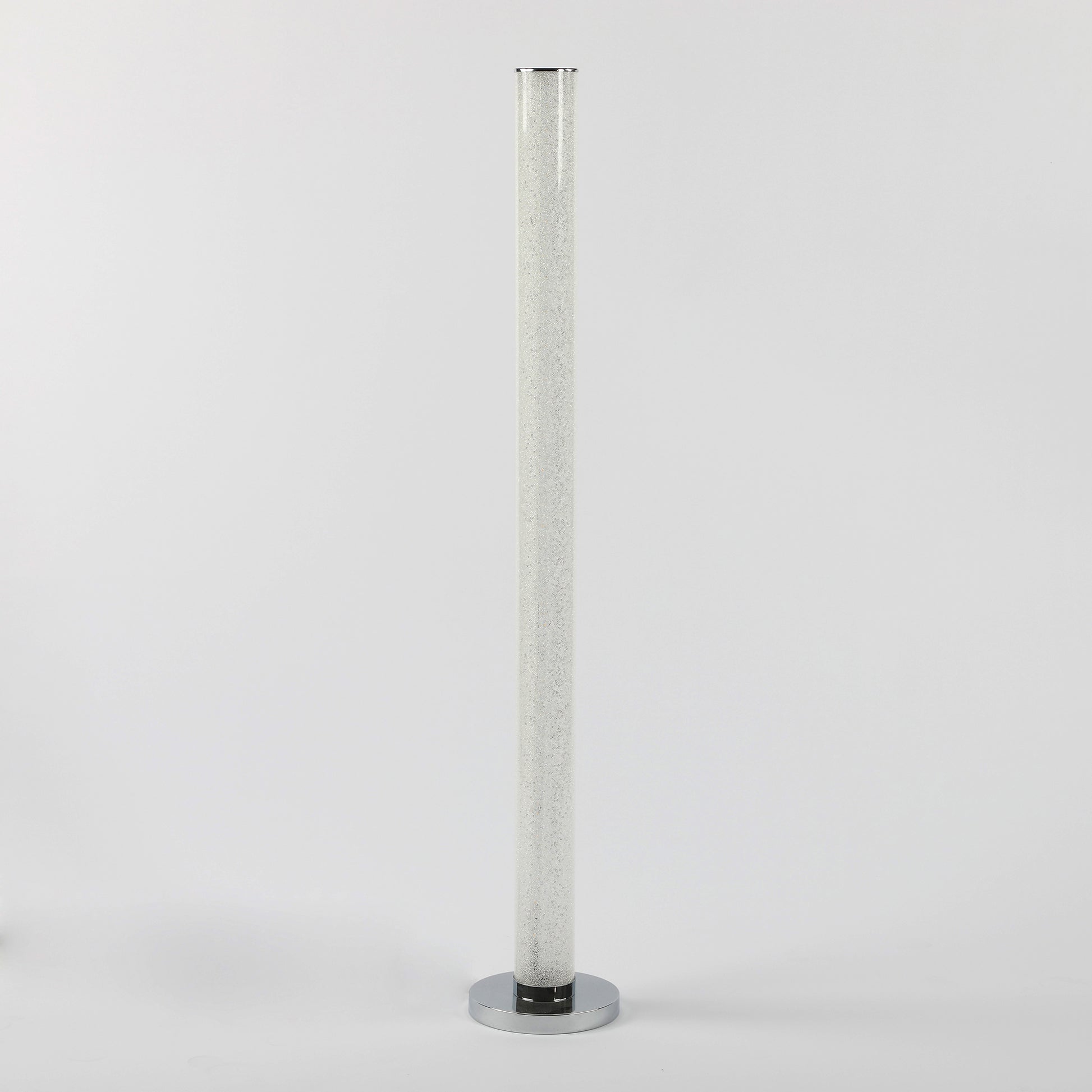 Dynamic lighting designs to accentuate and compliment any space. From conceptualization to reality, Illuminari White Crystal Sandrocks Column Floor Lamp features a shiny Chrome steel base. PET polyester tube diffuser. Provides both direct and indirect light from one LED tower light source. Clear tube is filled with hundreds of white crystal sandrocks surrounding white LEDs, as the lights slowly phase, the sandrocks catch and refract the light for a dazzling effect. When a room calls for understated modernism, this floor lamp answers with the perfect balance of minimalism and statement-making design. The energy-efficient integrated built-in LEDs cast a bright glow from the slim line bar base. Eco-friendly fixture for your home. Serve as great sources of light but is more than attractive enough to be classed as an ornament and could certainly rival the aesthetical appeal of any sculpture you may have on display.