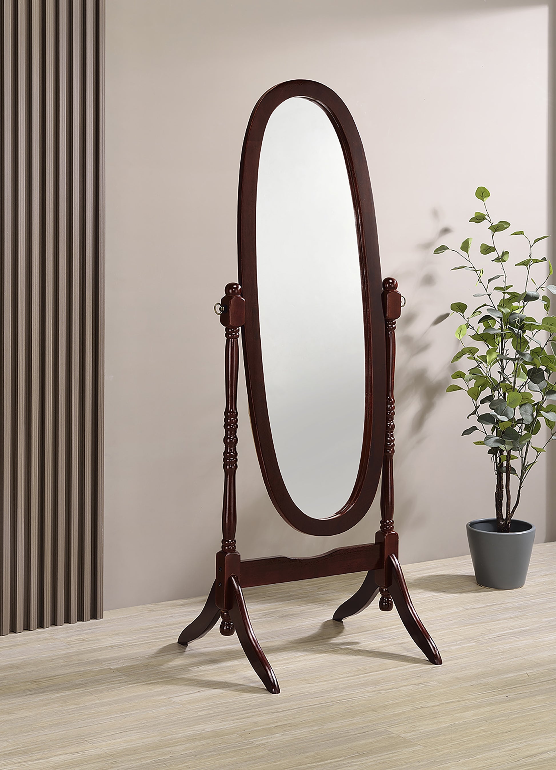 This Smooth-finished Cherry Oval Cheval Standing Mirror will be a fabulous addition to your bedroom or dressing area. Create a peaceful space to get ready for your day or an exciting place to dress for a fun night out. Adjustable Tilt for full Body length free standing cheval mirror stand has an Elongated Oval frame finished in a soft Cherry tone, sleek lines, and a swivel feature to move the mirror around as you wish. Freestanding design swings mirror between stylish turned posts and curved flared Legs; stretcher for stability between legs. Perfect use for young teens and adults. A timeless piece that is ever elegant as you can grab one last look before you head out the door for the day.