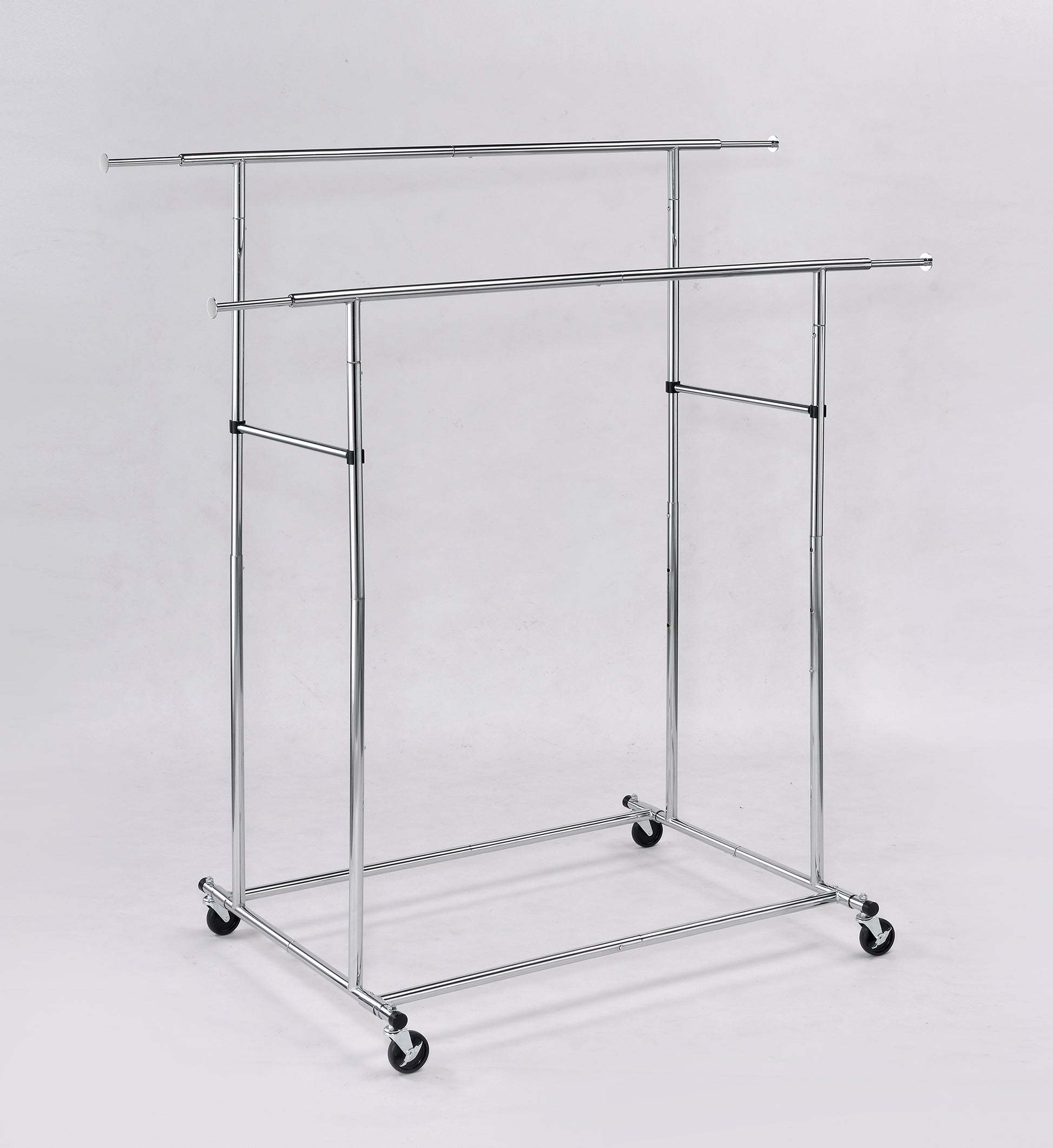 Need more closet space? Use this Dual Bar Adjustable Garment Rack to handle the overflow from too-small closets. Dual Bar Adjustable Garment Rack features over 117" of hanging space. Each end extends giving you an additional 8.25". Each bar is adjustable in height from 55.75" to 61" to 65" H. Constructed of heavy-duty chrome tubular steel. Commercial grade swivel wheels to make moving around easy.