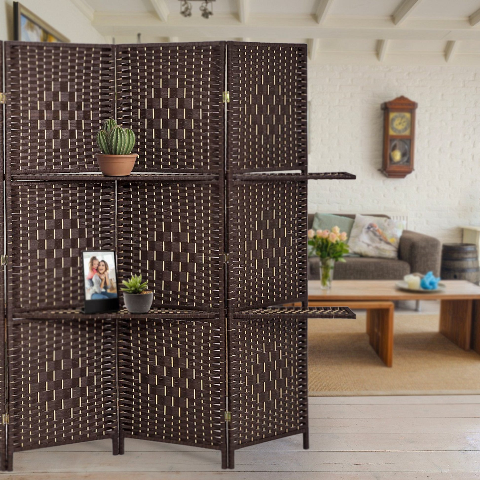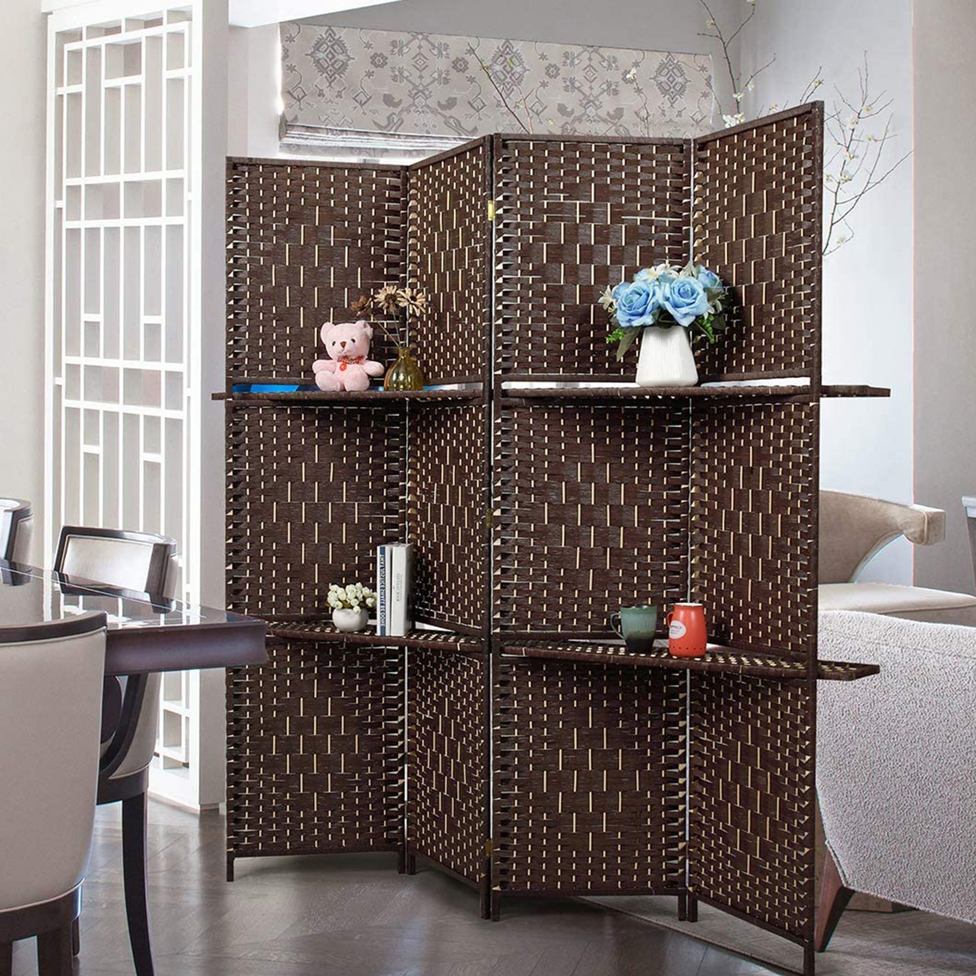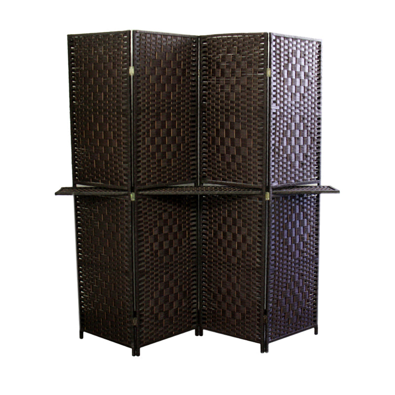 This modern style Espresso finish room divider w/ one shelf enables for individuals to keep a safe zone and to keep privacy from visitor's view. Visually pleasing accent for any room, It will subdivide your space to create a separation from living space to dining space. The Screen can also works as a backdrop for your wall decor. Item is Handcrafted, so screen is skillfully weave by hand process rather than a machine. You will appreciate the flexibility to place, store, or move this 4 Panel room divider with ease. Convenience to fold and put away if not in use.
