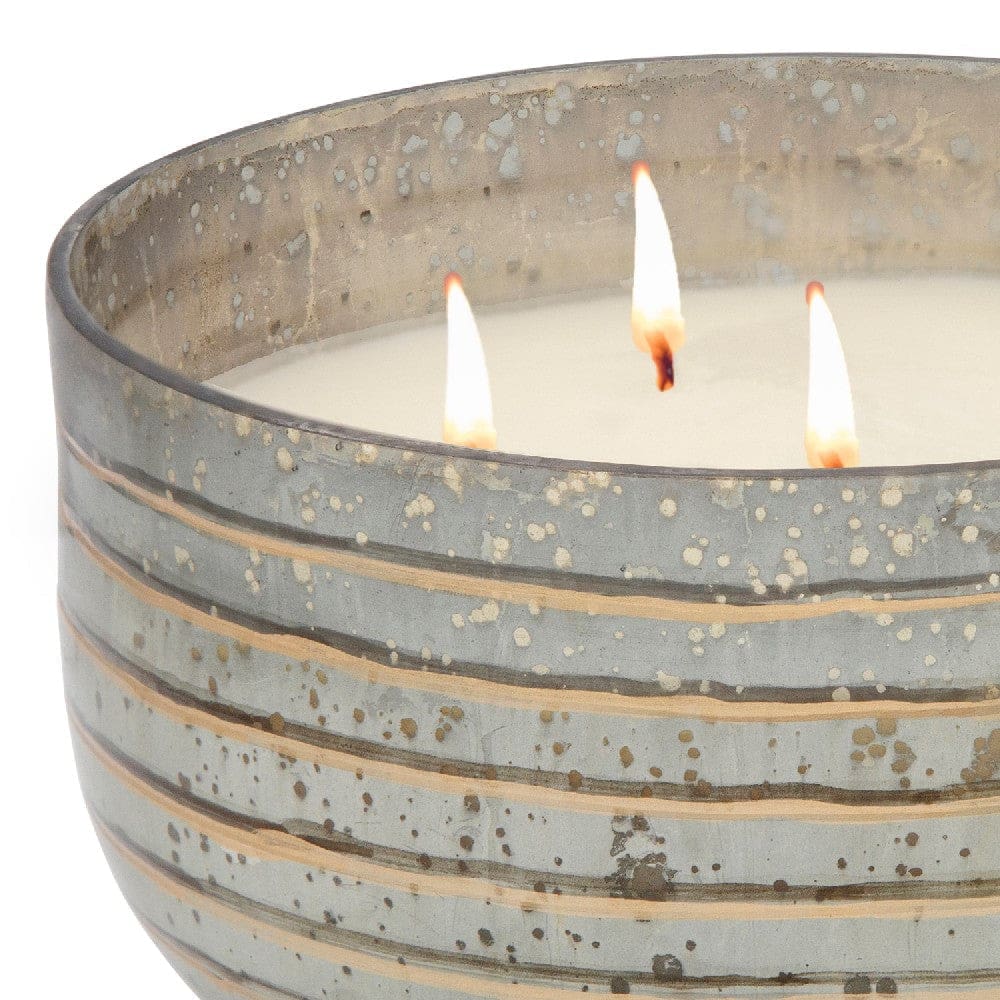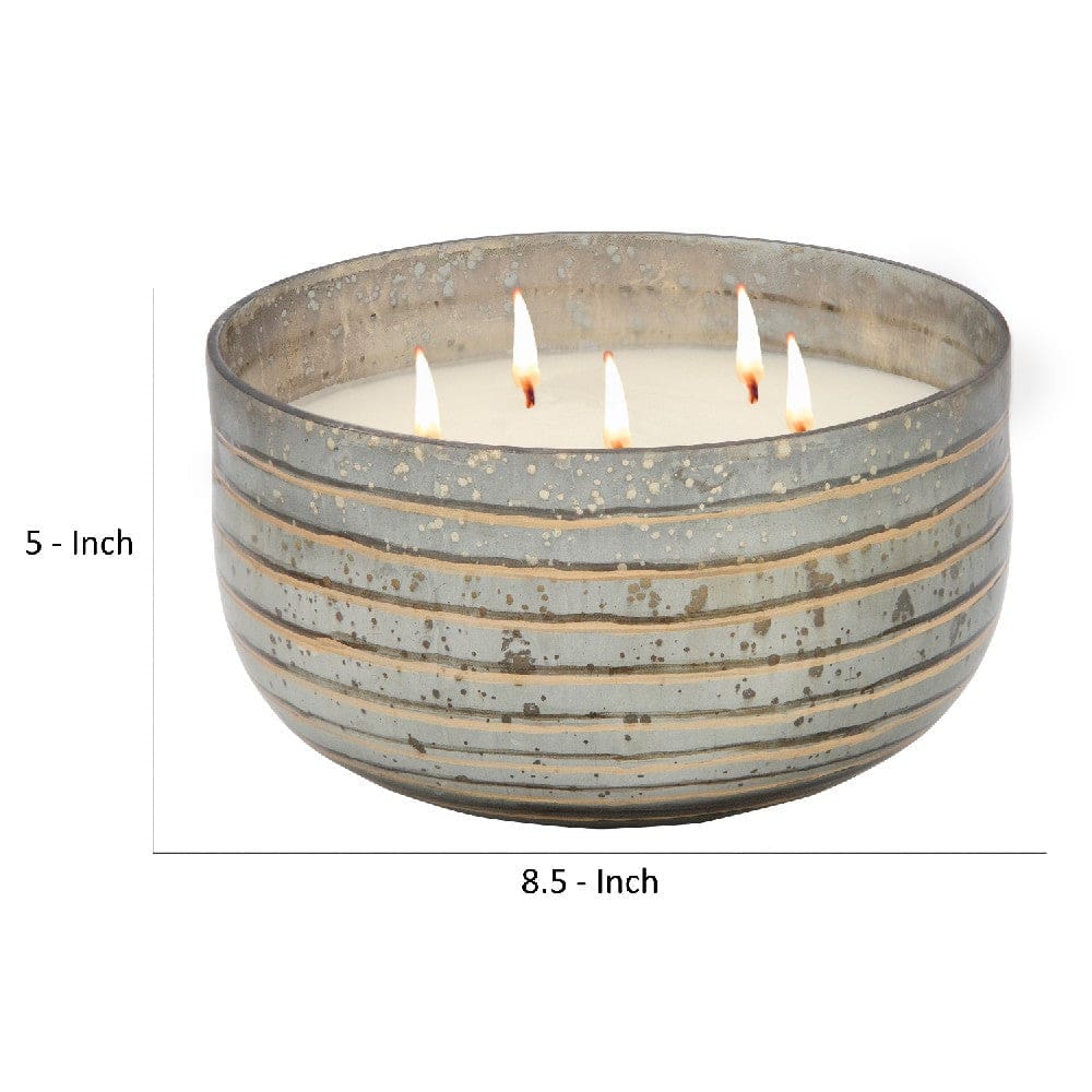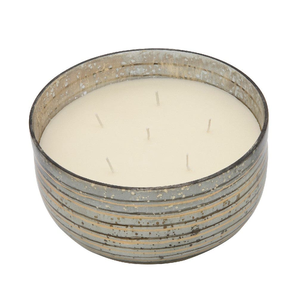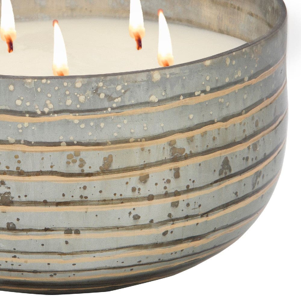 Brighten up any room in your home with this beautiful, unique candle. The candle has six wicks for perfect lighting, while the round bowl shape prevents wax from spillage. The striped pattern and bronze finish are elegant accents to this piece.