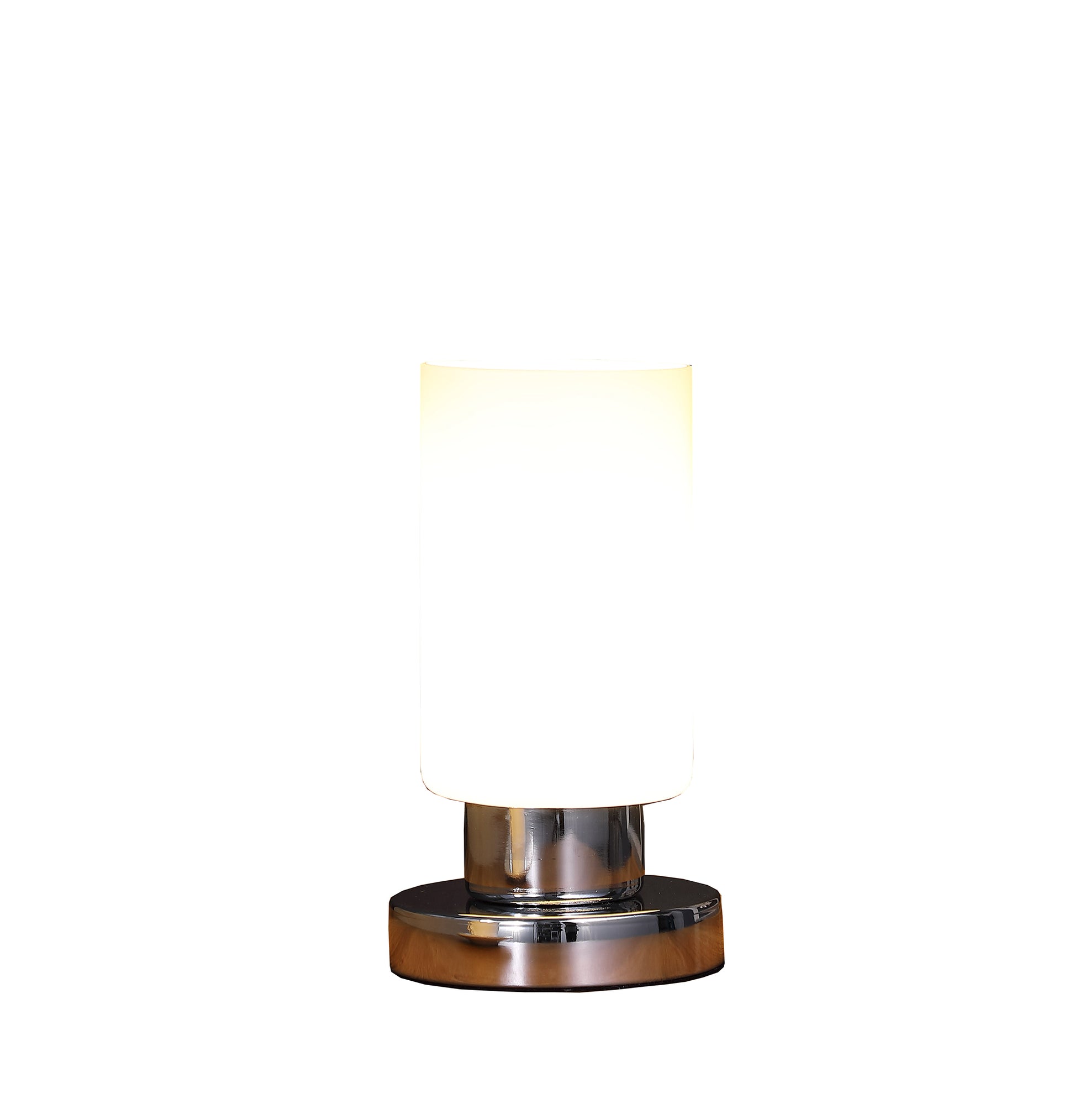 An uplight white glass shade and a smooth brushed nickel finish make this touch console table lamp look dignified and graceful. A small modern uplight table lamp with a frosted white glass shade that creates a beautiful glow when the light is on. This Elli Glass Table Lamp has a stately uplight shade made of glass. With a modern simplistic silver chrome base, the overall effect is a pleasantly modern lamp in a simple, elegant style. Best of all, this is a touch lamp, which means you can turn it on and off with a simple touch. Crafted in chrome metal, this small table lamp will make a beautiful addition to a side table. The frosted glass shade diffuses the light creating soft ambient lighting.