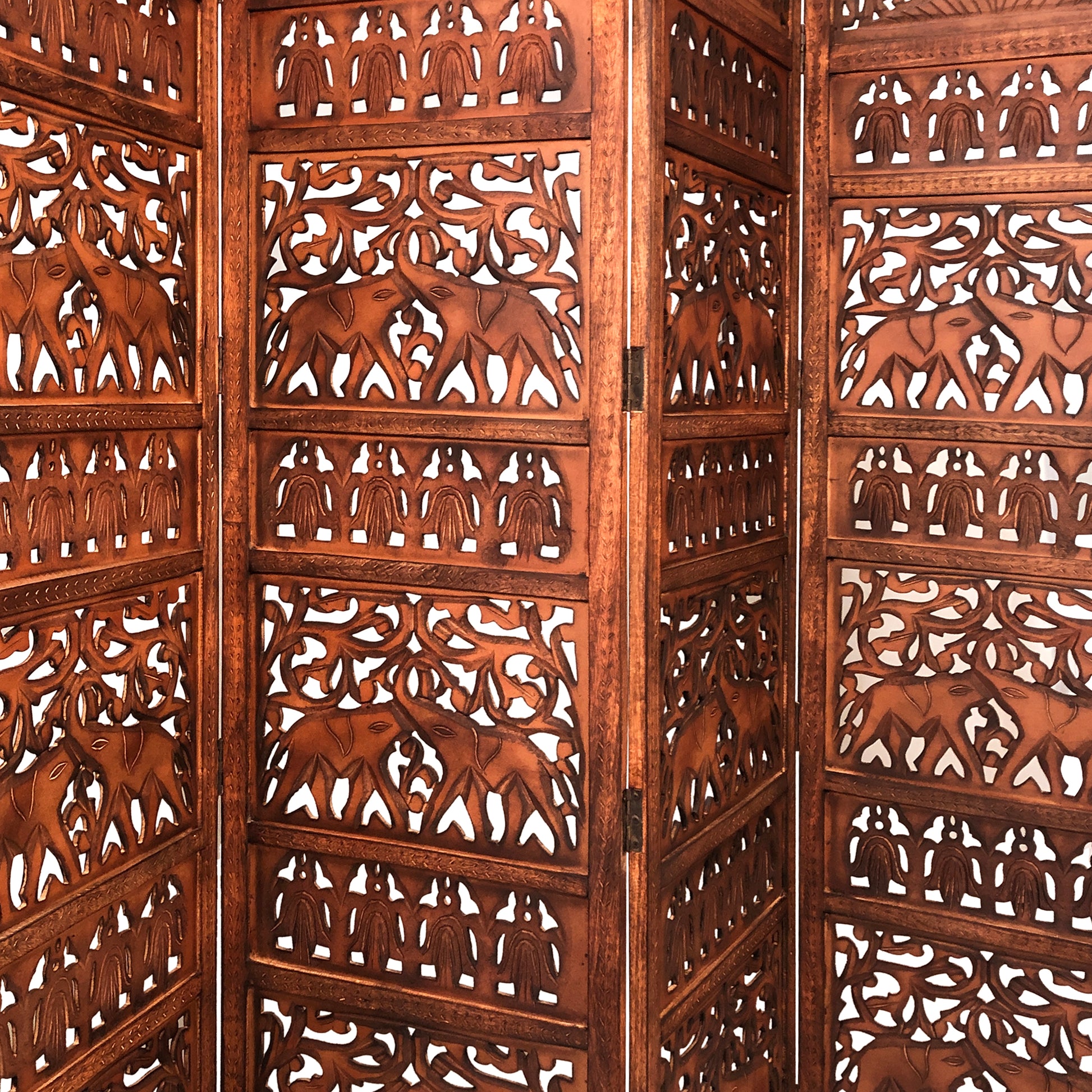 Lightweight, foldable, and easy to store, this expertly handcrafted four panel room divider screen serves a multitude of purposes while showcasing beautiful craftmenship. Whether it is to add a traditional touch to your existing decor or simply to create a partition in any space, this room divider screen will serve you well for years to come. It is made from a combination of mango wood and composite wood that ensures durability, while the natural brown finish lends an appealing, naturalistic touch to the piece. Inspired by traditional style, it showcases intricate cut out details that add to the overall visual appeal while the foldable mechanism makes it highly versatile. Due to the handcrafted nature of the product, there may be a slight variation in color, finish, wood grain and knots.