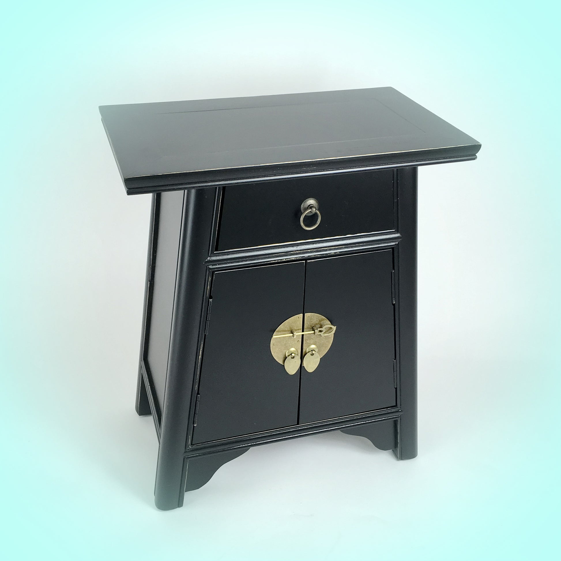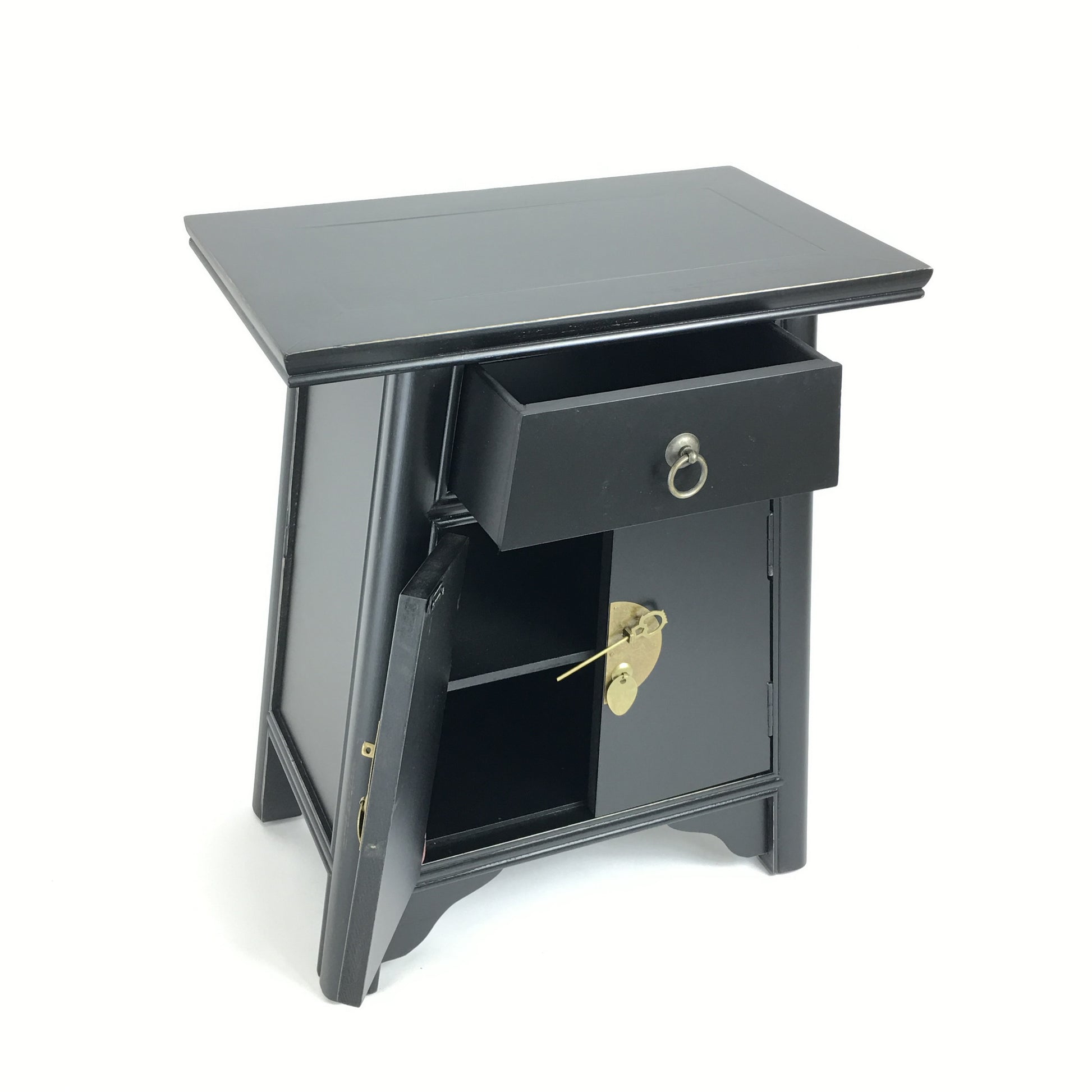 Add this Asian inspired alter cabinet with one functioning drawer as a wonderful conversation piece. The two doors with beautifully polished brass hardware will help keep books, magazines or any miscellaneous items. While the pull out drawer offers an out of sight storage for everything from extra batteries, to candles, to remotes. The delightful piece can bring a stylish worldly feel to your living room, home office or any bed room.